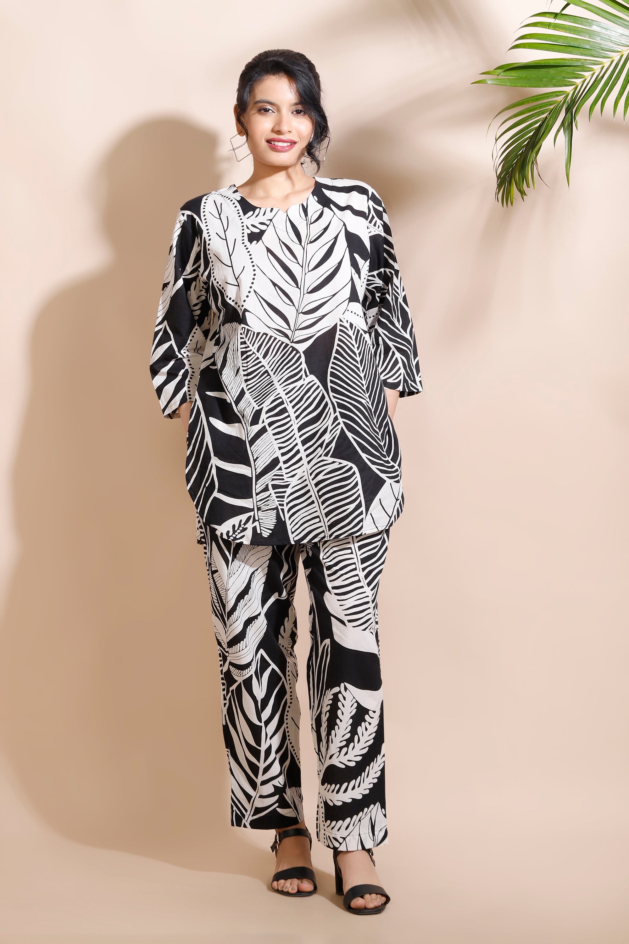 Embrace effortless comfort with this breathable cotton co-ord set from BREATH:ABLES. Featuring a nature-inspired print, this black ensemble includes a hip-length kurta with a round neck and 3/4th sleeves, paired with straight-fit pants. The soft, skin-friendly fabric and relaxed fit make it perfect for lounging, travel, or casual outings. Whether you’re unwinding at home or stepping out, this versatile loungewear set combines style, ease, and nature’s charm in every thread.
