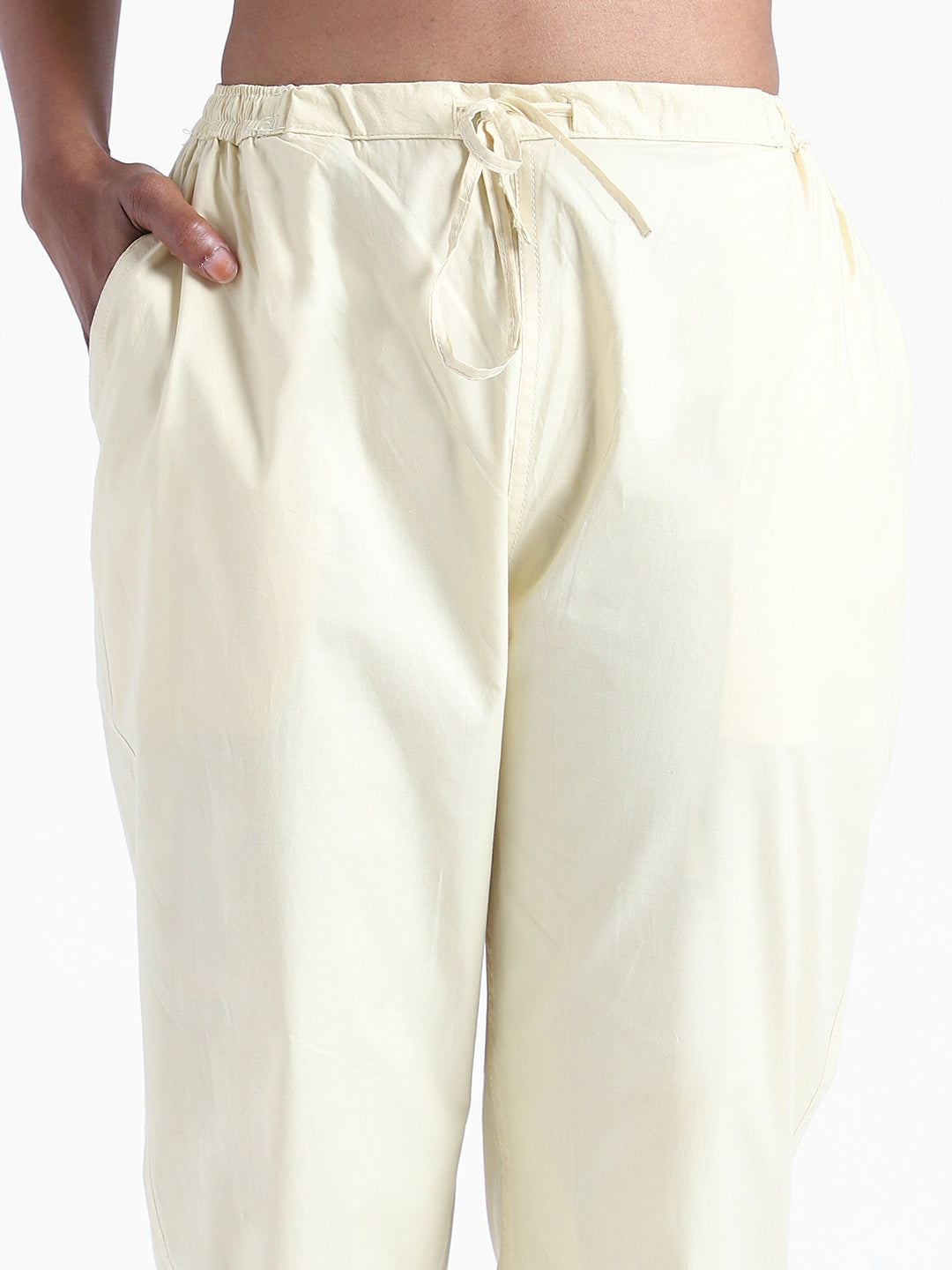 It has an elastic rubber waistband with drawstring closure, slant pockets, mid-rise & a tapered fit. You could pair it up with a Kurti, top, or a tee. They could also be used as night pants since they are comfortable and healthy.