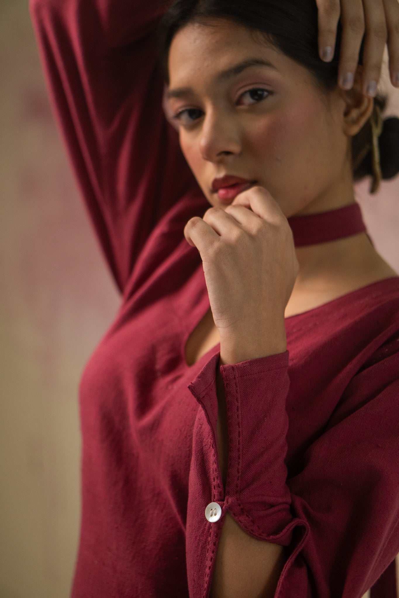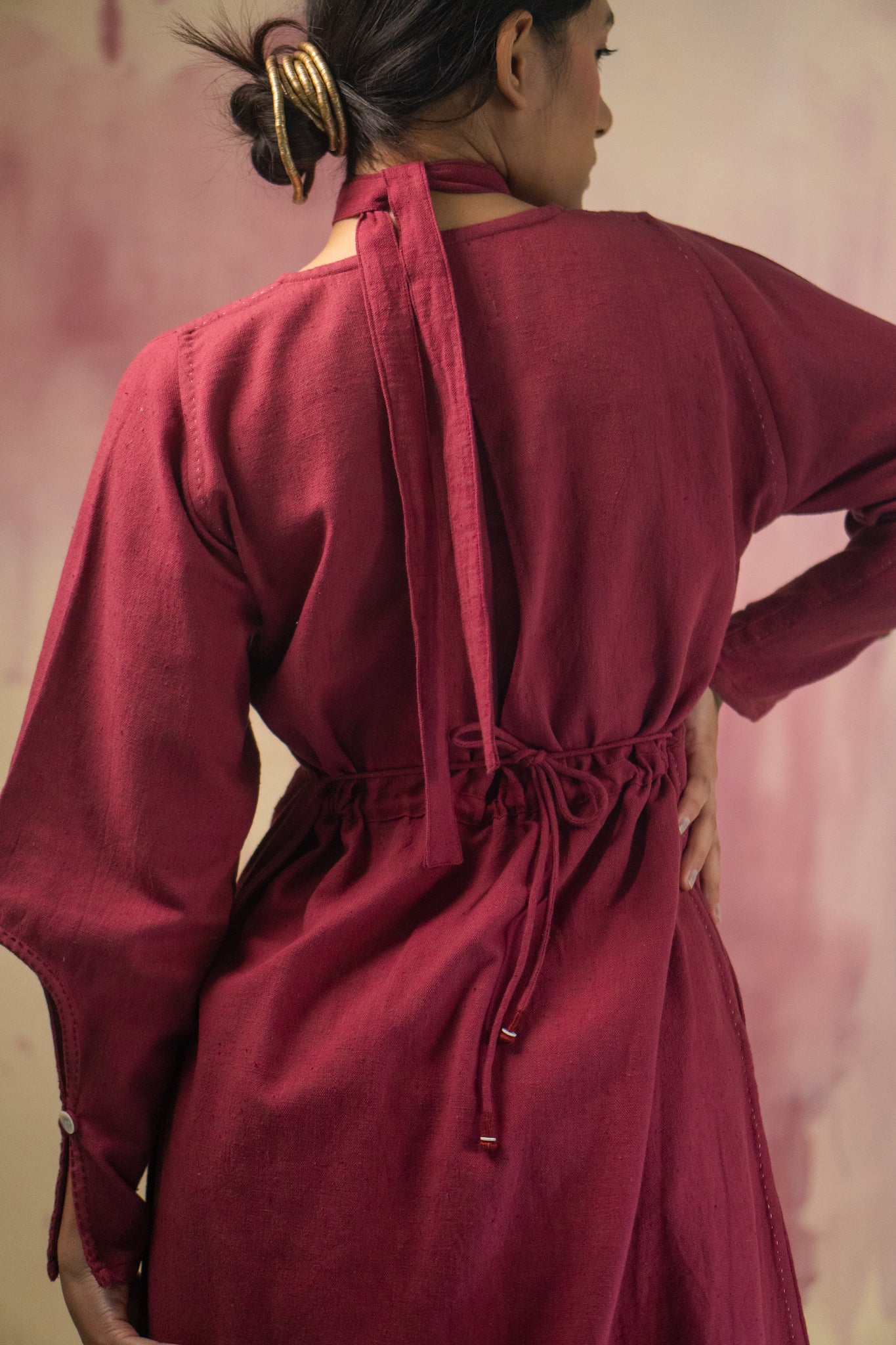 The rich maroon color enhances its allure, while a drawstring at the back cinches and accentuates your body curves, creating elegant gathers.