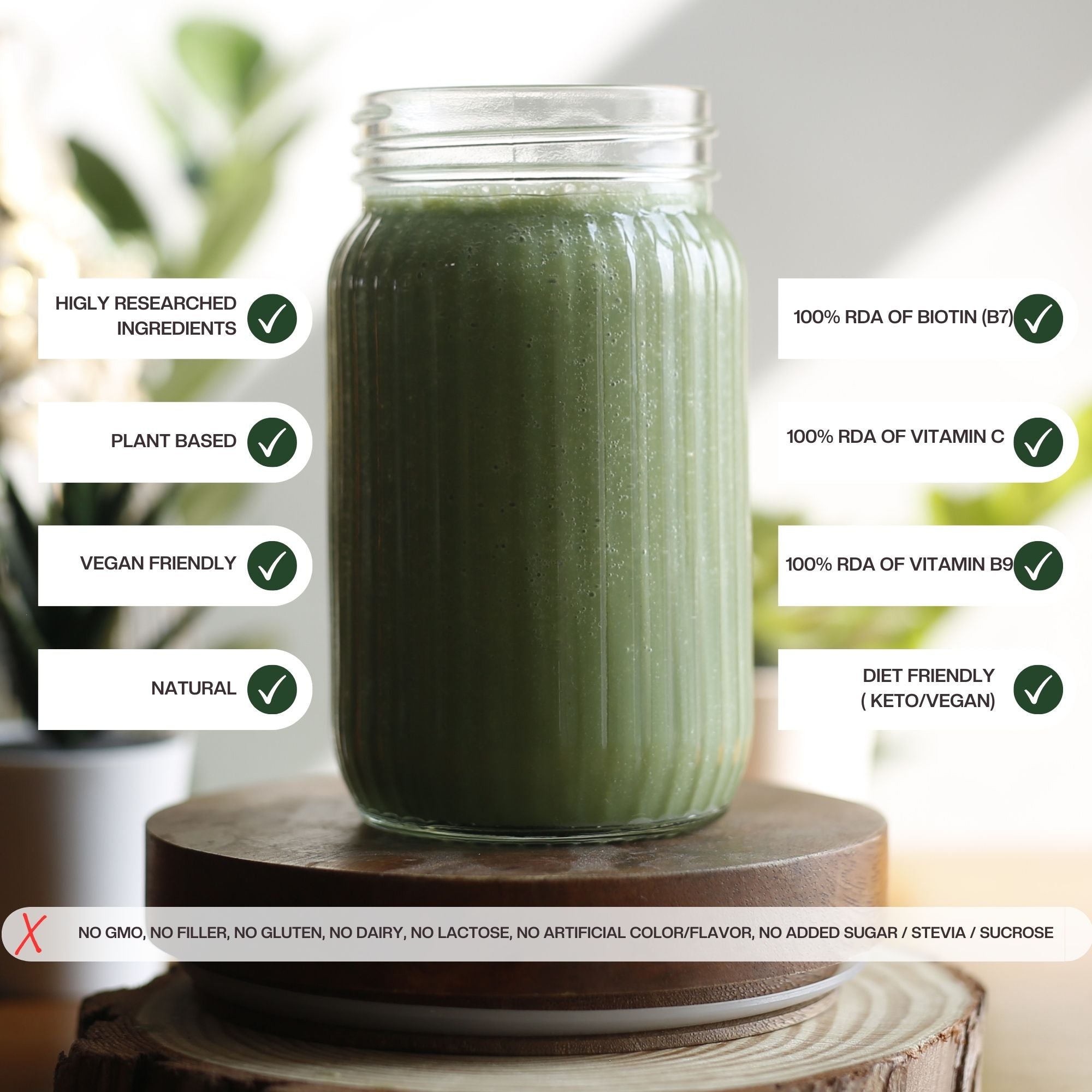 Benefits: Gut Health: Contains probiotics, prebiotics, and digestive enzymes that support healthy digestion and gut flora. Energy Boost: Packed with B-vitamins, spirulina, and green tea extract to naturally enhance energy levels. Immune Support: Ingredients like Vitamin C, Zinc, and antioxidants fortify the immune system. Skin & Hair Health: Biotin and antioxidants help promote radiant skin and stronger hair. Overall Wellness: Provides a comprehensive blend of 55 natural ingredients for balanced daily nutrition.