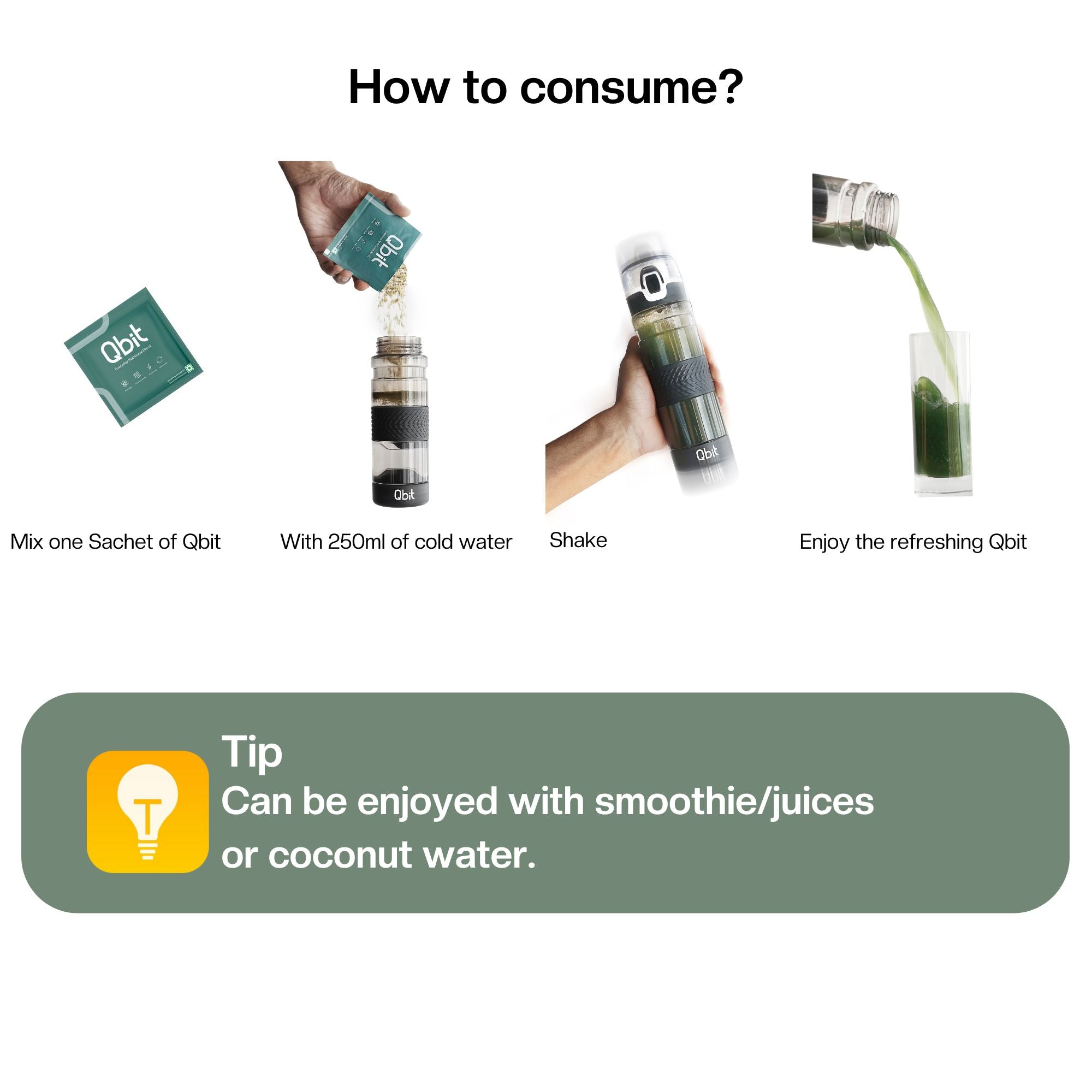 QBIT Gut Health Nutrition Blend. A perfect blend of 55 vitamins, minerals, superfoods, probiotics, and enzymes. Grown by nature, blended by science.