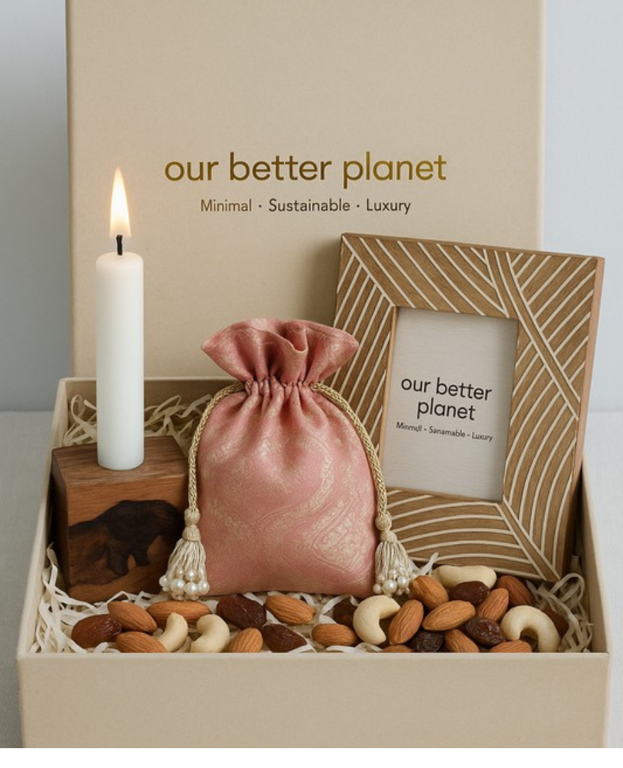 Celebrate health and tradition with OurBetterPlanet’s Radiance & Wellness Set. This hamper combines the richness of dry fruits, elegant décor, and handcrafted artistry for a wholesome festive gift.