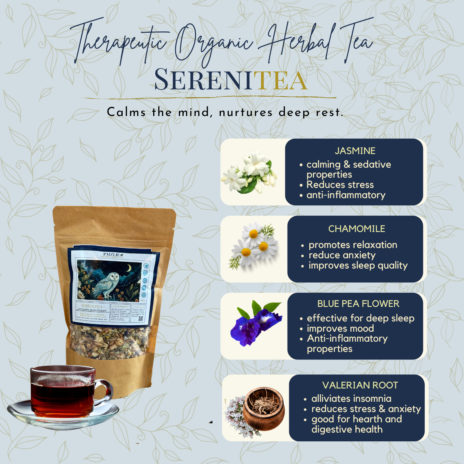 Unveil the secret to a serene night's sleep with "SereniTea," our meticulously crafted organic tea blend. Infused with a harmonious mix of jasmine, chamomile, blue pea flower, and valerian root, this tea is your perfect nighttime companion, designed to soothe your senses and encourage deep, restful sleep.