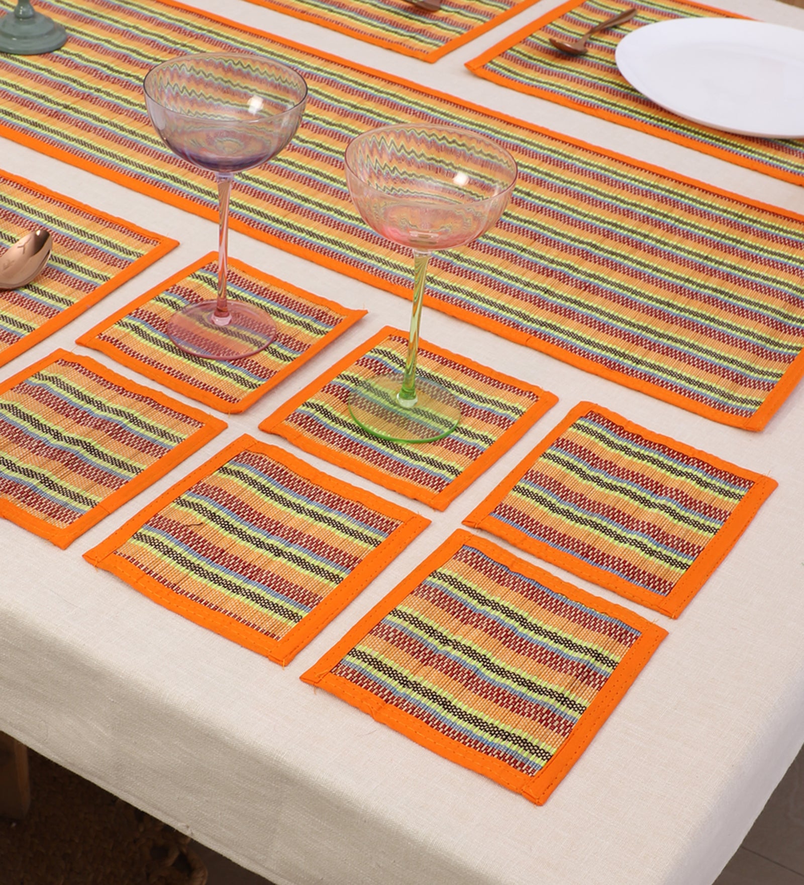 Bamboo Dining Mats Set in vibrant Orange, a stunning addition to your home decor and table settings! Bring warmth and sophistication to your table decor. Elevate your dining experience with the natural charm and artistry of these handmade bamboo dining mats.