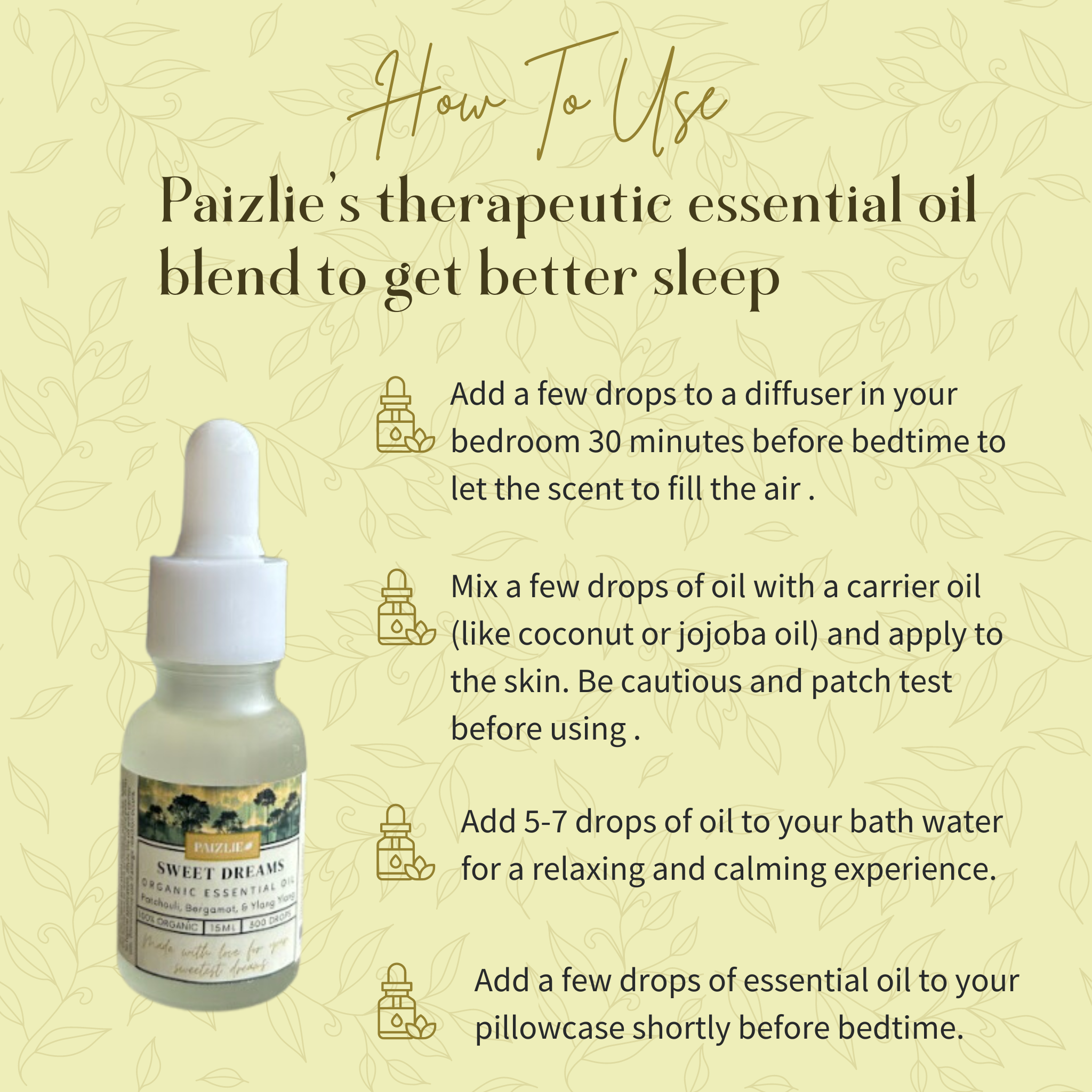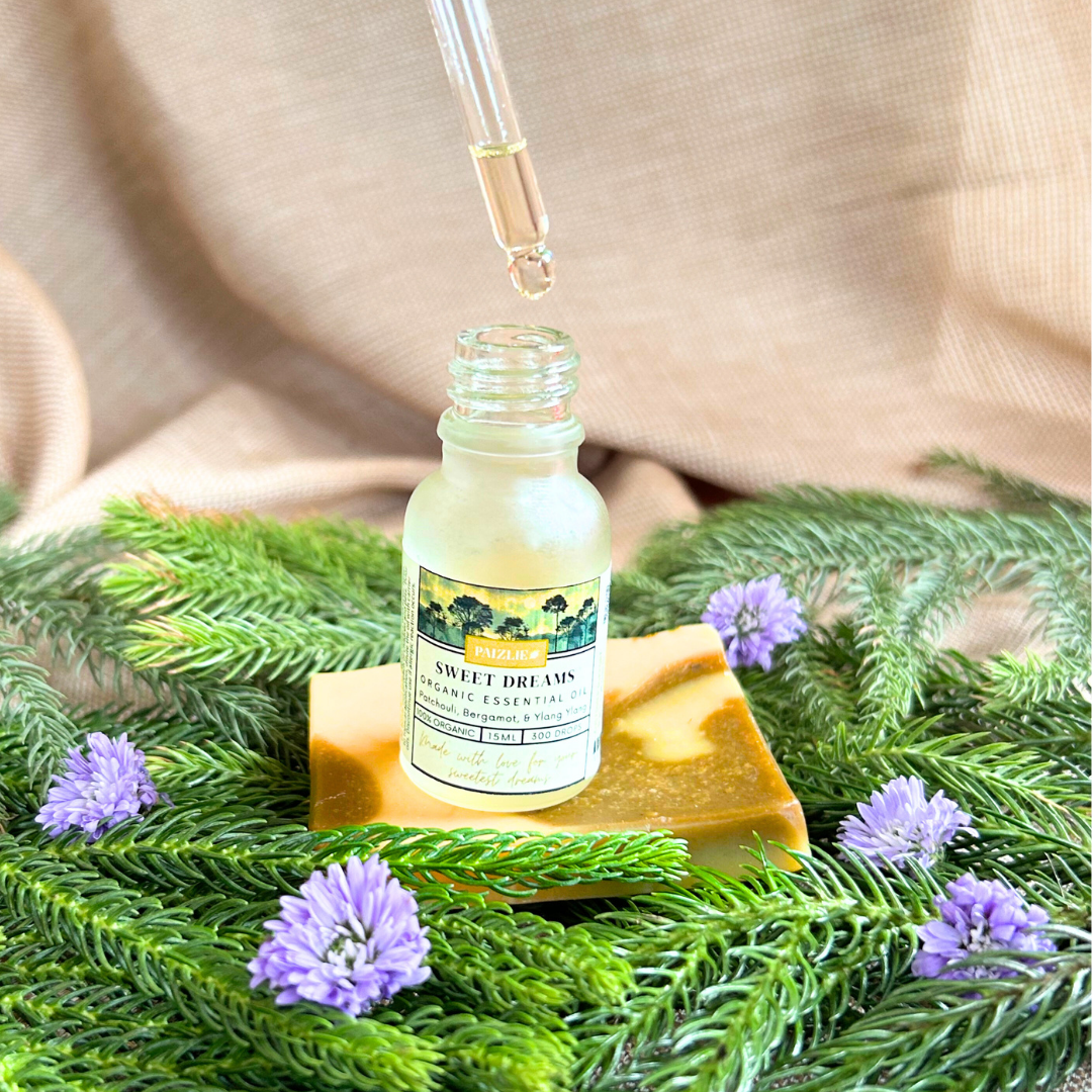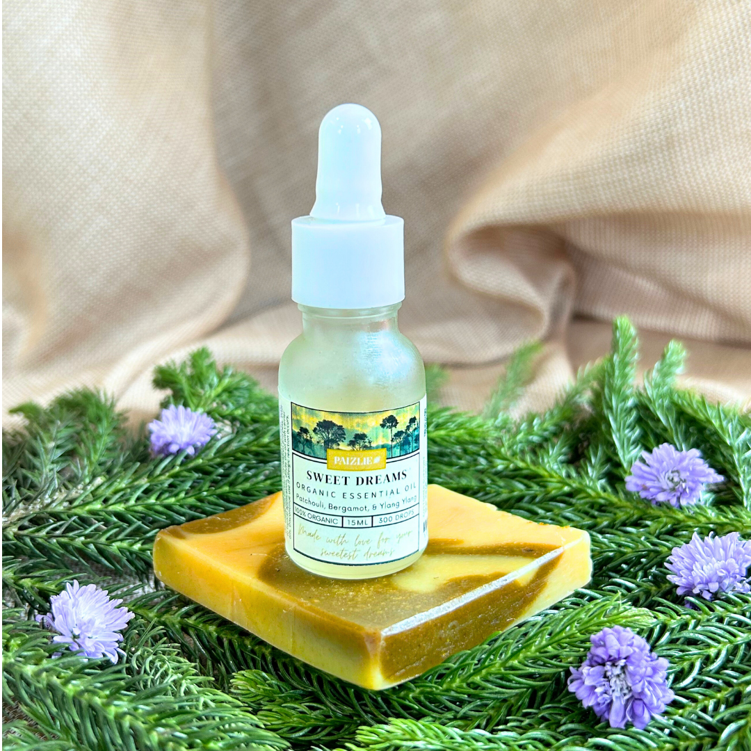 Drift into a restful night with "Sweet Dreams," a luxurious organic essential oil blend thoughtfully curated to promote relaxation and enhance sleep quality. Combining the calming essence of Bergamot, the grounding aroma of Patchouli, and the soothing properties of Ylang Ylang, this blend is your perfect nighttime companion.