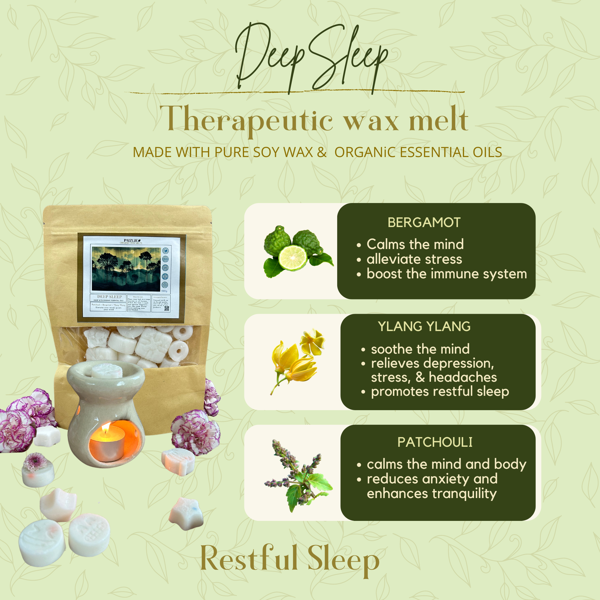 Welcome to the soothing world of "Sweet Dreams," our specially crafted wax melts designed to transport you into a state of deep relaxation and peaceful slumber. Made with pure organic essential oils, these wax melts release a gentle fragrance that clears the mind and nurtures deep rest.