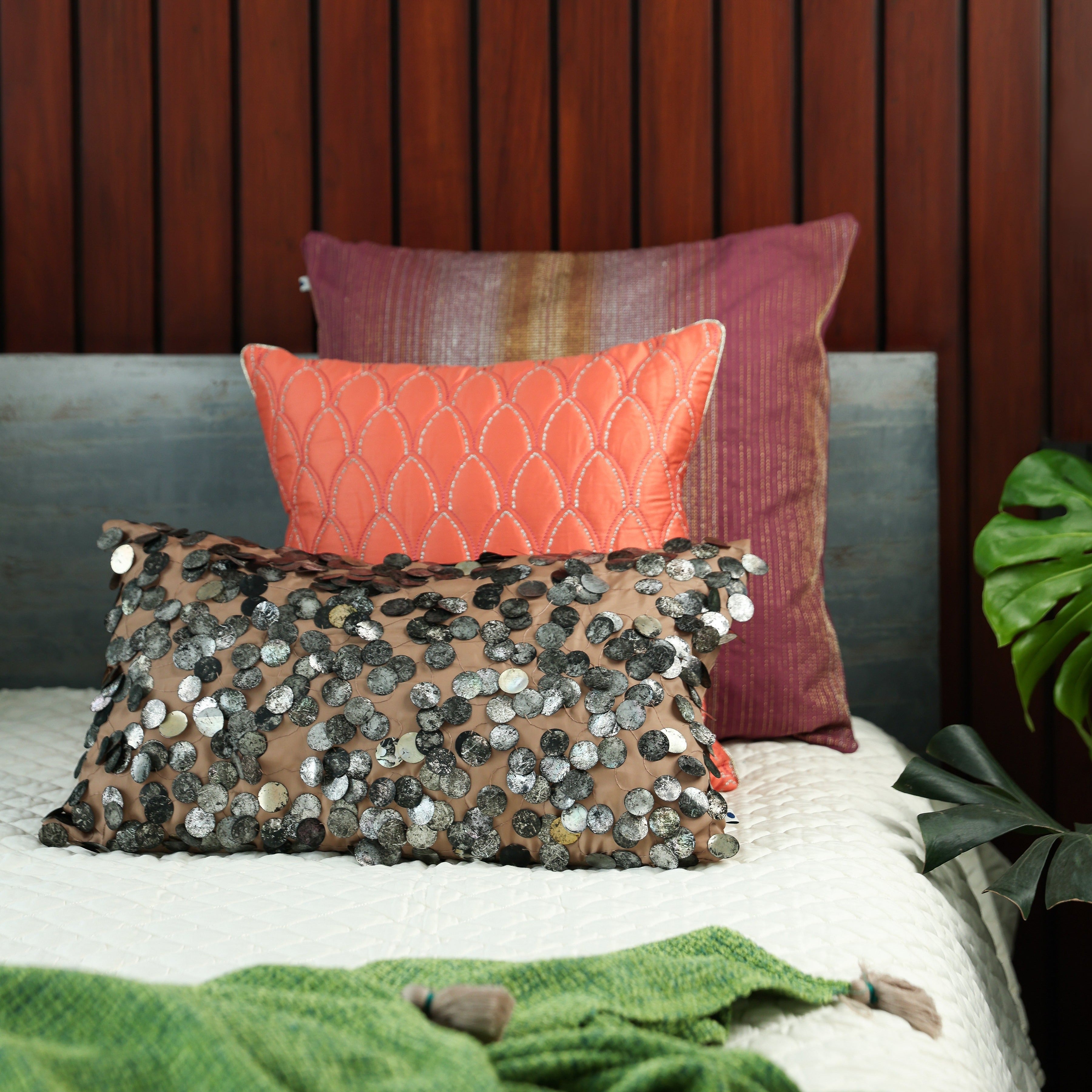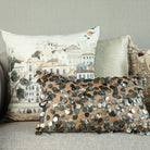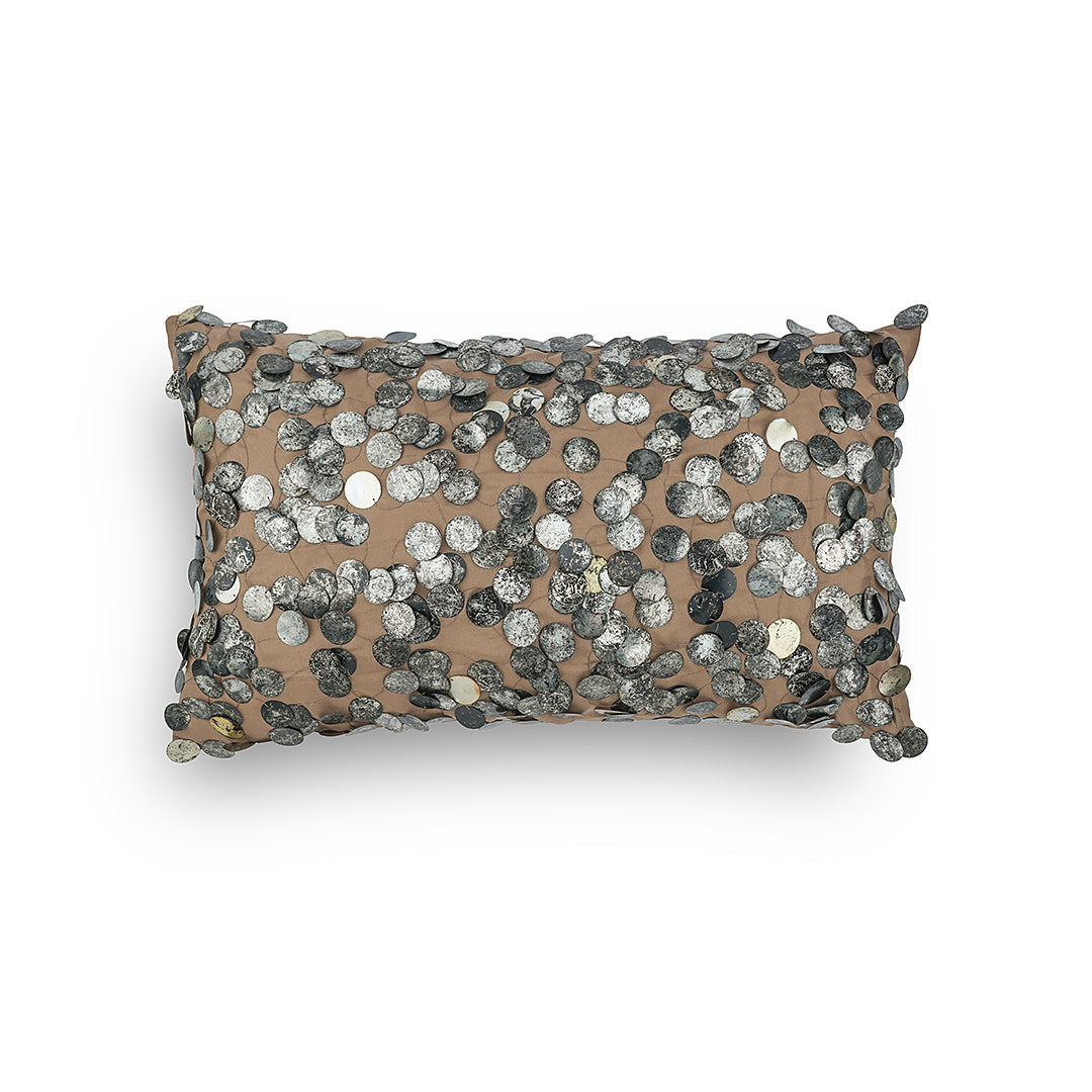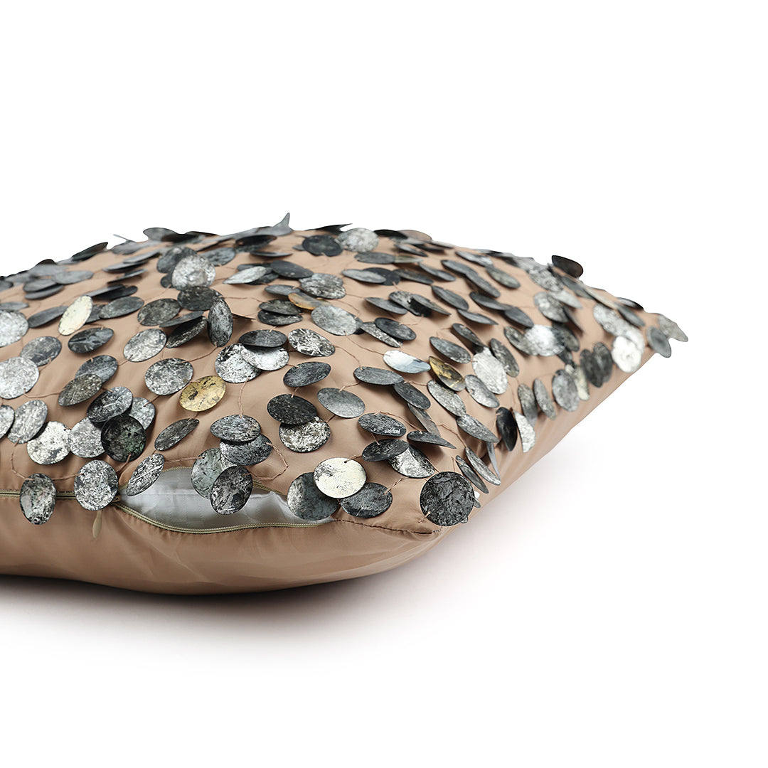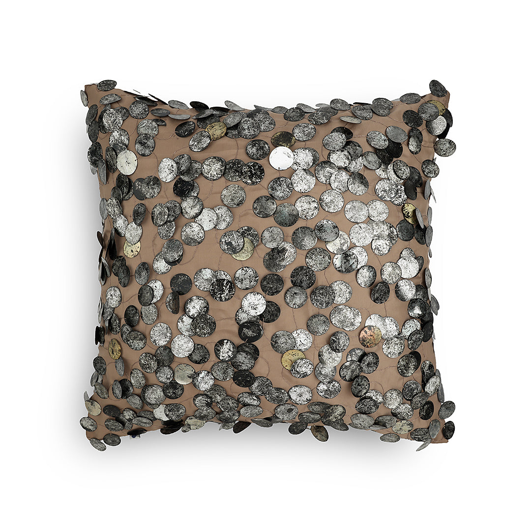This exquisite cushion is adorned with tarnished sequins, delicately embroidered onto a lustrous, silky beige fabric. The interplay of textures creates a captivating visual contrast, making it a luxurious statement piece that adds opulence to any space. The deep turquoise colours in this off set by the gold and silver sequins, add the perfect luxe in your setting