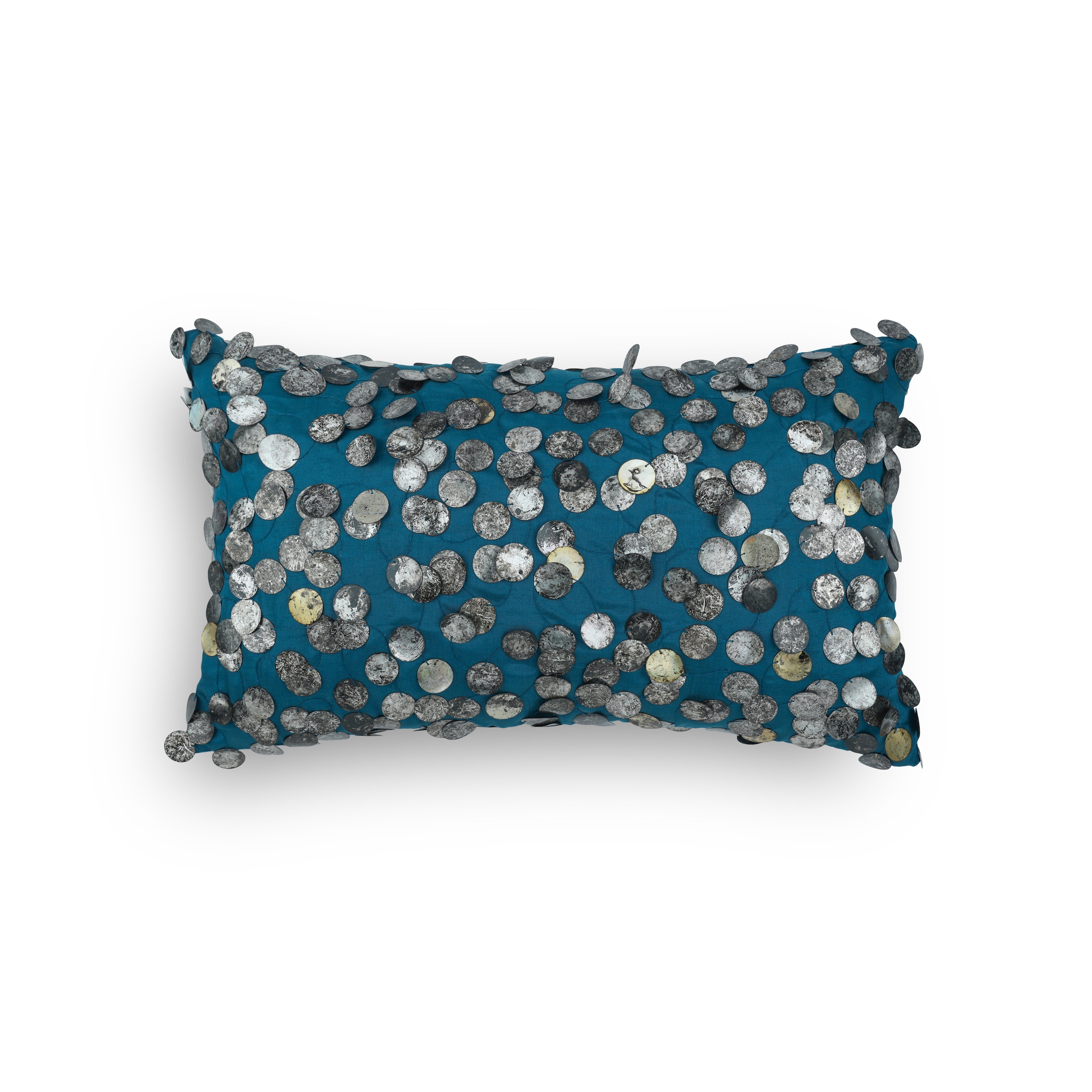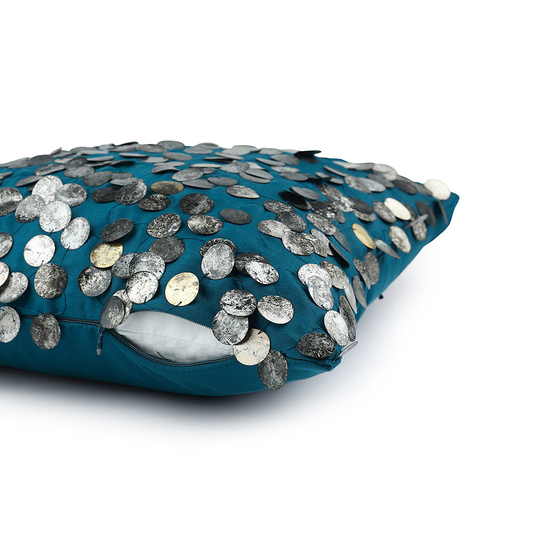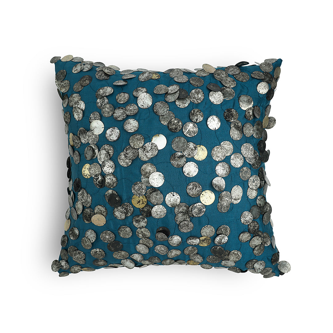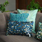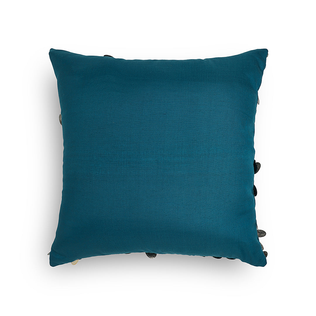 This exquisite cushion is adorned with tarnished sequins, delicately embroidered onto a lustrous, silky blue fabric. The interplay of textures creates a captivating visual contrast, making it a luxurious statement piece that adds opulence to any space. The deep turquoise colours in this off set by the gold and silver sequins, add the perfect luxe to your setting.