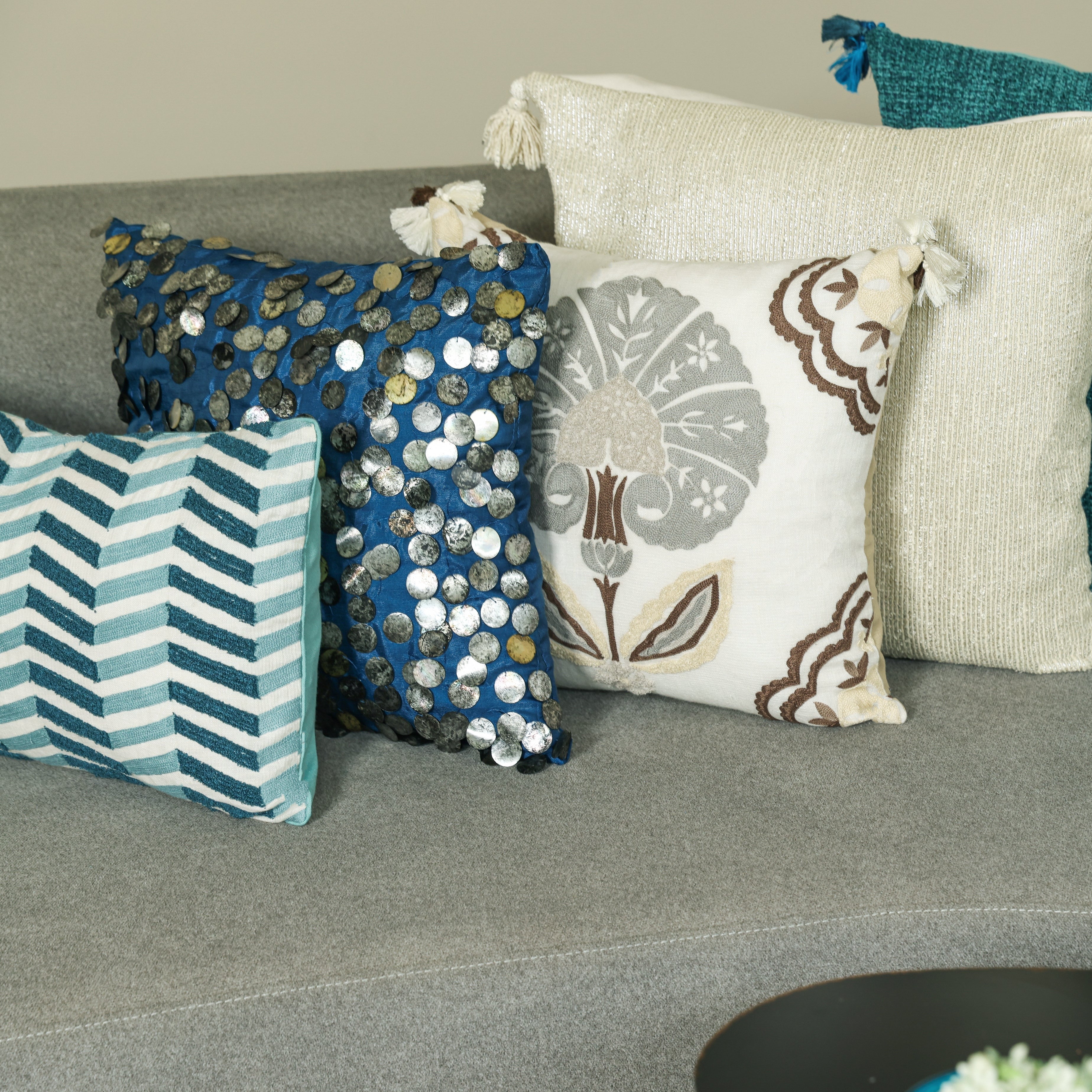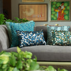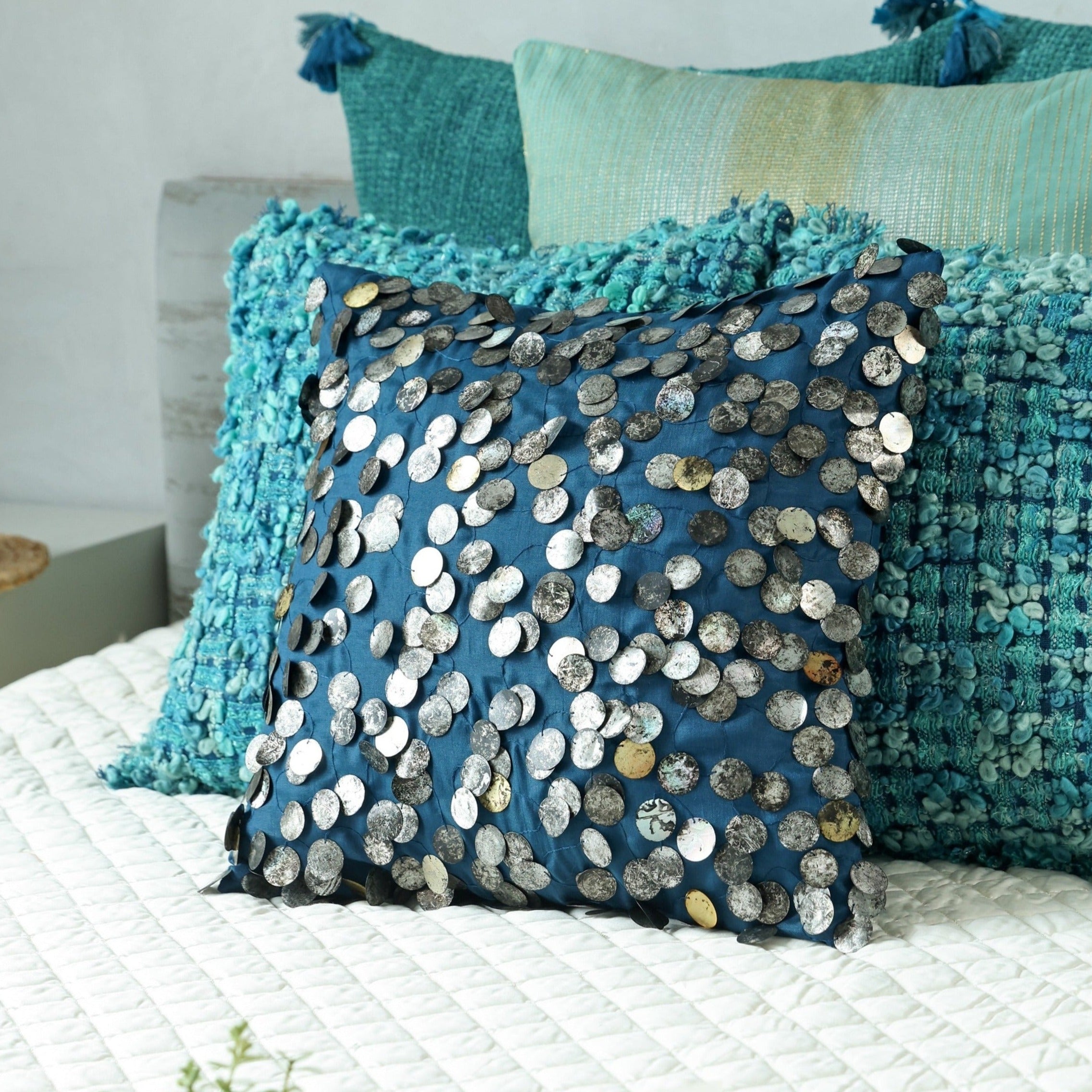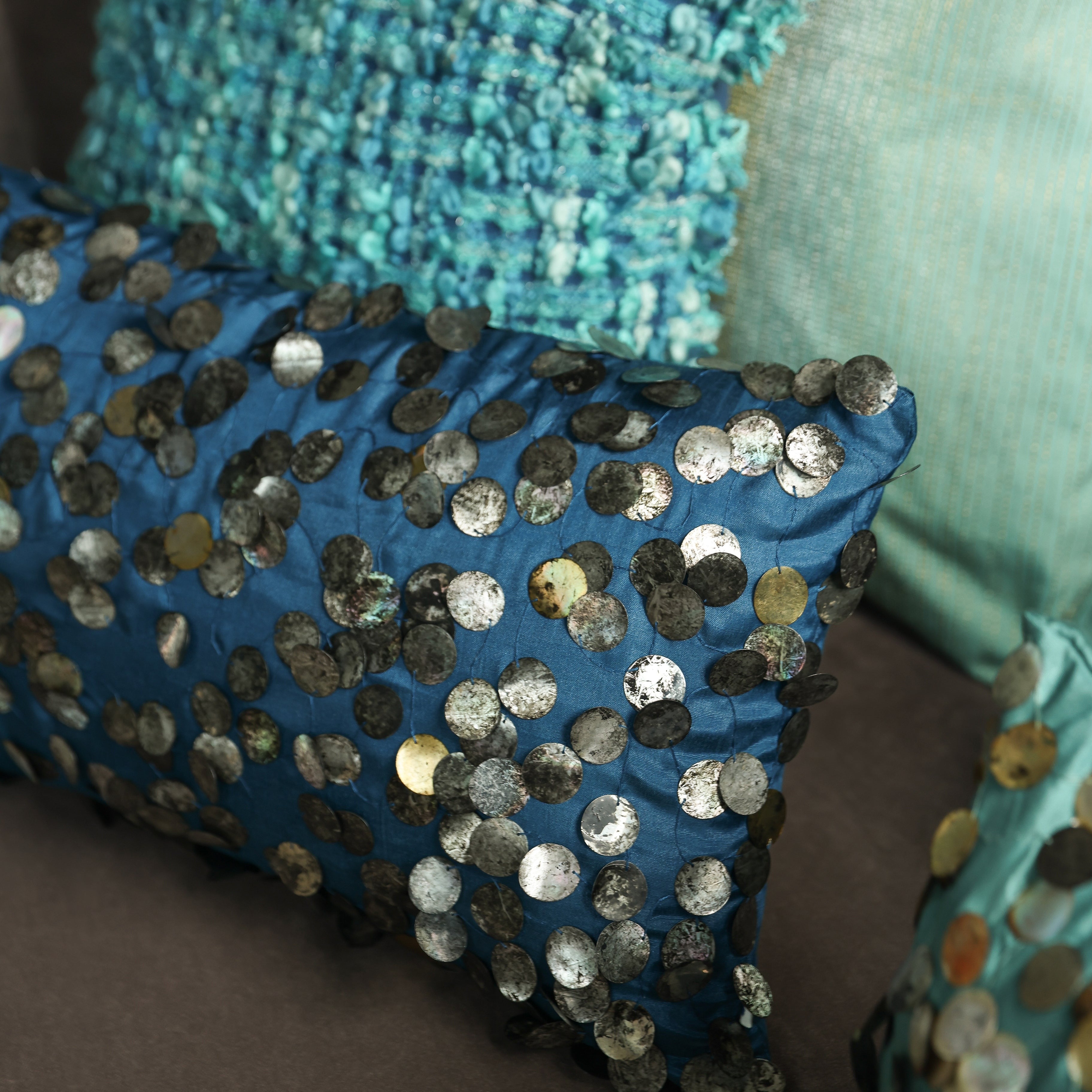 This exquisite cushion is adorned with tarnished sequins, delicately embroidered onto a lustrous, silky blue fabric. The interplay of textures creates a captivating visual contrast, making it a luxurious statement piece that adds opulence to any space. The deep turquoise colours in this off set by the gold and silver sequins, add the perfect luxe to your setting.