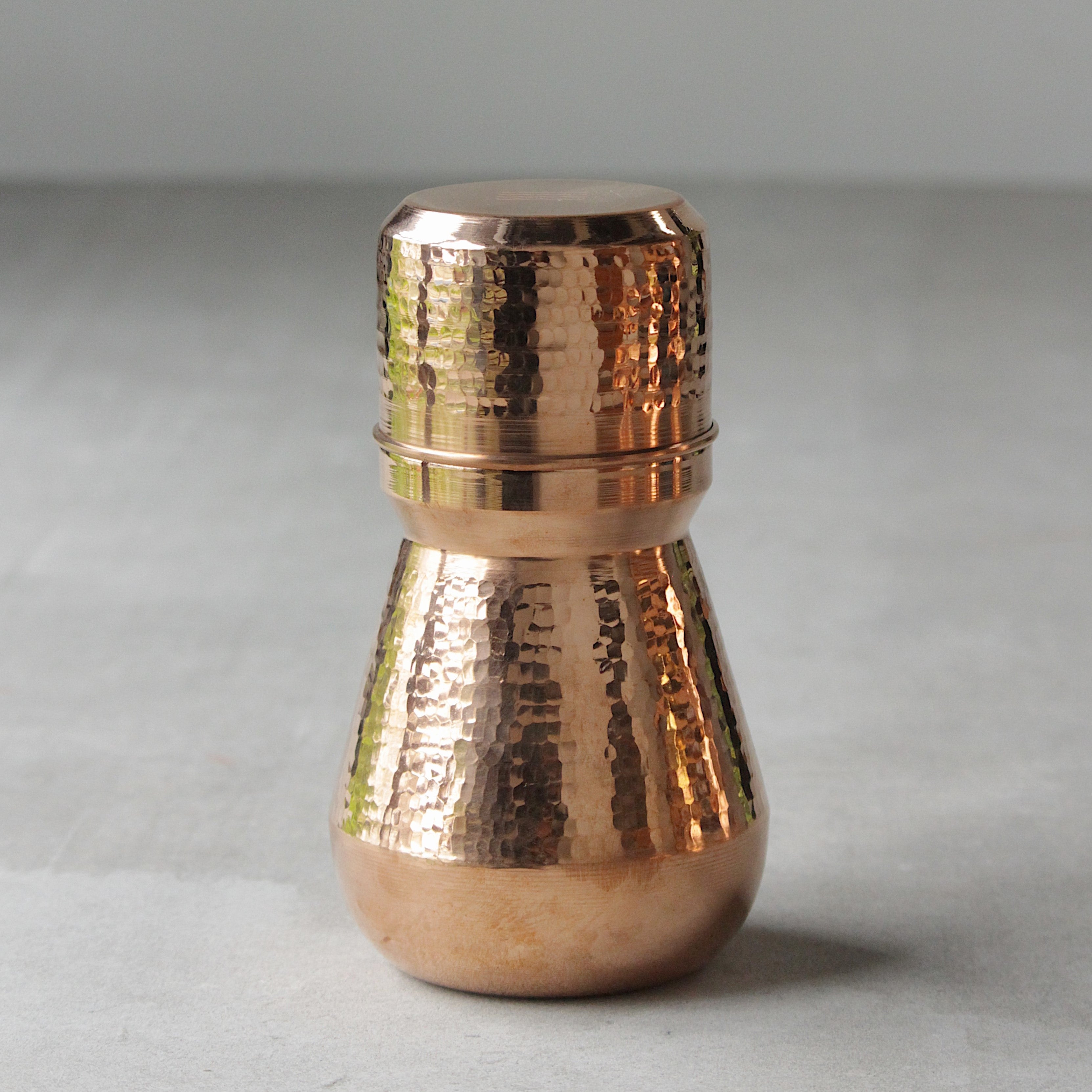 Wash and rinse daily or before use, using a soft sponge and mild detergent or metal cleaning agent. Wipe dry immediately after rinsing to prevent water stains and maintain a lustrous appearance. Use the carafe to store only water as it may be unsafe to expose copper to other fluids.