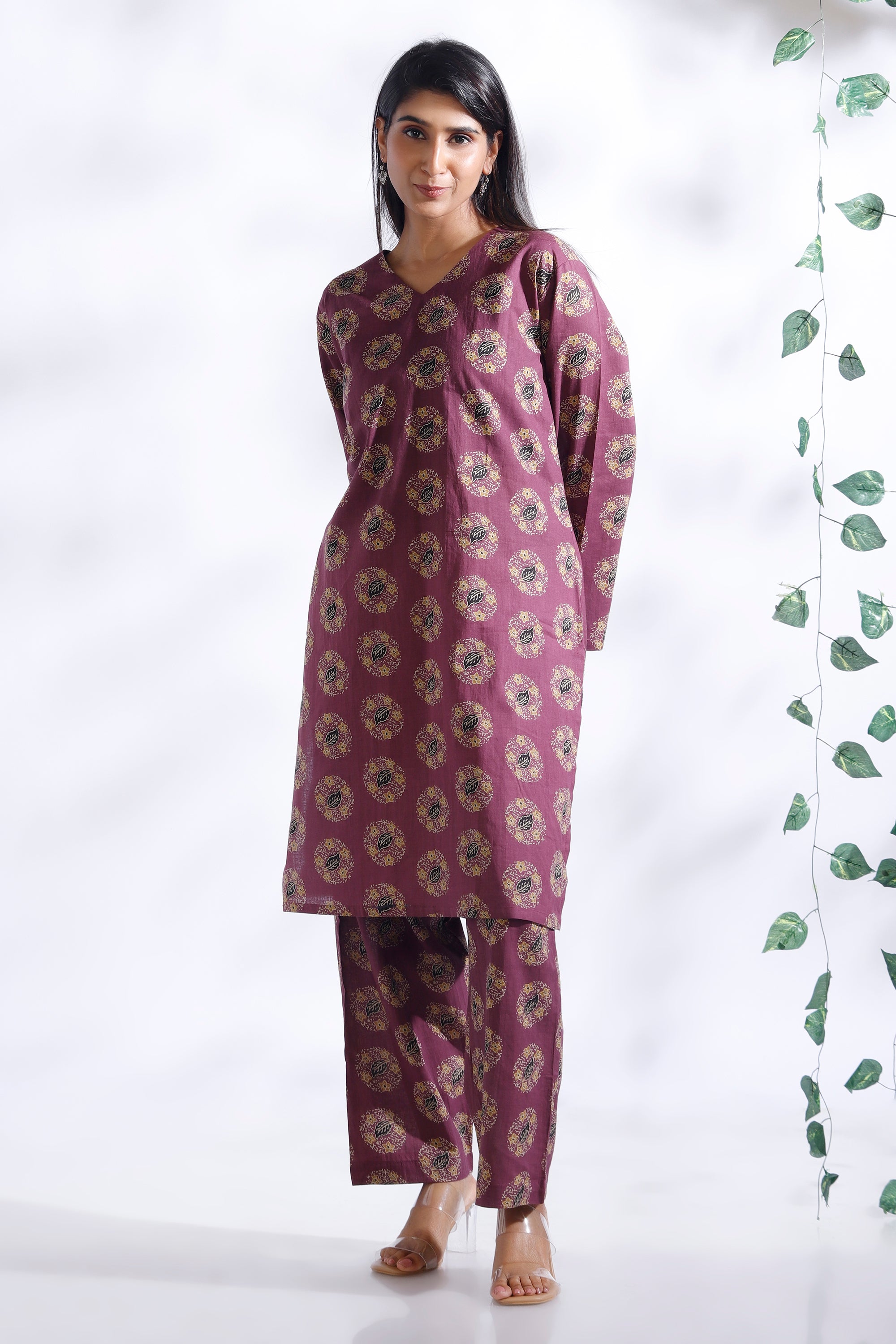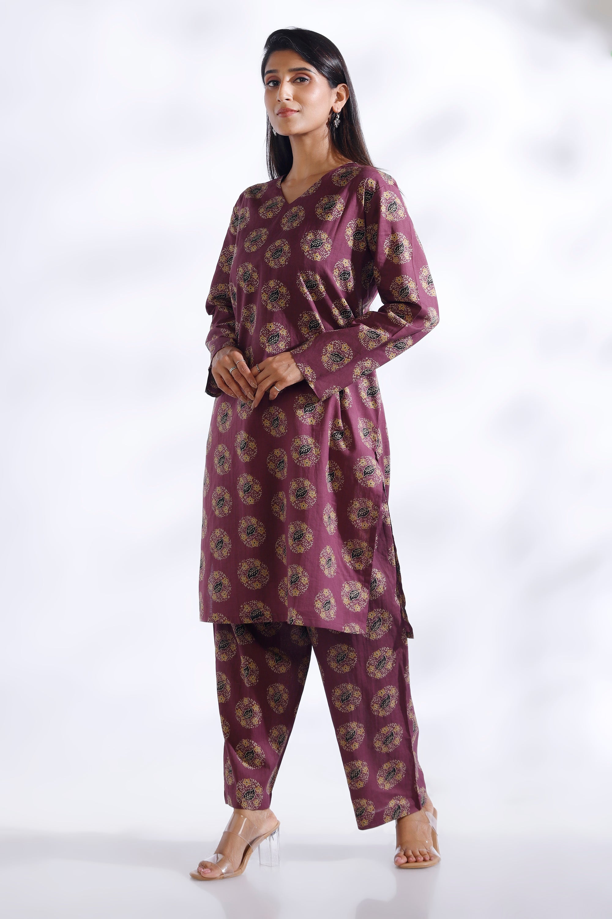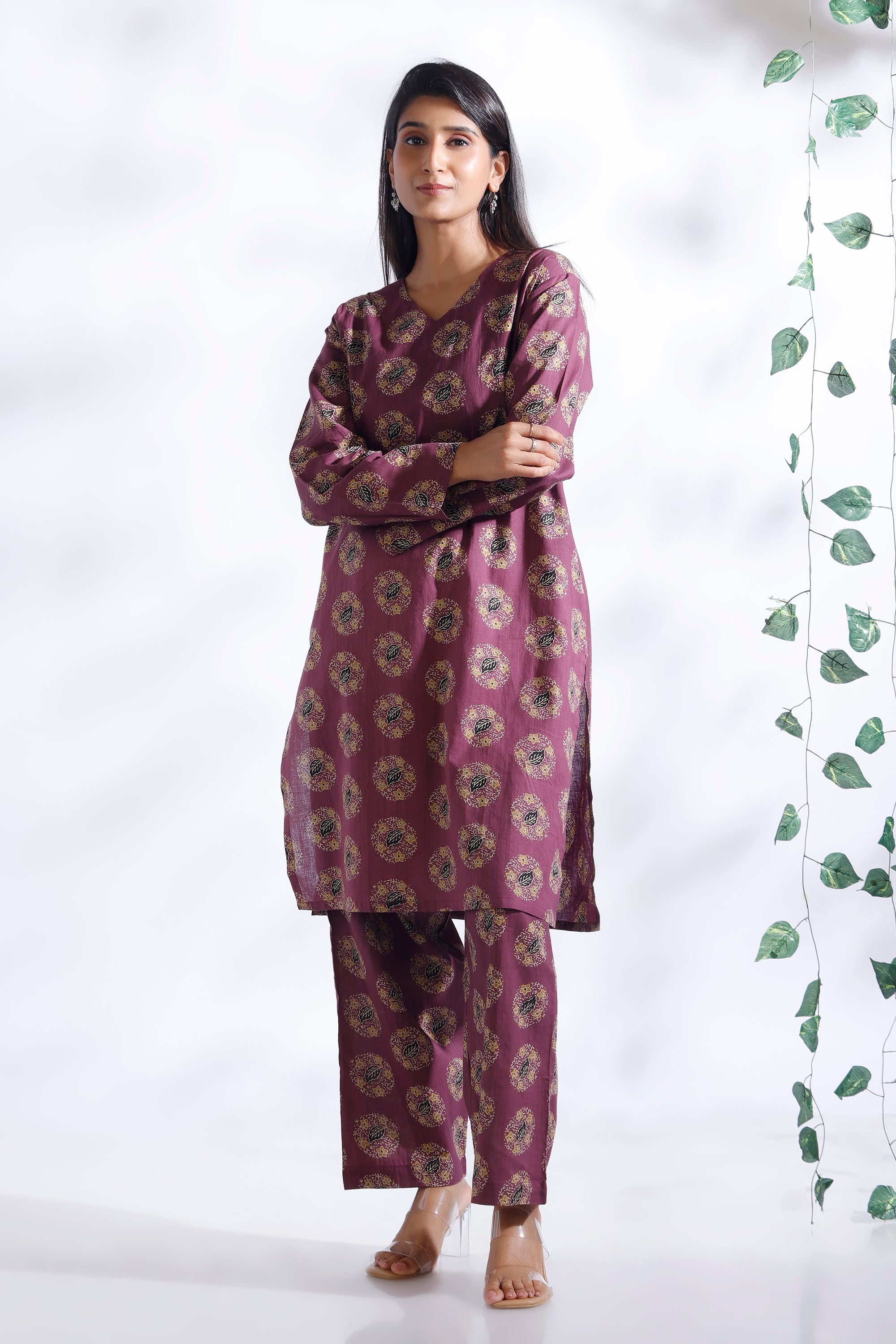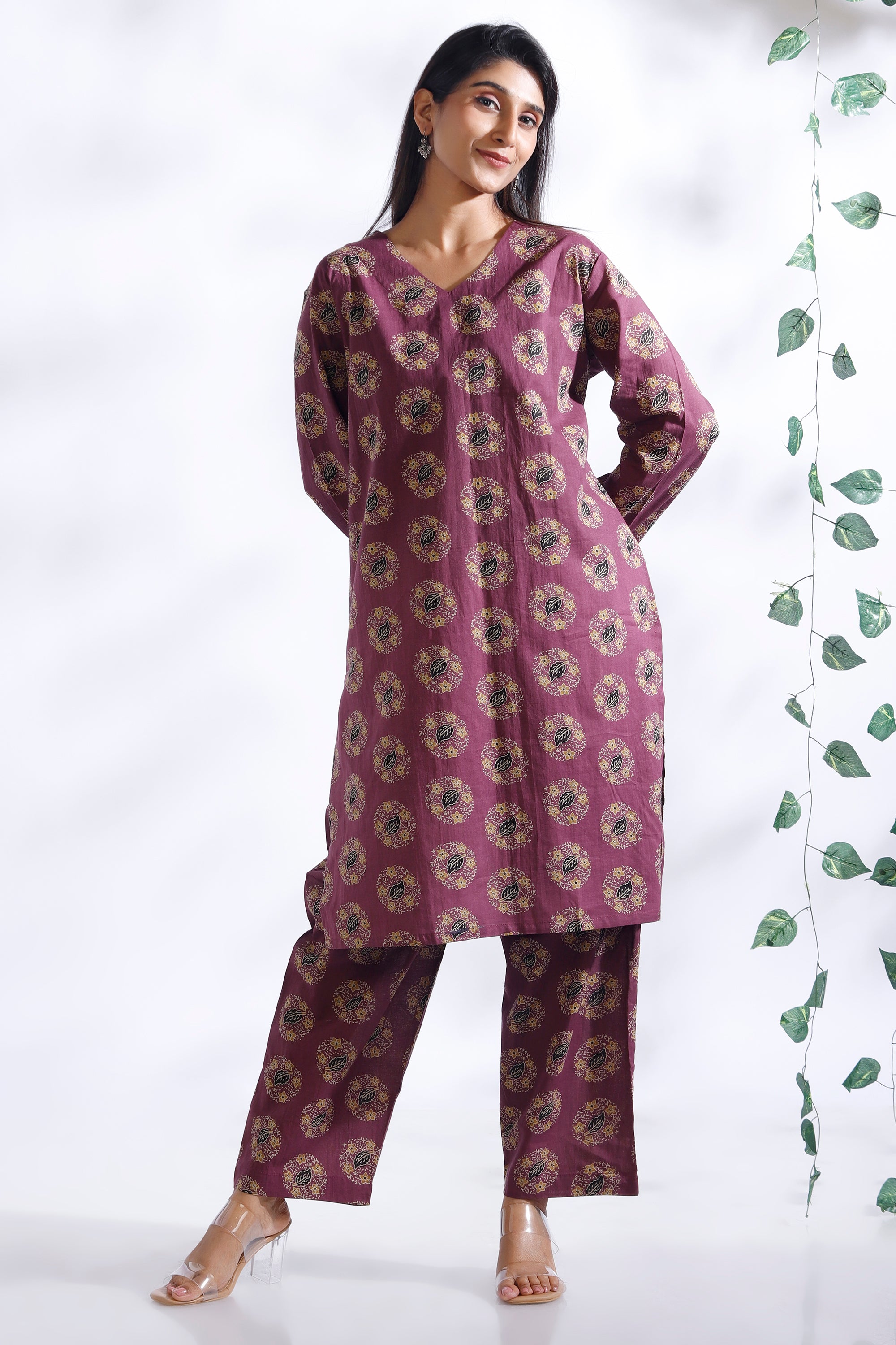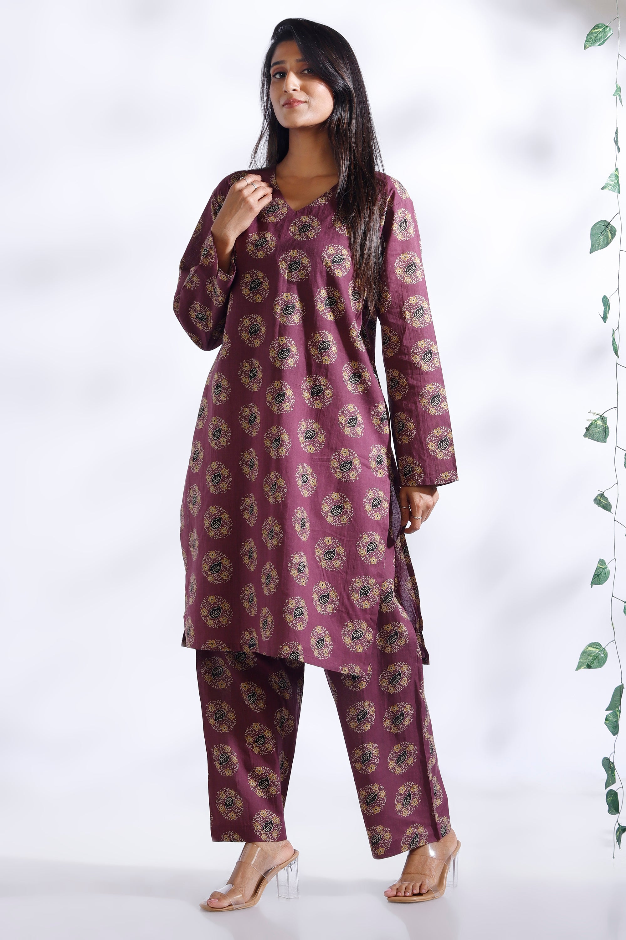 Experience elegance in motion with this Wine Butta Print Cotton Co-ord from BREATH:ABLES. With its soft fabric, flattering V-neck and relaxed fit, this set is perfect for cozy lounging or stepping out in style.