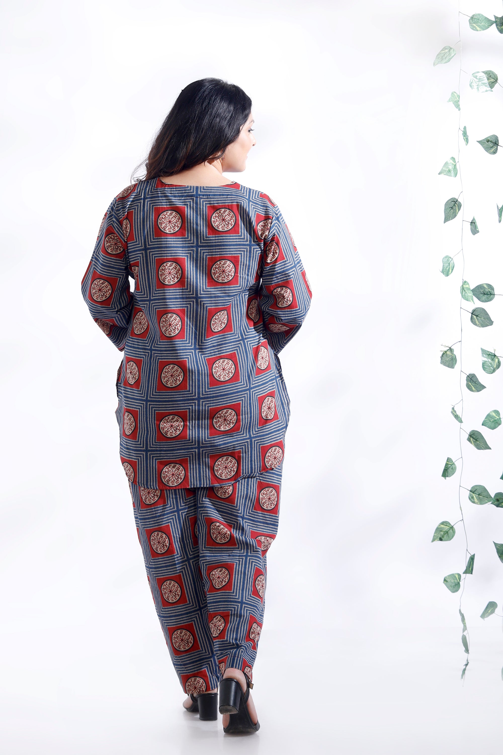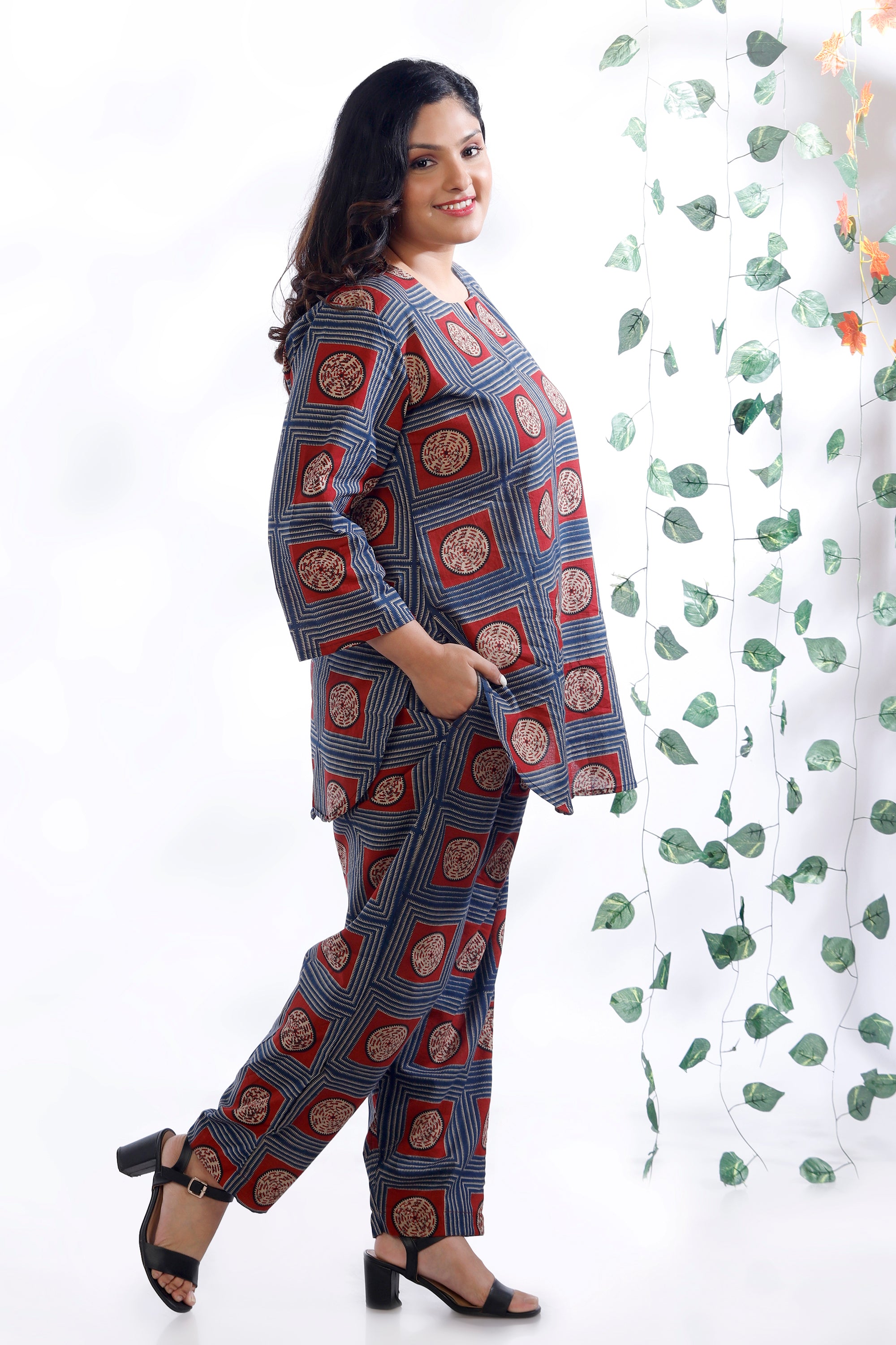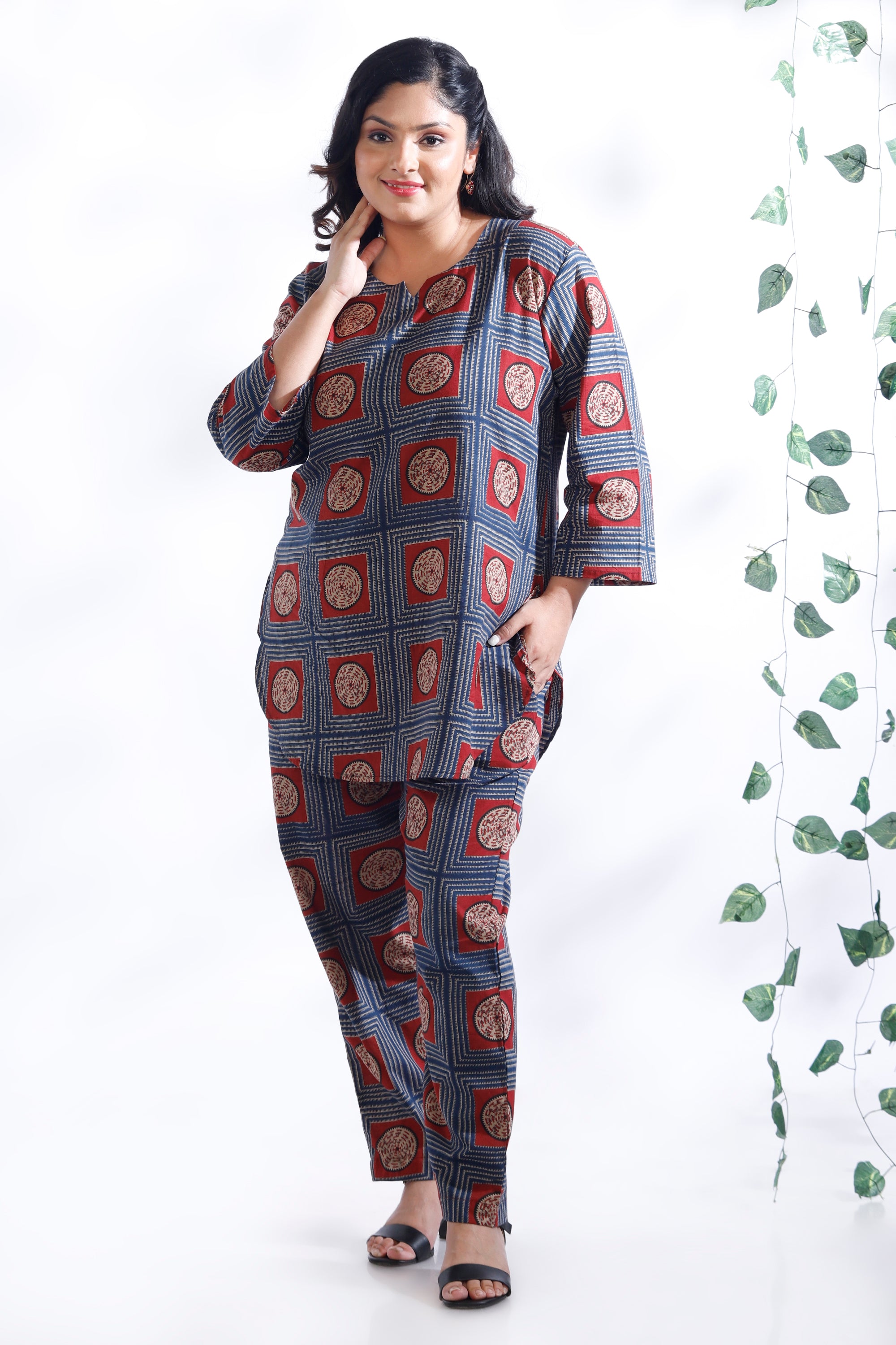 Want loungewear that’s as stylish as it is comfortable? The BREATH:ABLES women’s blue cotton geometric print co-ord set features a hip-length kurta paired with short narrow-bottom pants for a chic, modern silhouette. Crafted from soft, breathable premium cotton, it offers all-day ease with a relaxed fit, round neckline, and 3/4th sleeves. The pants are designed with an elastic waistband and adjustable drawstrings for a customised fit. Perfect for lounging, coffee runs, work-from-home, or travel, this set delivers effortless style, comfort, and versatility. Easy to wash, shape-retaining, and colour-fast — ready for repeated wear.