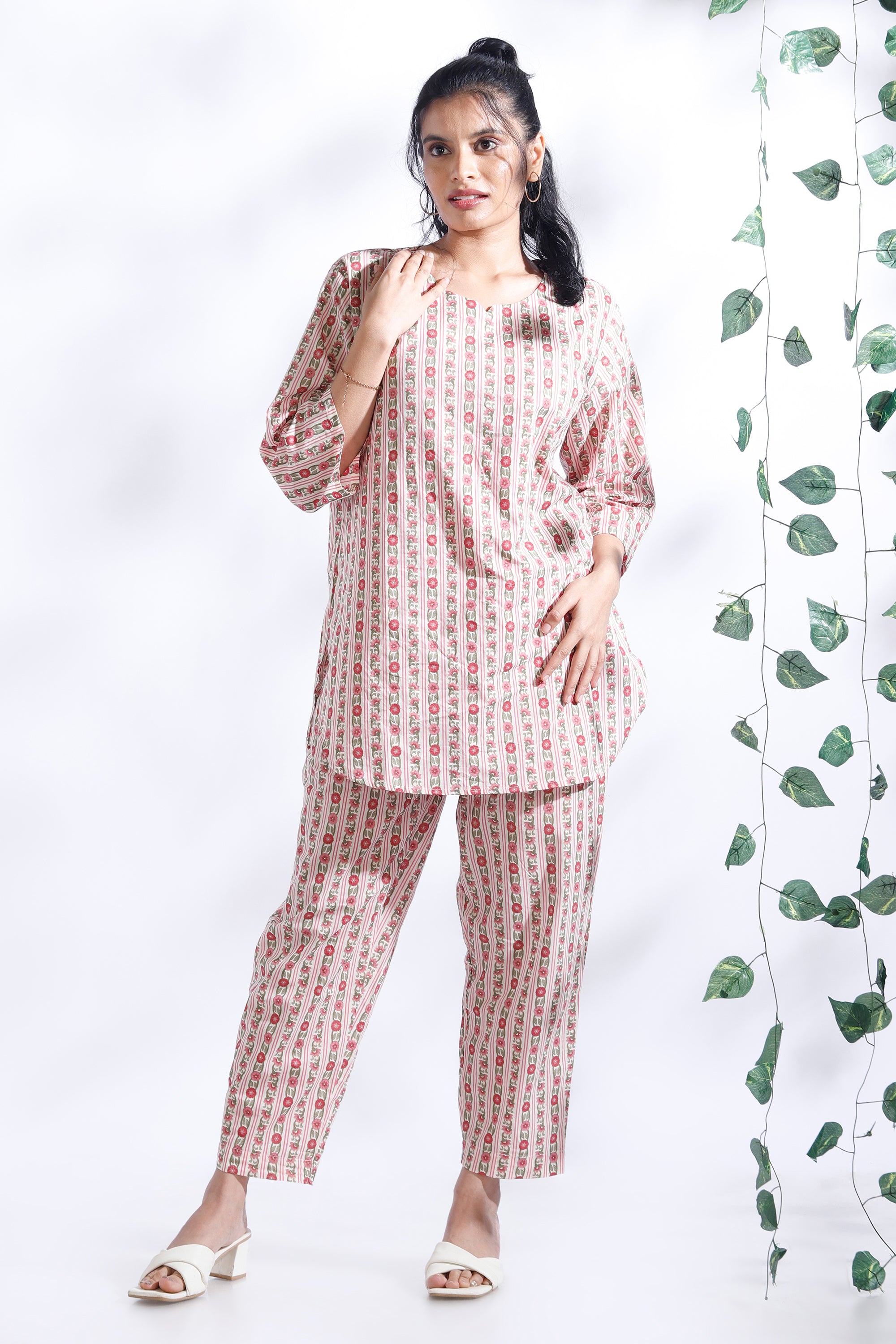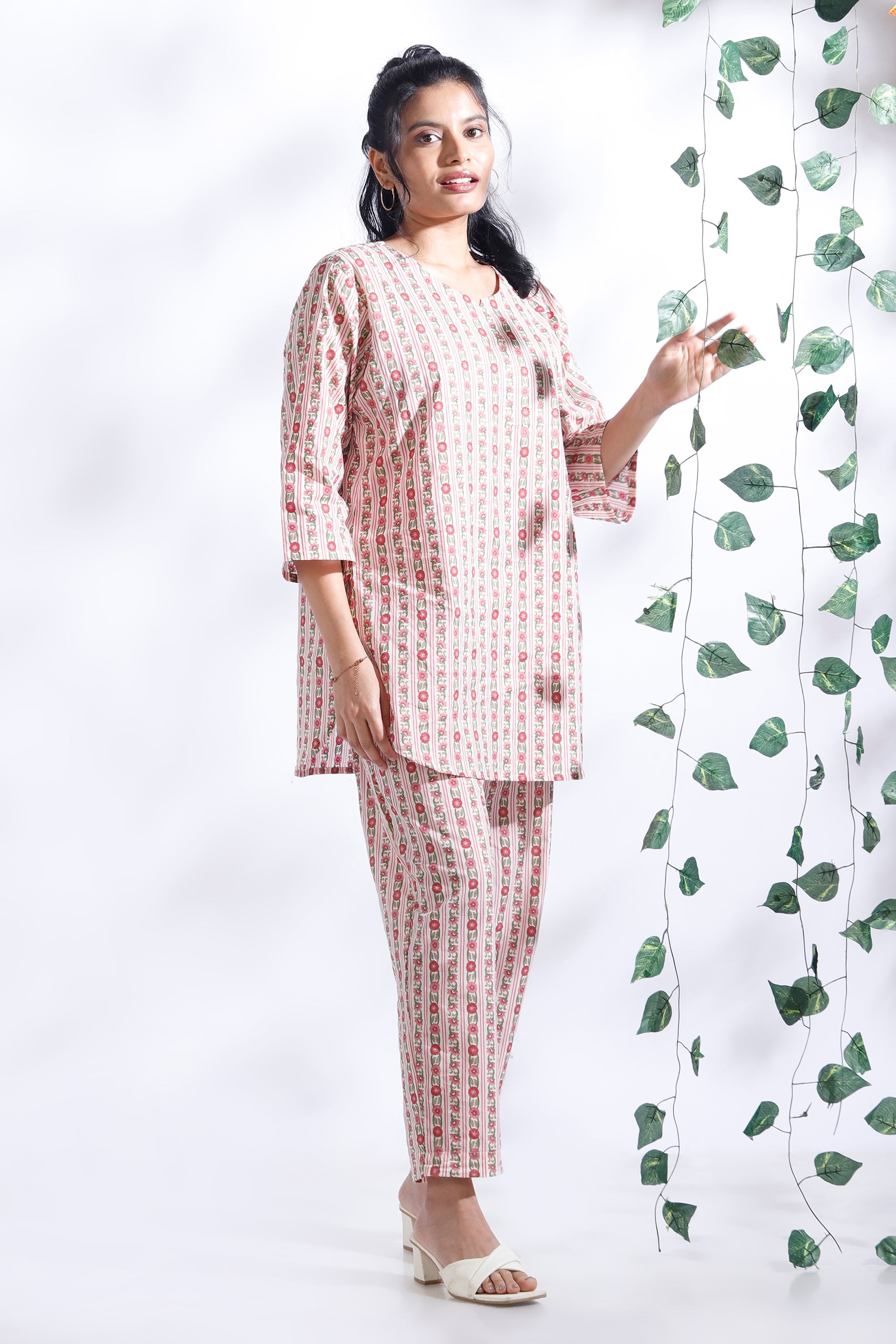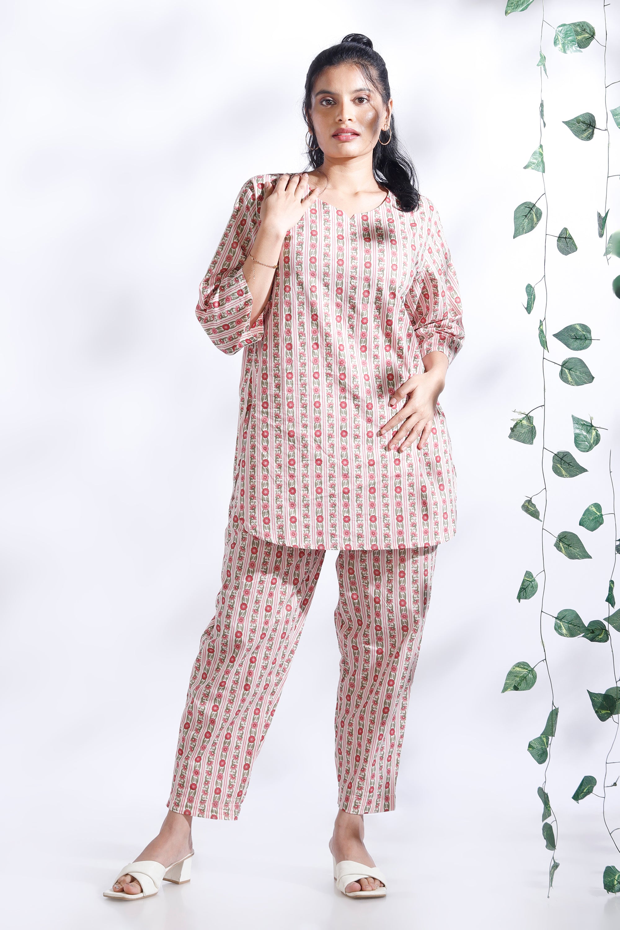 Add a fresh, feminine touch to your everyday style with the BREATH:ABLES women’s pink cotton floral stripes co-ord set. This charming loungewear set pairs a hip-length kurta with short narrow-bottom pants, both crafted from soft, breathable premium cotton. The relaxed fit, round neckline, and 3/4th sleeves offer all-day ease, while the elastic waistband with adjustable drawstrings ensures a perfect fit. Designed for lounging, brunch dates, coffee runs, or travel, this versatile set blends comfort, elegance, and effortless style. Easy to wash, colour-fast, and shape-retaining — perfect for repeated wear.