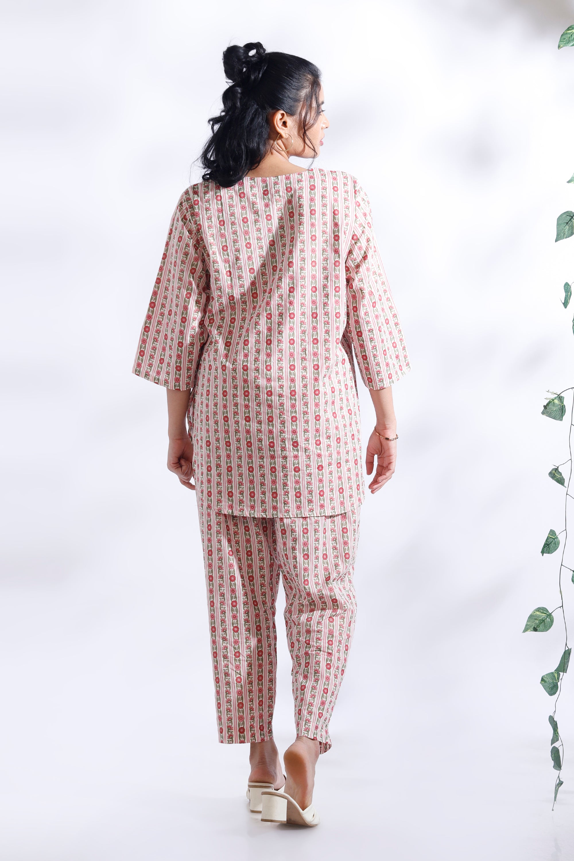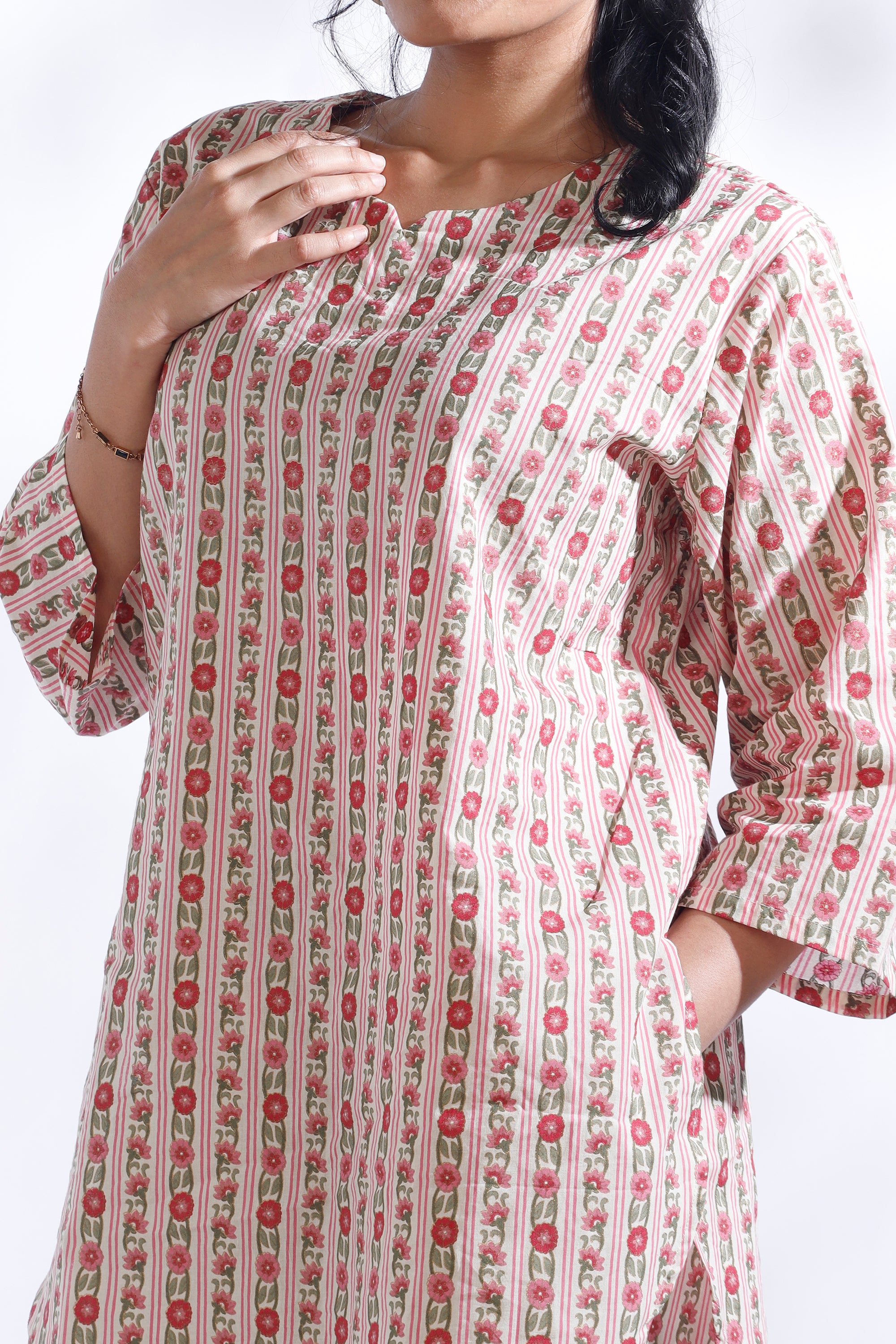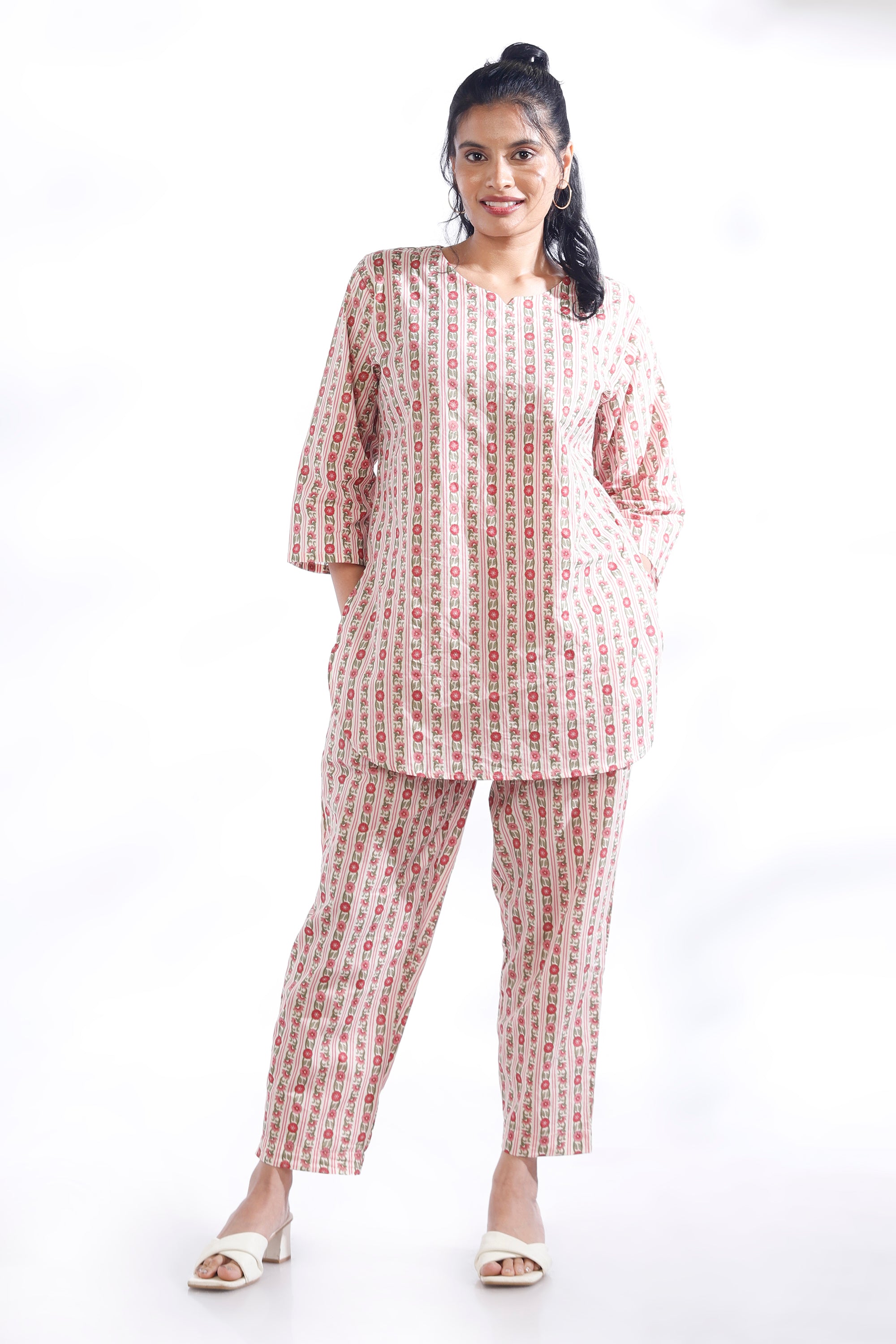 Add a fresh, feminine touch to your everyday style with the BREATH:ABLES women’s pink cotton floral stripes co-ord set. This charming loungewear set pairs a hip-length kurta with short narrow-bottom pants, both crafted from soft, breathable premium cotton. The relaxed fit, round neckline, and 3/4th sleeves offer all-day ease, while the elastic waistband with adjustable drawstrings ensures a perfect fit. Designed for lounging, brunch dates, coffee runs, or travel, this versatile set blends comfort, elegance, and effortless style. Easy to wash, colour-fast, and shape-retaining — perfect for repeated wear.