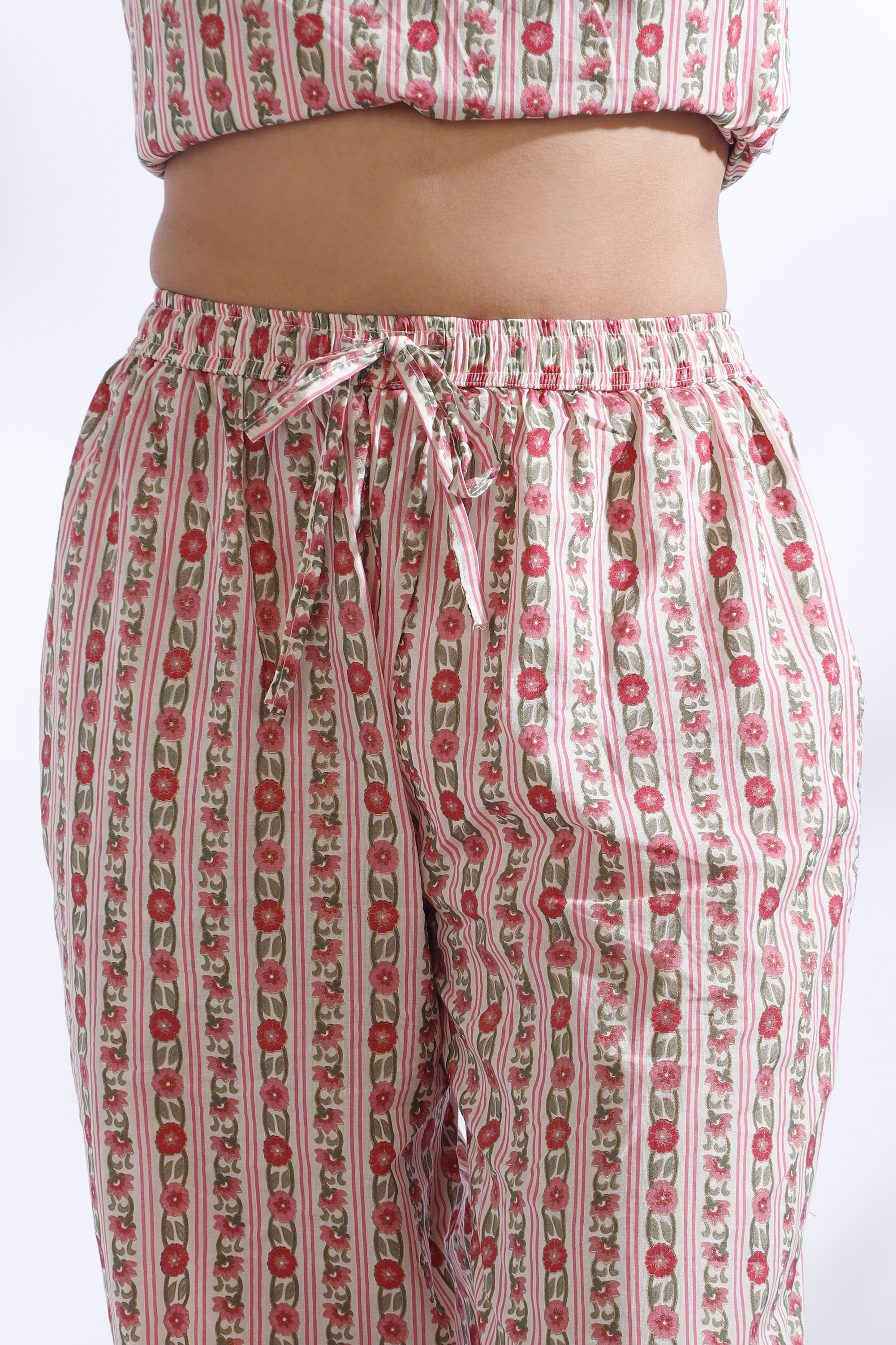 Women’s Pink Cotton Floral Stripes Loungewear Co-ord Set