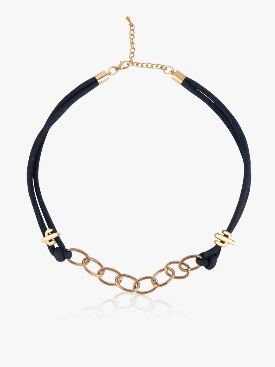 FOReT Arizona Necklace is striking and elegant. Handmade with Navy Blue Cork and Bold Gold chain, it is artisanal and exquisite..