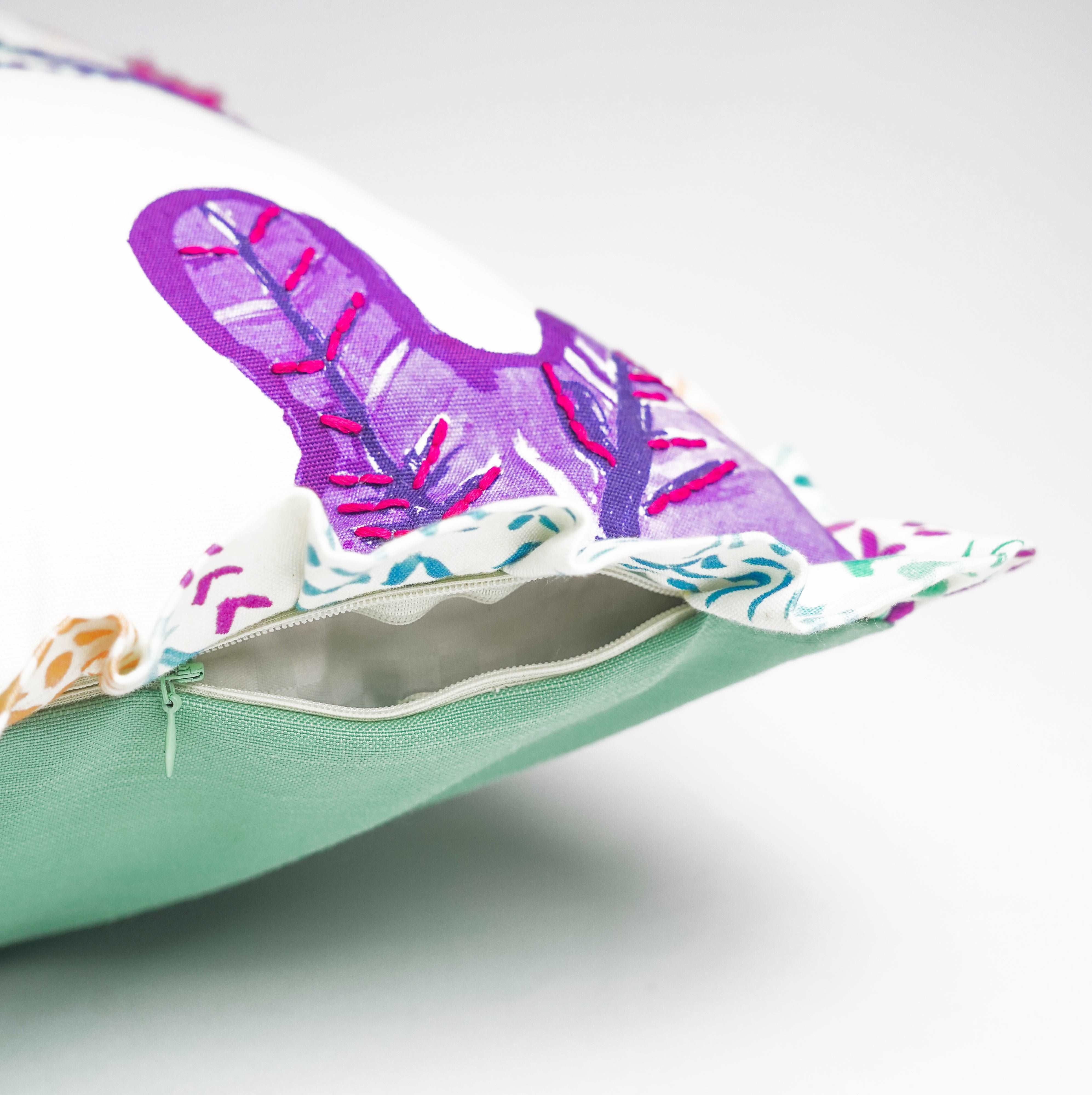 Humming into the summer season, this cushion cover cherishes the symphony of nature through the melodies of soulful songbirds in harmonious shades of pink. The Kantha stitch embroidery brings to life the intricate brushstrokes, capturing the artistic zeal of the talented hands. This cushion will add a hint of nature’s flair to your home space, creating an overall serene ambience.