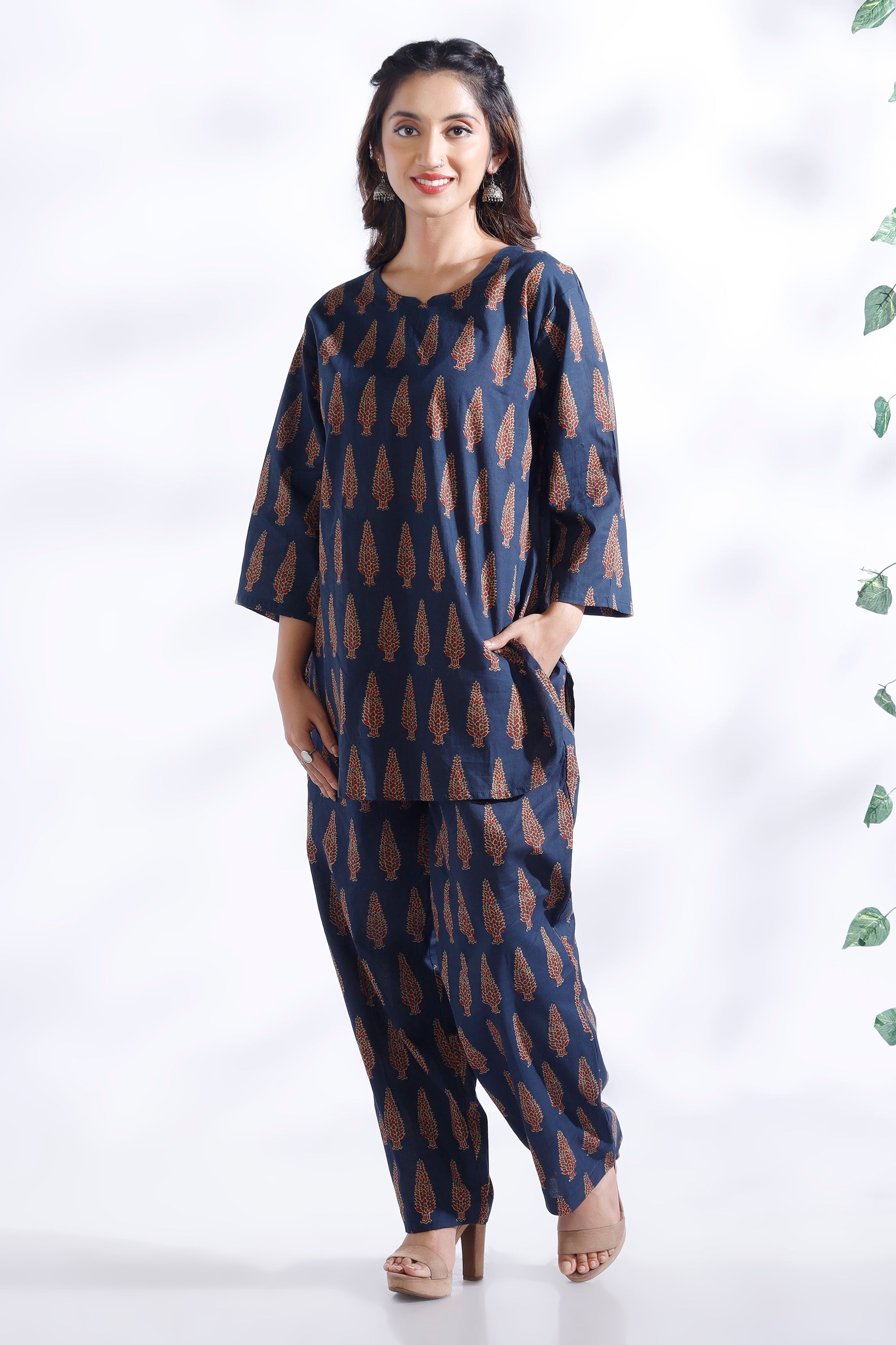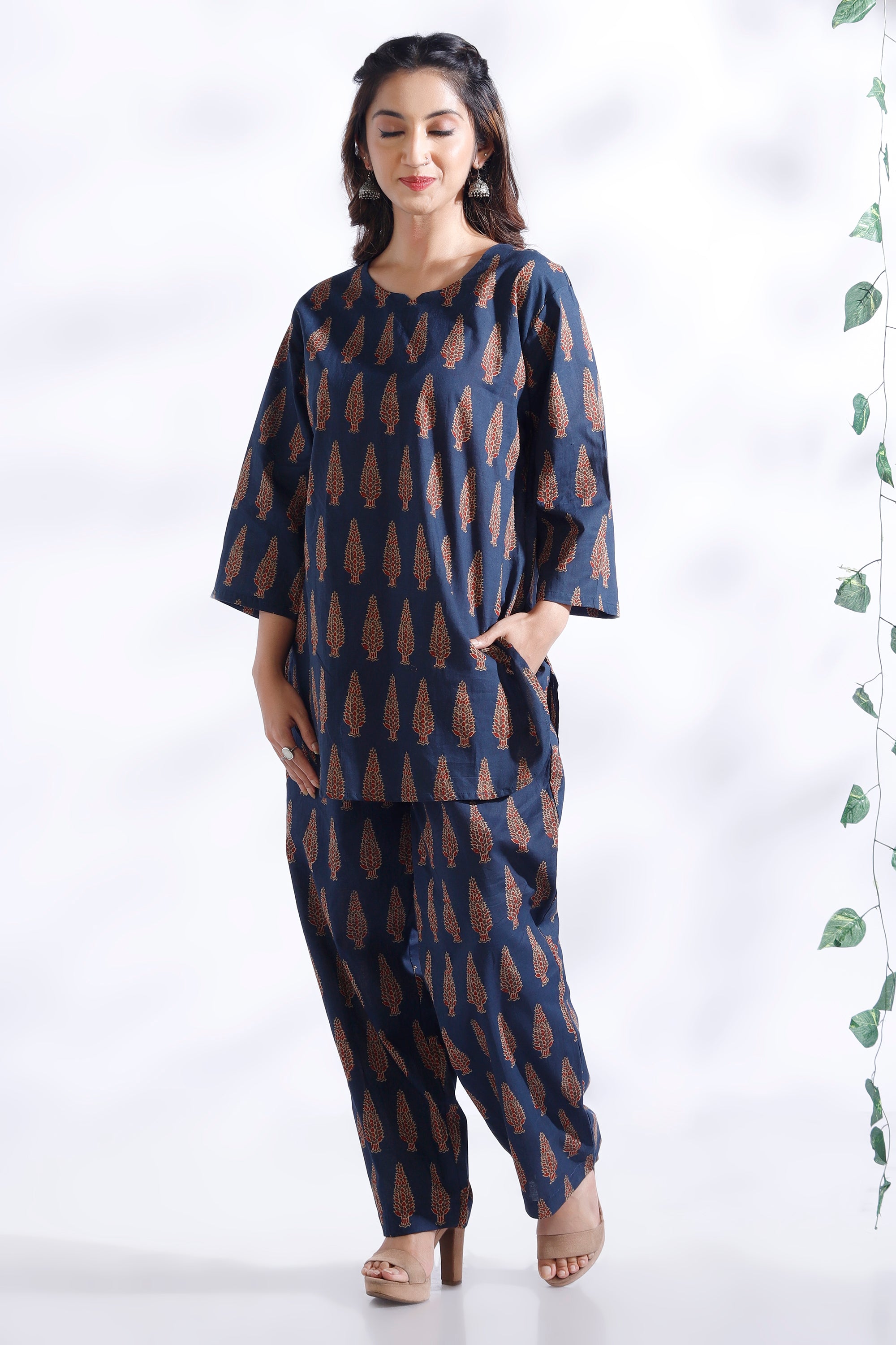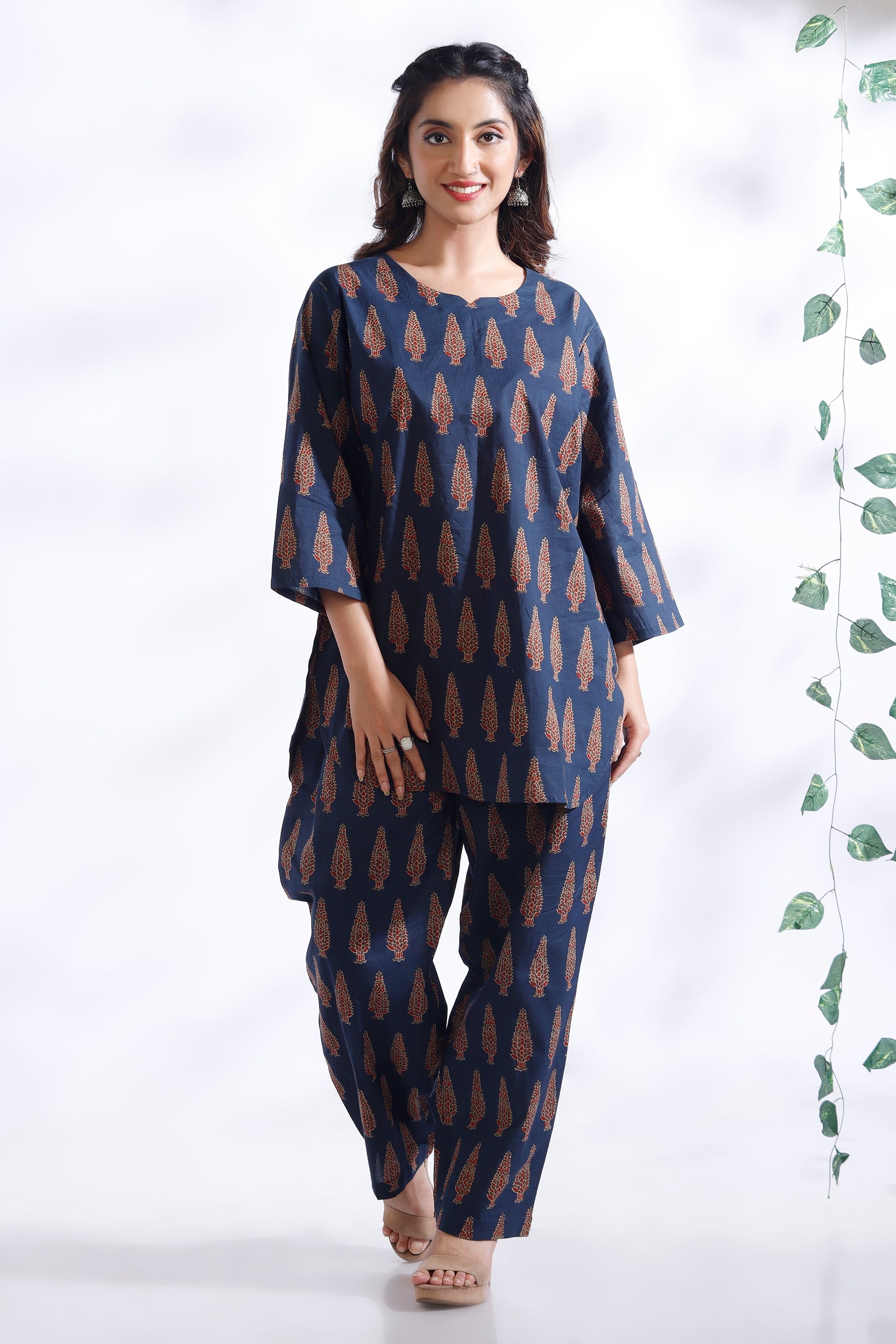 Crafted in pure breathable cotton, this co-ord set features a hip-length kurta with delicate butta prints and straight pants. Designed with a round neck, 3/4th sleeves, and a relaxed silhouette – perfect for all-day lounging or casual errands.