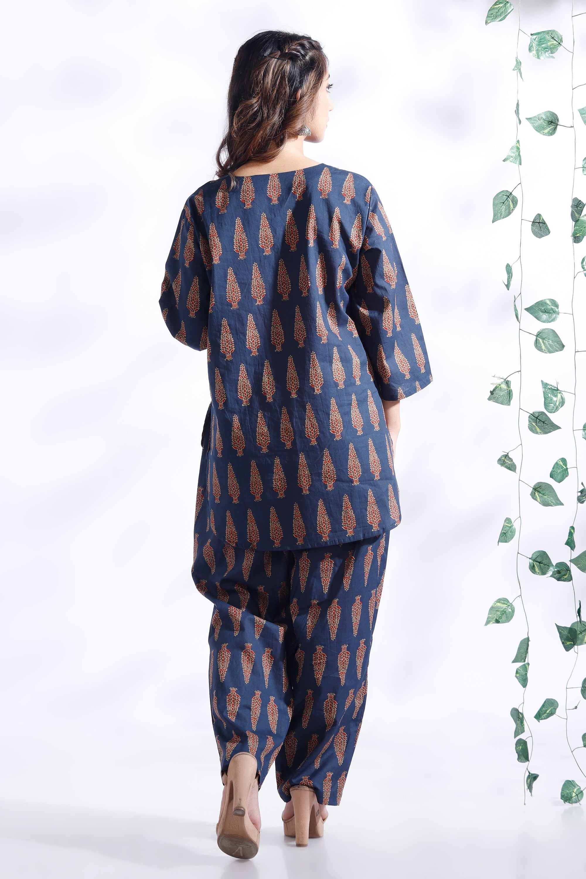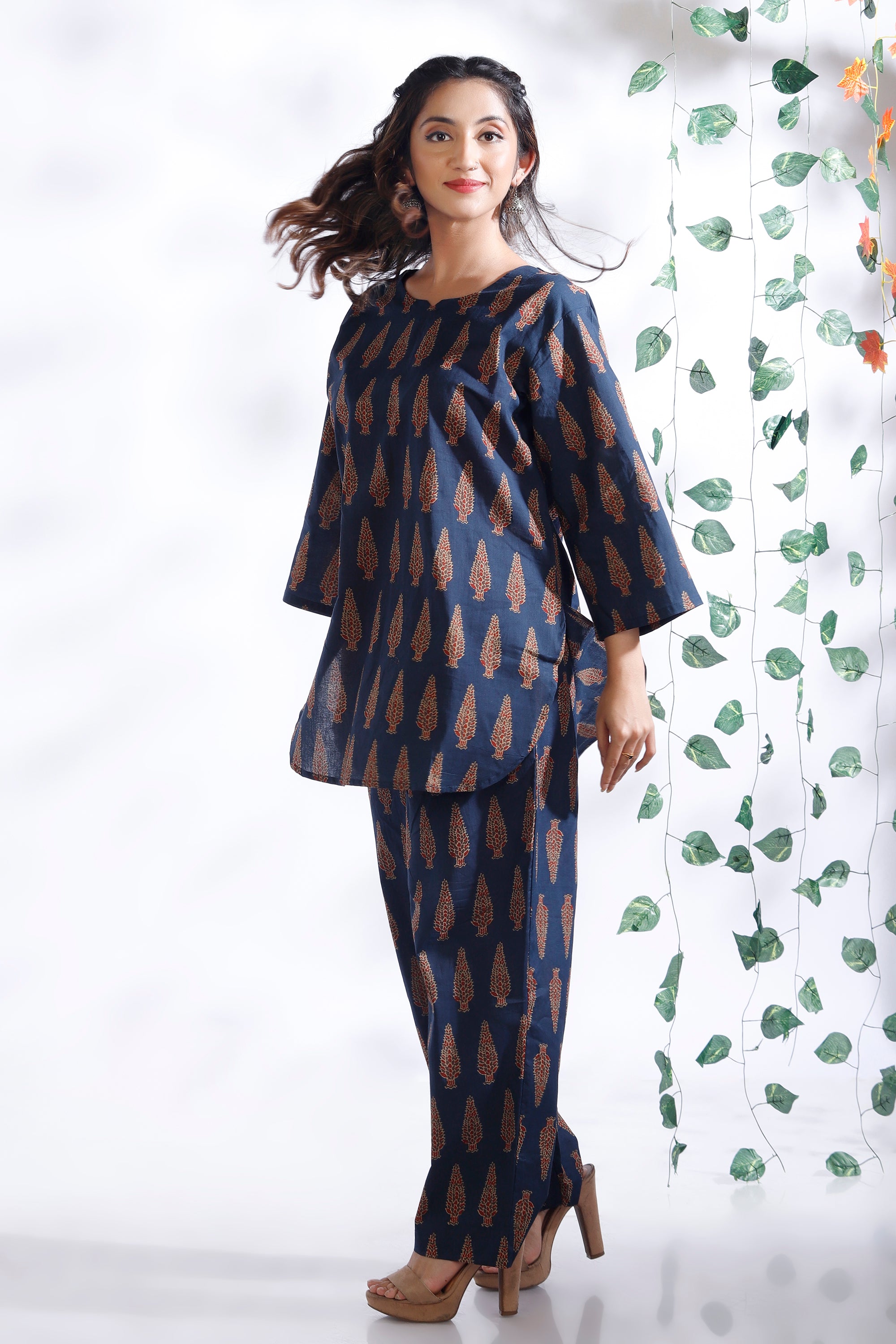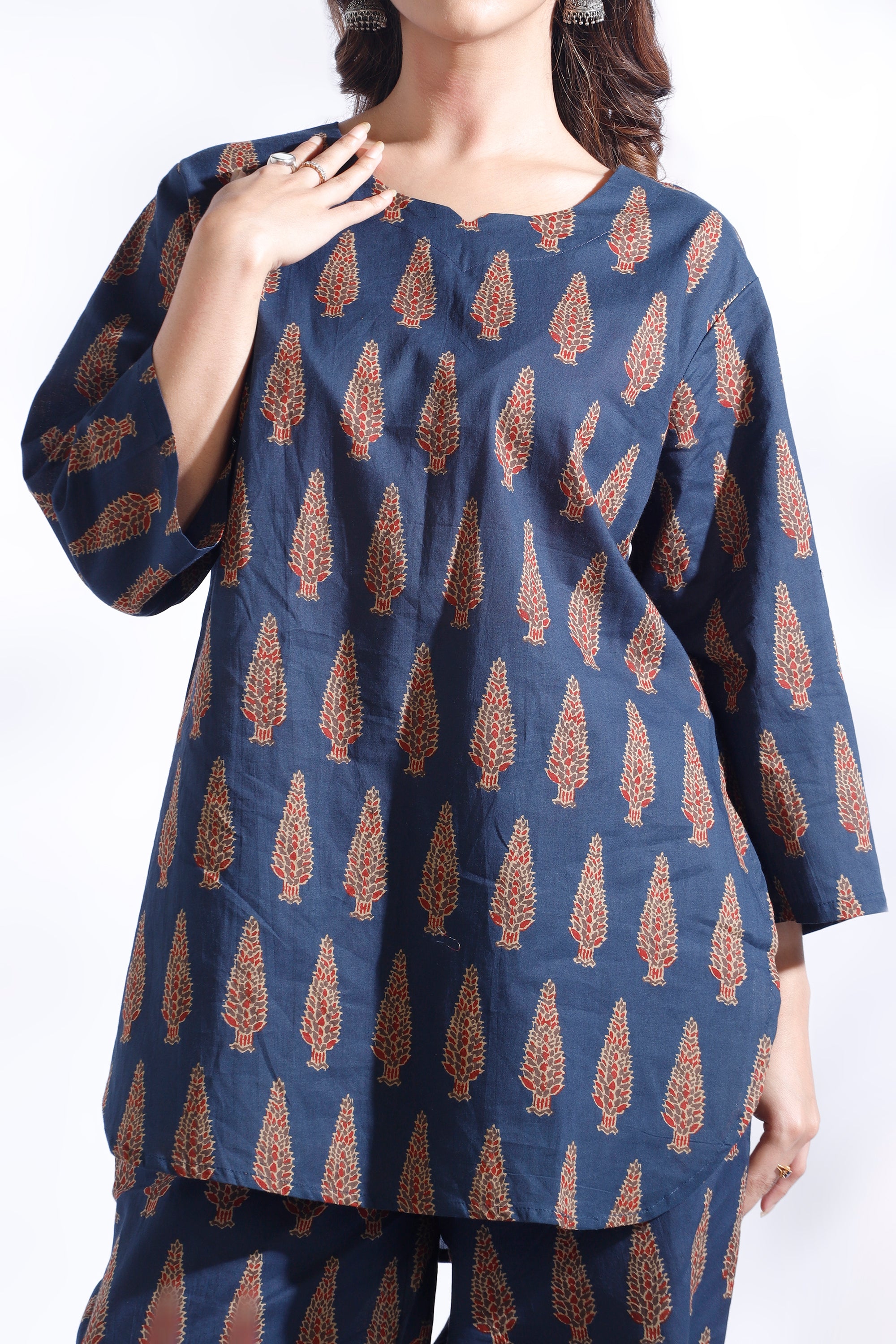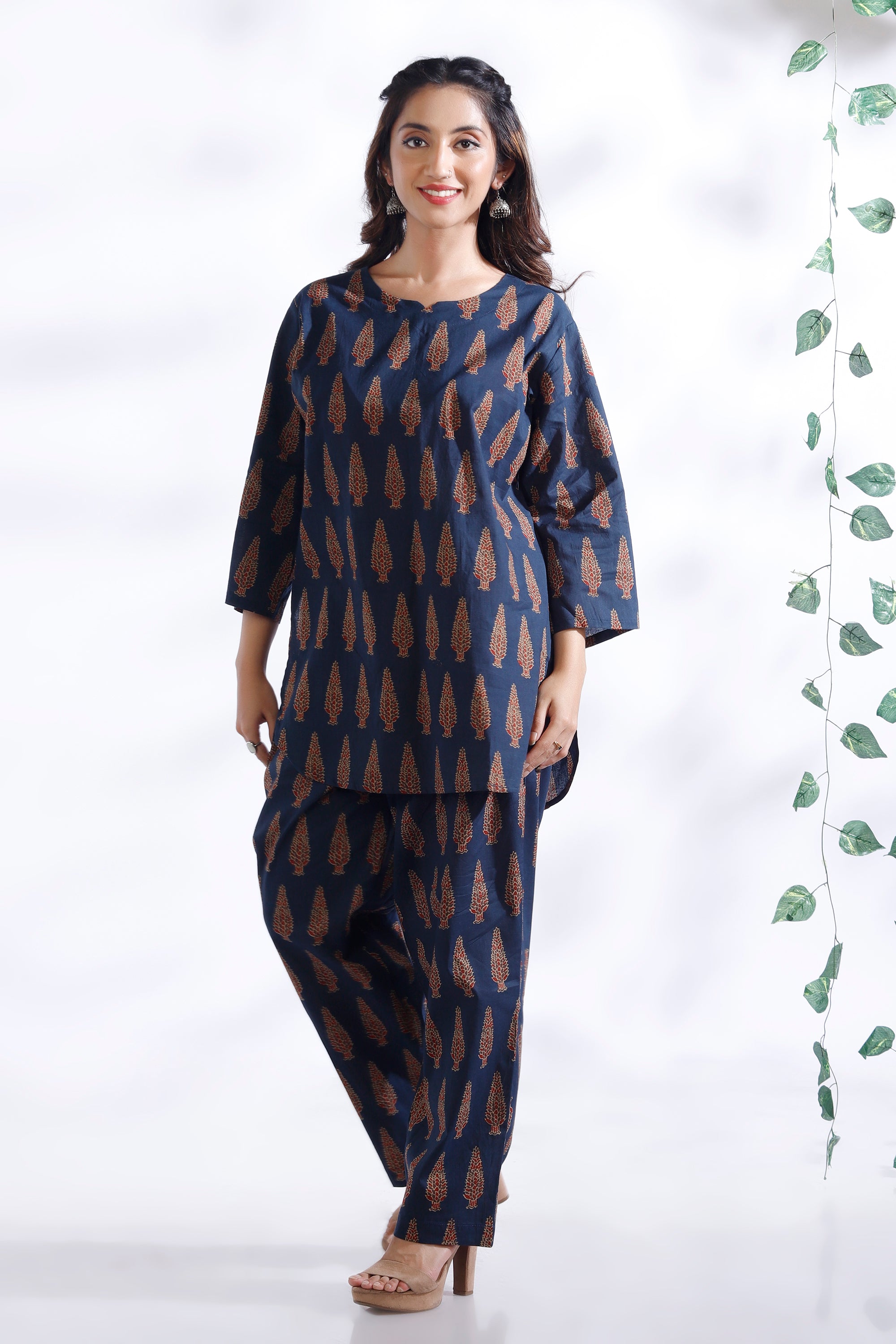 Crafted in pure breathable cotton, this co-ord set features a hip-length kurta with delicate butta prints and straight pants. Designed with a round neck, 3/4th sleeves, and a relaxed silhouette – perfect for all-day lounging or casual errands.