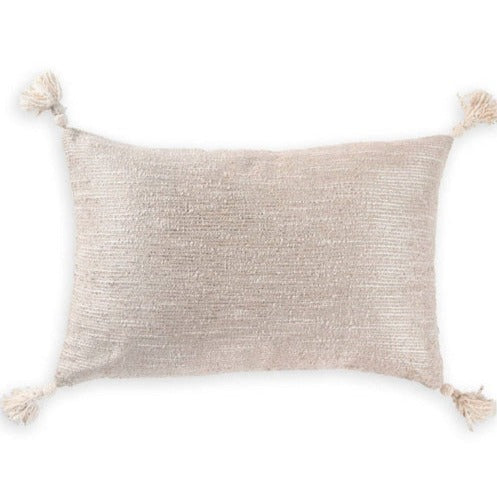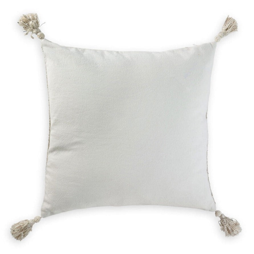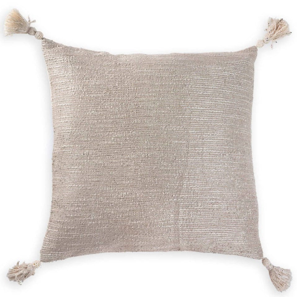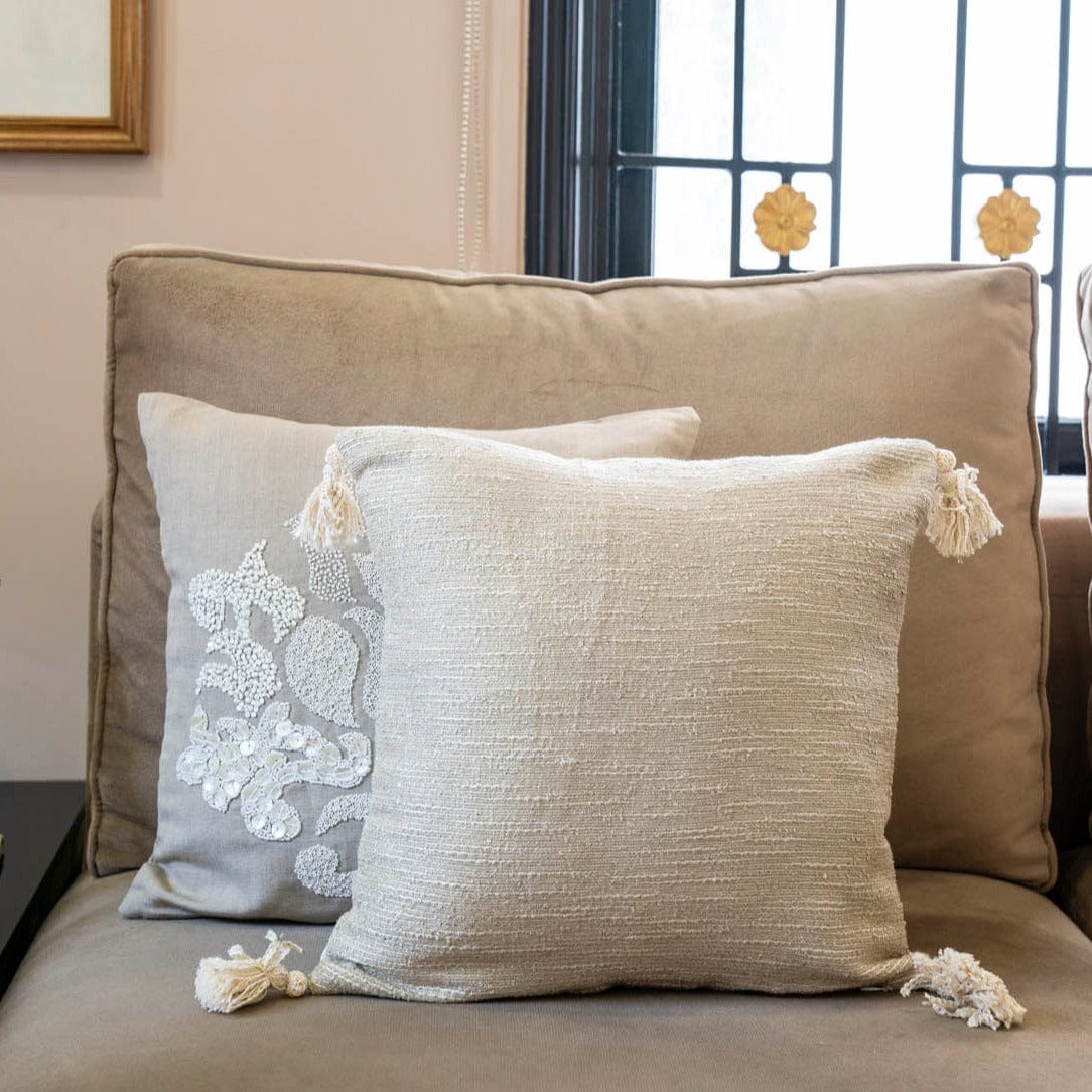 Effortlessly elegant, this handwoven off-white cushion cover boasts intricate craftsmanship and a subtle metallic touch for a touch of opulence. Its timeless charm elevates any space with refined sophistication.