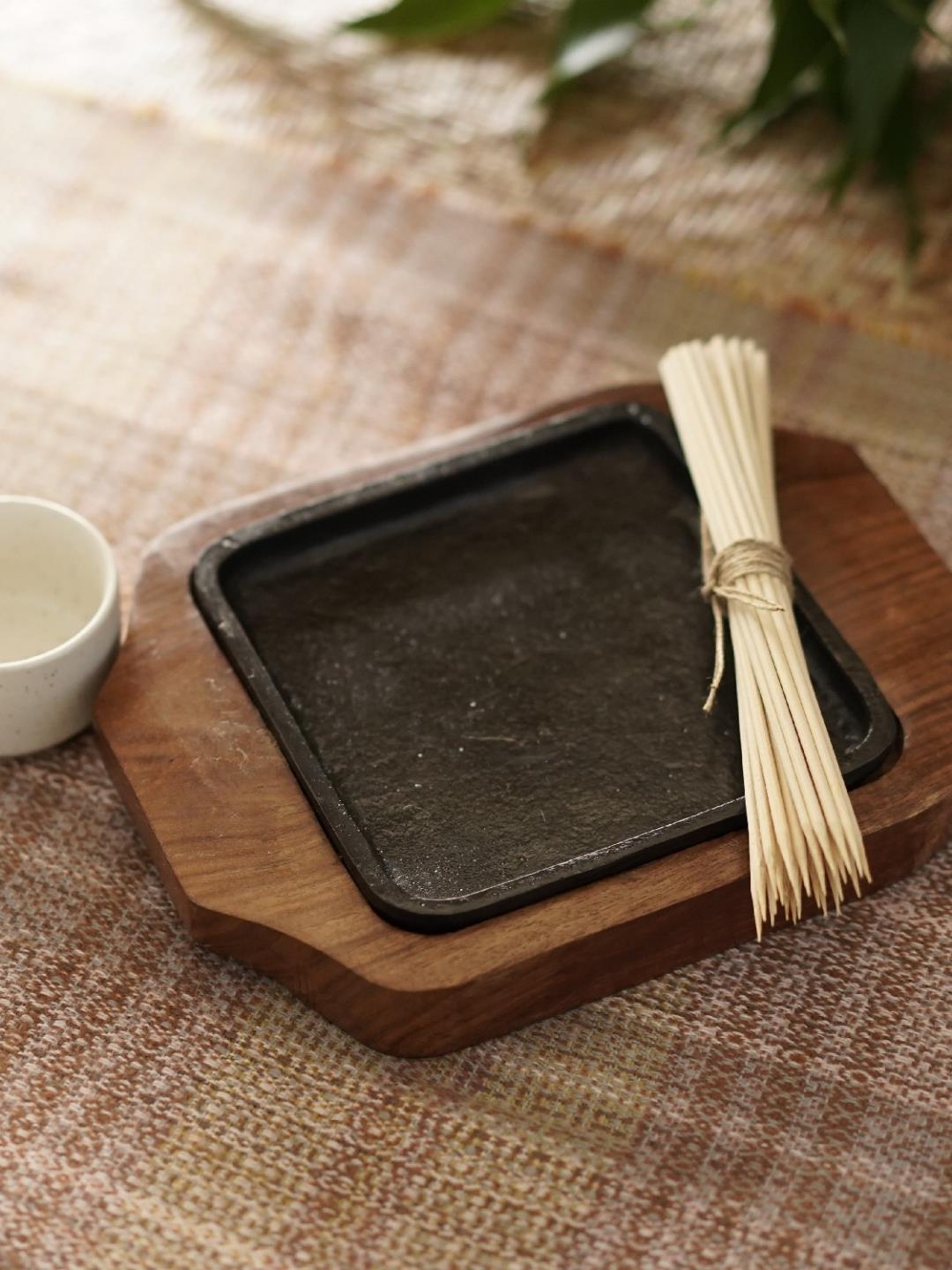 This Agaja Sizzler Plate with Sauce bowls and skewers by Courtyard will further enhance your dining experience. It contains one plate, one bowl and 24 skewers. The set is hand-crafted with precision using raw cast-iron and wood and imparts a smooth finished look that is sure to catch your fancy.