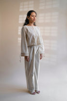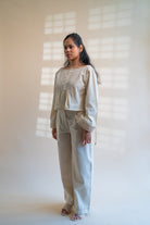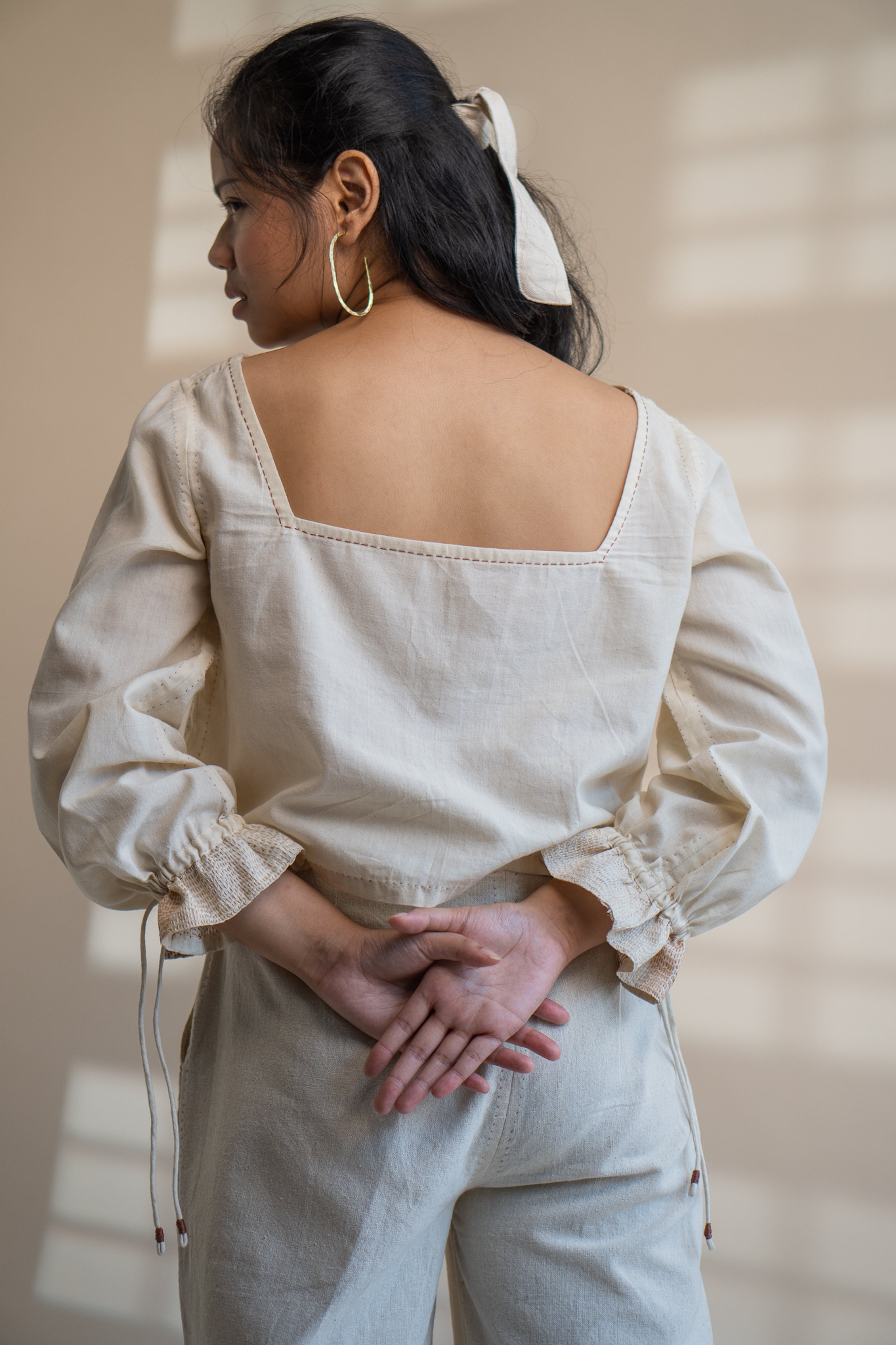 Crafted in 100% cotton fibres and natural materials. This 70s cotton blouse is undyed and unbleached. This blouse comes with an adjustable drawstring and is adorned with the stitches of Kantha, a form of Indian hand embroidery along the sleeve flare to create an ombre effect. The feature of reversibility is an element of multi-functionality involving the wearer in the process of choice and interchangeability.