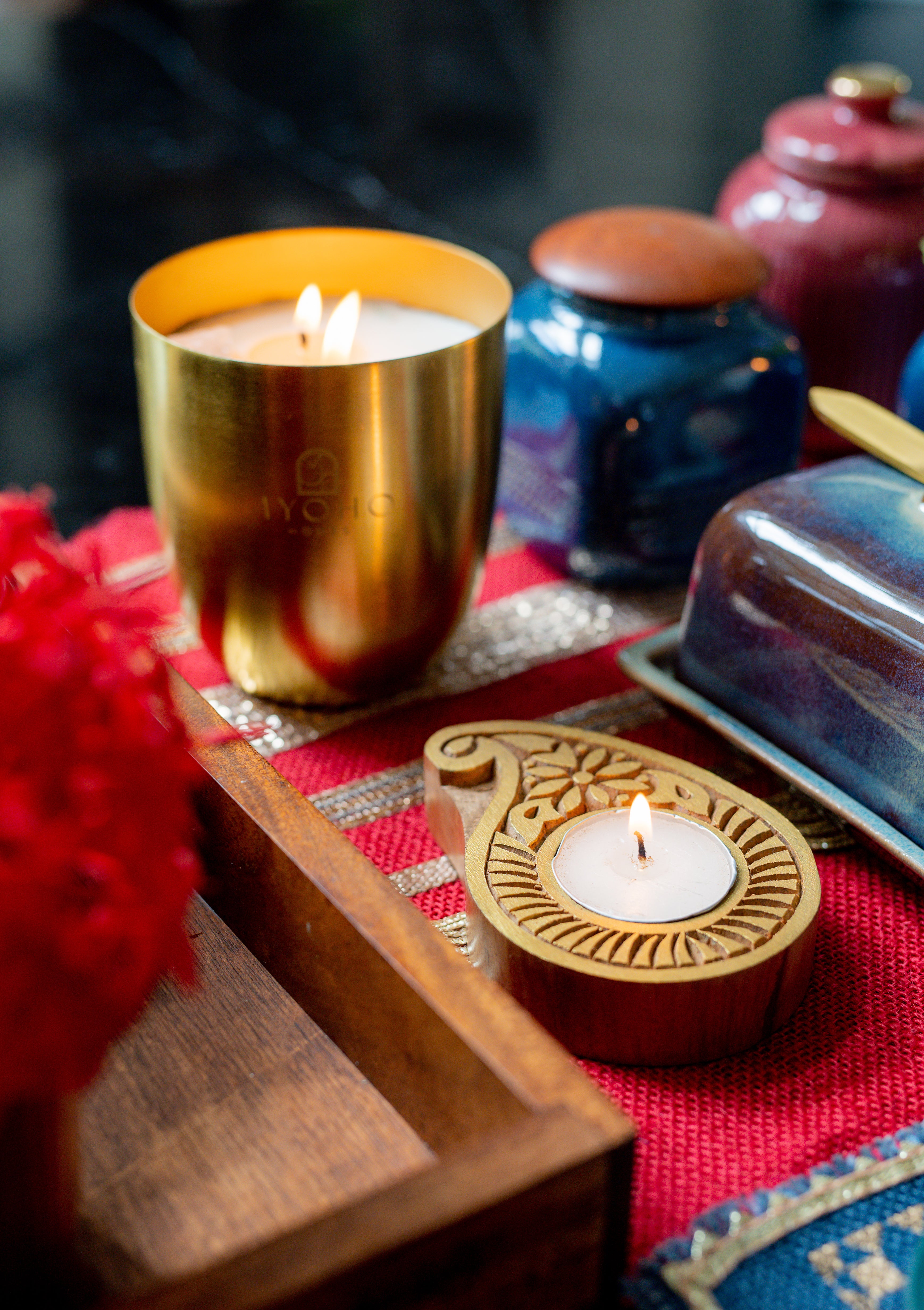 - Wooden Jaipuri Block Tea Light Holder – This handcrafted wooden tea light holder features traditional Jaipuri block designs, blending cultural heritage with contemporary style. The intricate patterns are carved into the wood, creating a beautiful interplay of light and shadow when the tea light is lit.