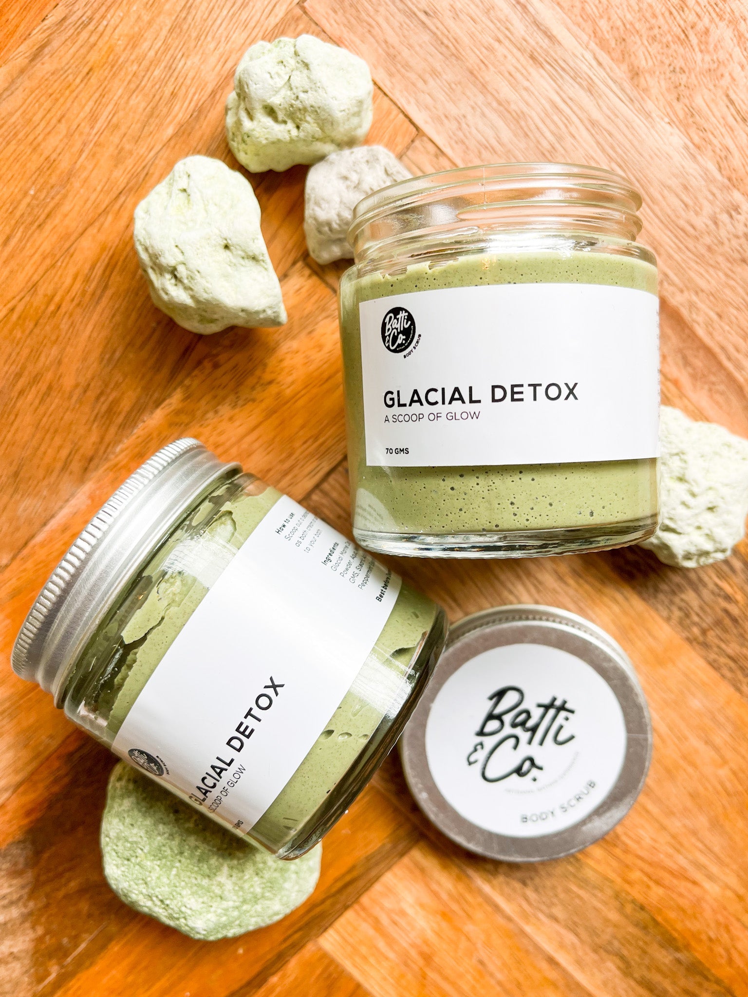 Glacial Detox is a cream based body scrub(non-foaming). Inspired by the natural ingredients like Walnut Shell, Multani Mitti and Glacial Marine Clay, this creamy body scrub is pure luxury, in a jar. Specifically crafted to improve your skin texture, reduce appearance of pores and improve blood circulation. It's an ultra-fine formulation that masterfully balances and hydrates the skin. The rich powers of Glacial Marine Clay shine through by instantly removing dead skin cells, reducing fine lines and wrinkles, and treating signs of eczema and rosacea.