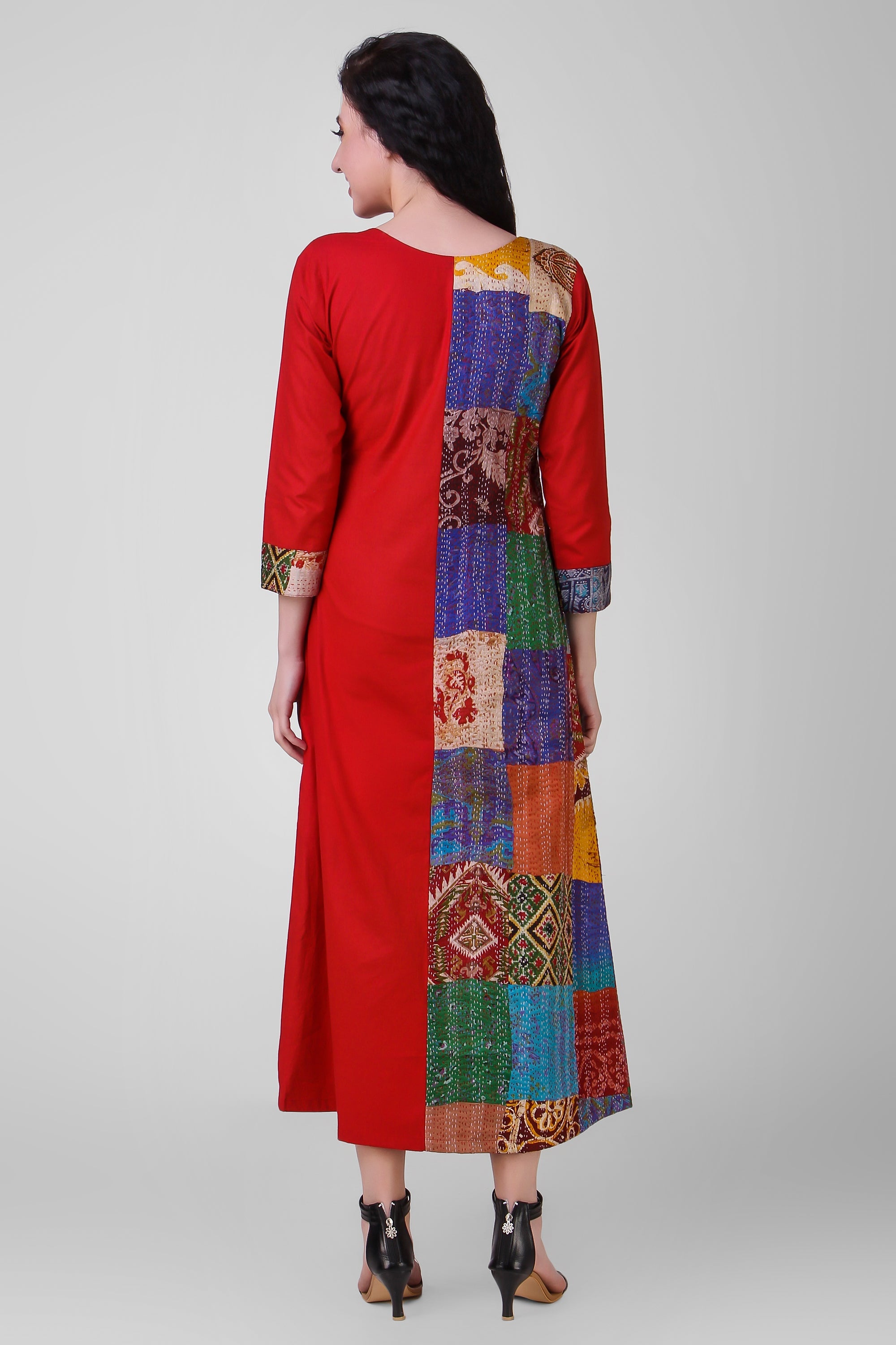 Red vintage silk kantha hand embroidered dress