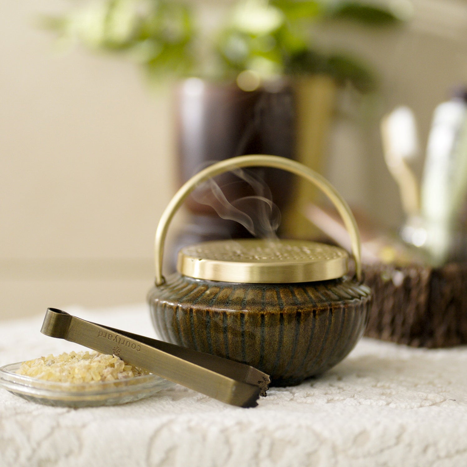 The Gulfam Fumer celebrates the ancient tradition of rejuvenating the home space with fragrant incense smoke. The product includes a hand cast ceramic dhuna with perforated brass lid allowing fumes to escape and purify the ambience. Interesting combination makes it a complete gift for those charmed by tradition and age-old customs.