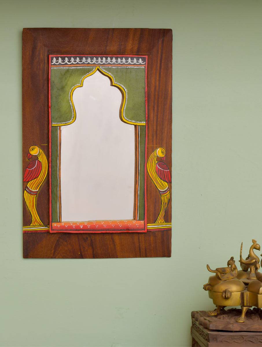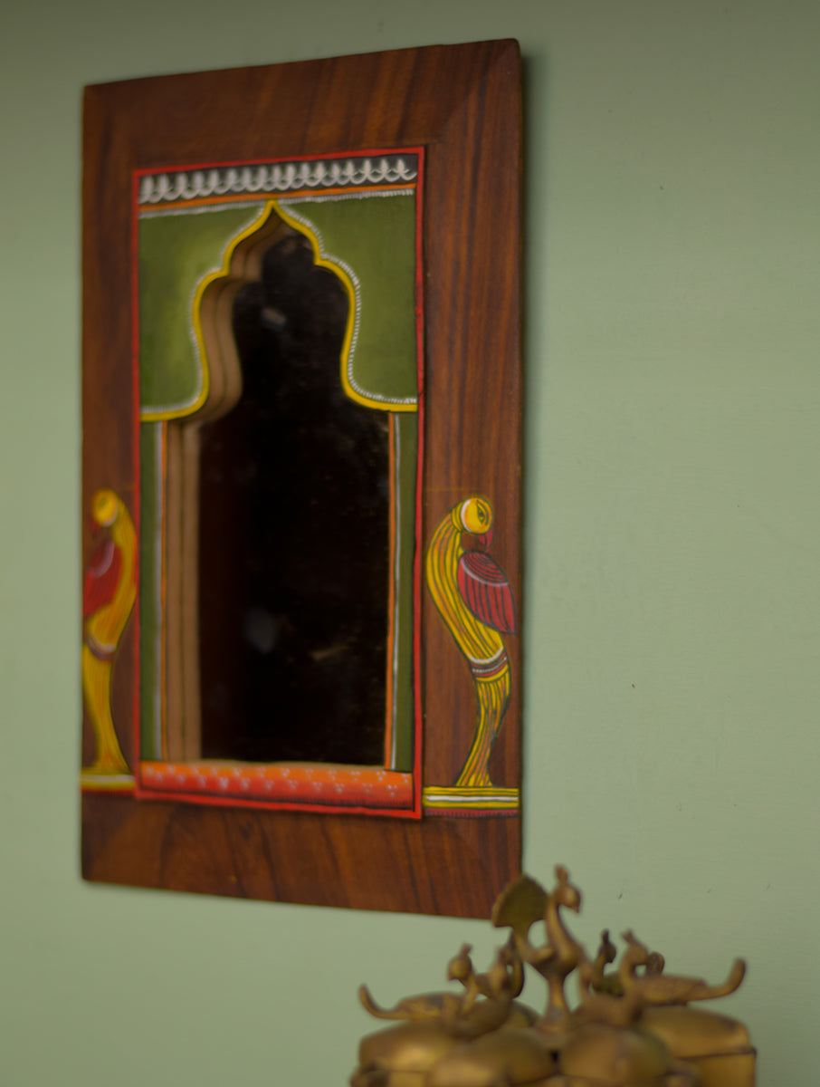 Pratibimb by Ba No Batwo is a handcrafted collection of vintage mirrors, handcarved in repurposed teak wood and handpainted in miniature, pattachitra and distressed style. The intricate carvings on each of these pieces have been inspired by the elaborate arches of Mughal-era architecture.