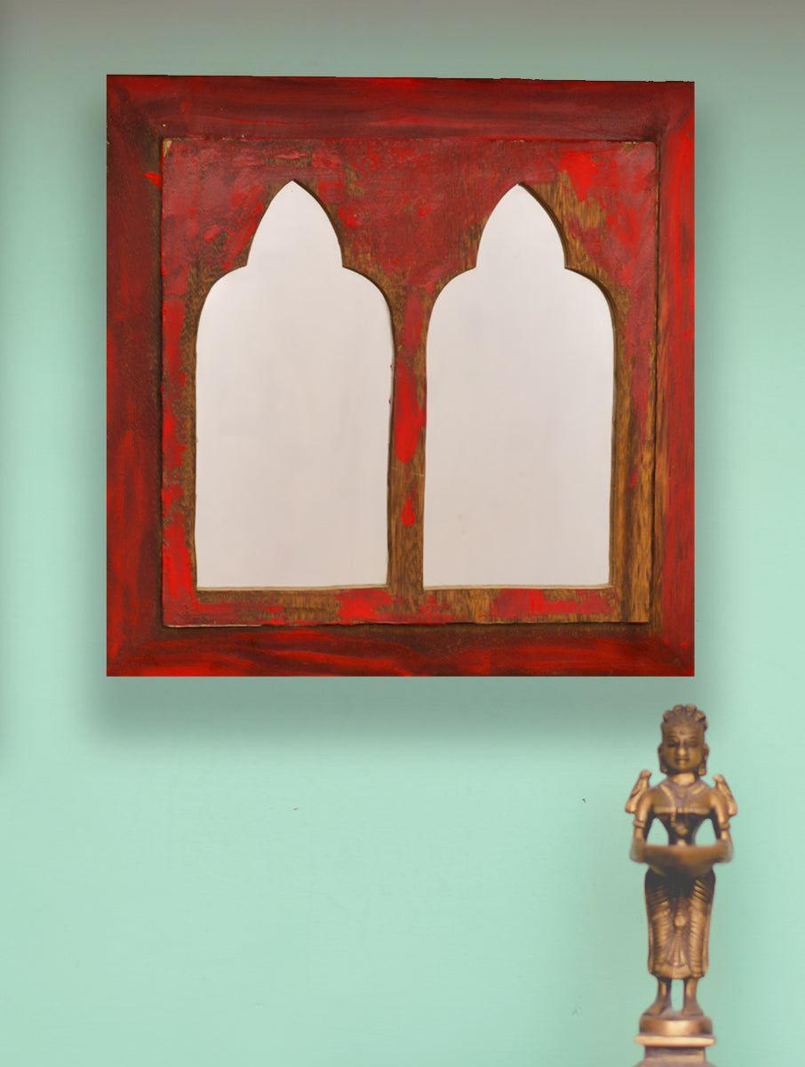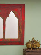 HANDPAINTED RED ANTIQUE MIRROR WITH VINTAGE WOODEN FRAME