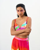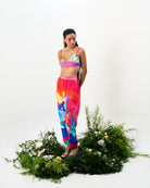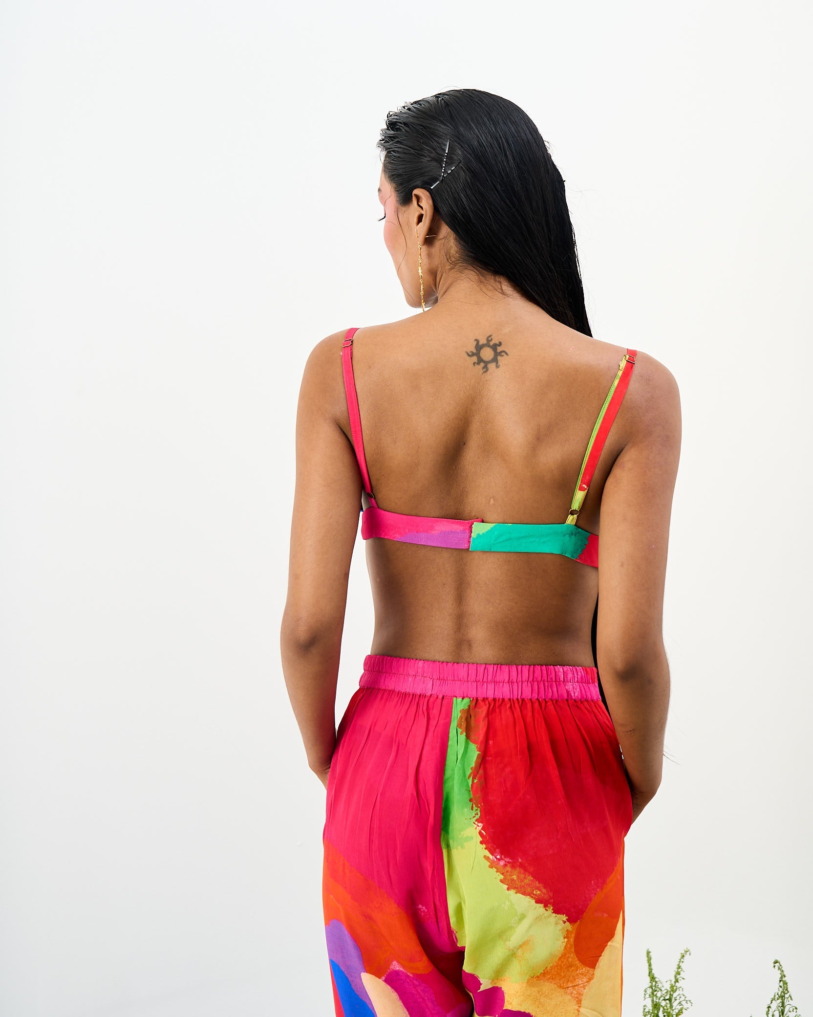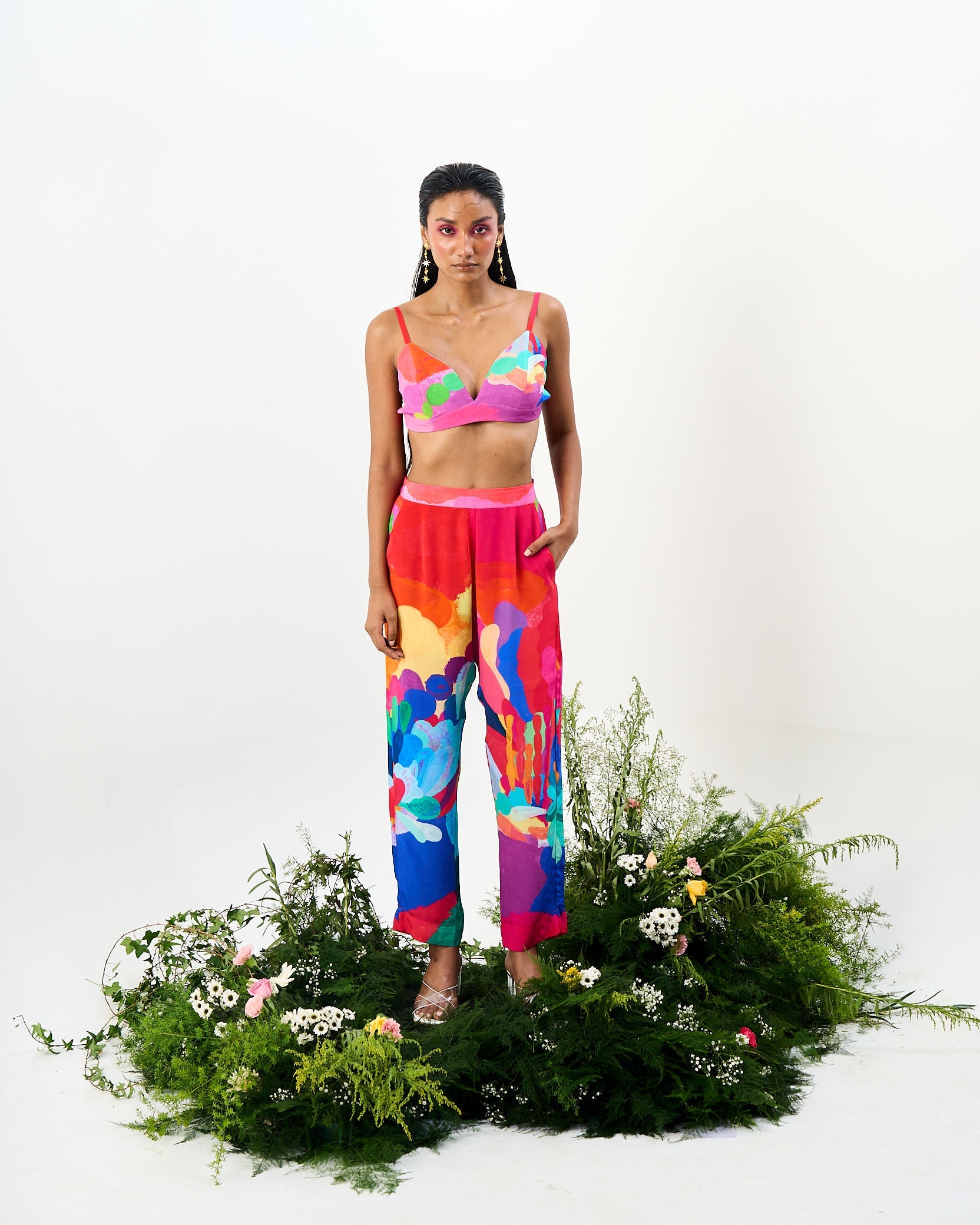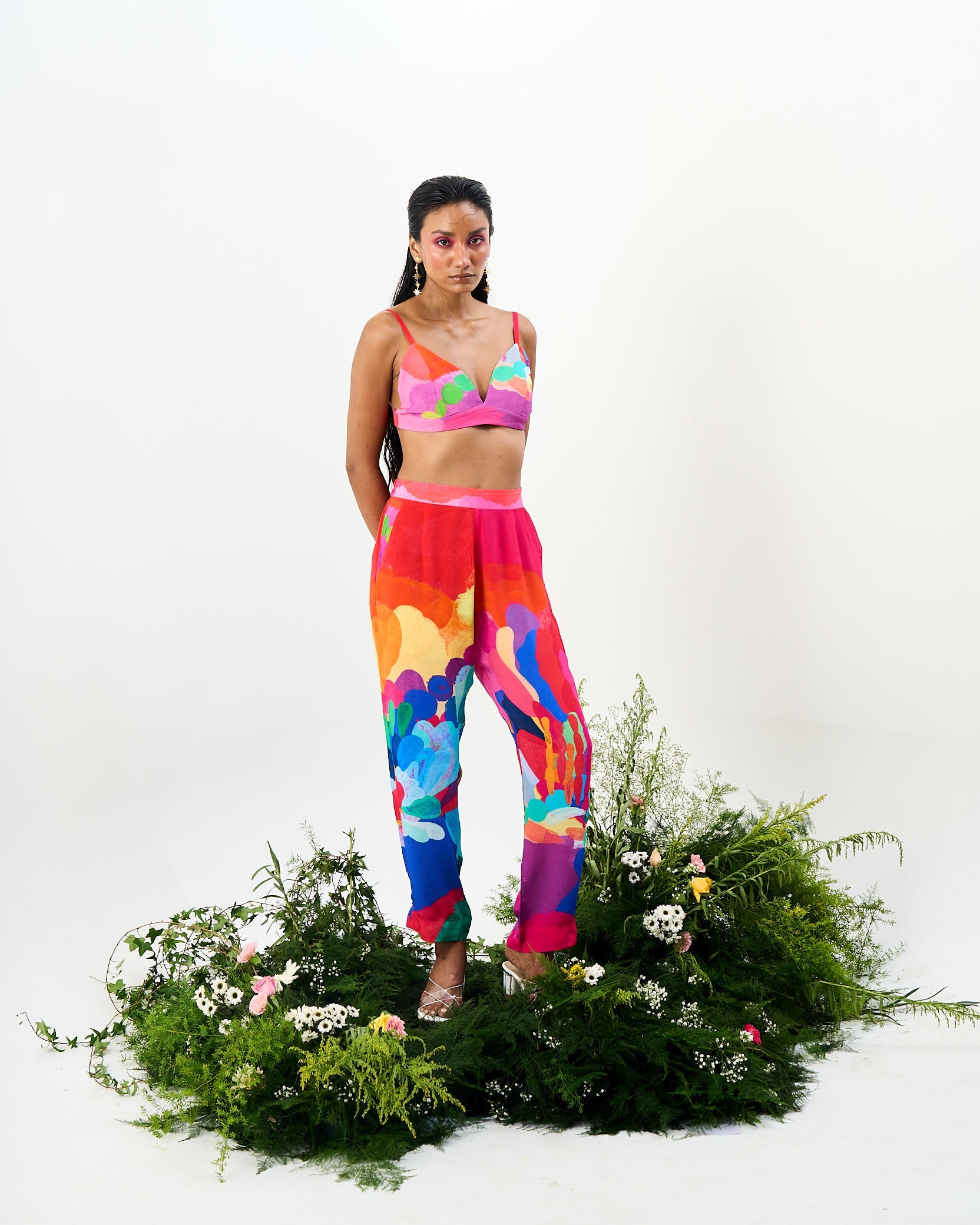 Our Indradhanush bralette and high-waisted pants is a colourful watercolour painting on the garment. The vibrant colours and playful design make it perfect for a day out on the beach with friends, a summer party or a festival. The soft and breathable fabric ensures that you stay comfortable all day long.