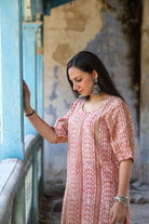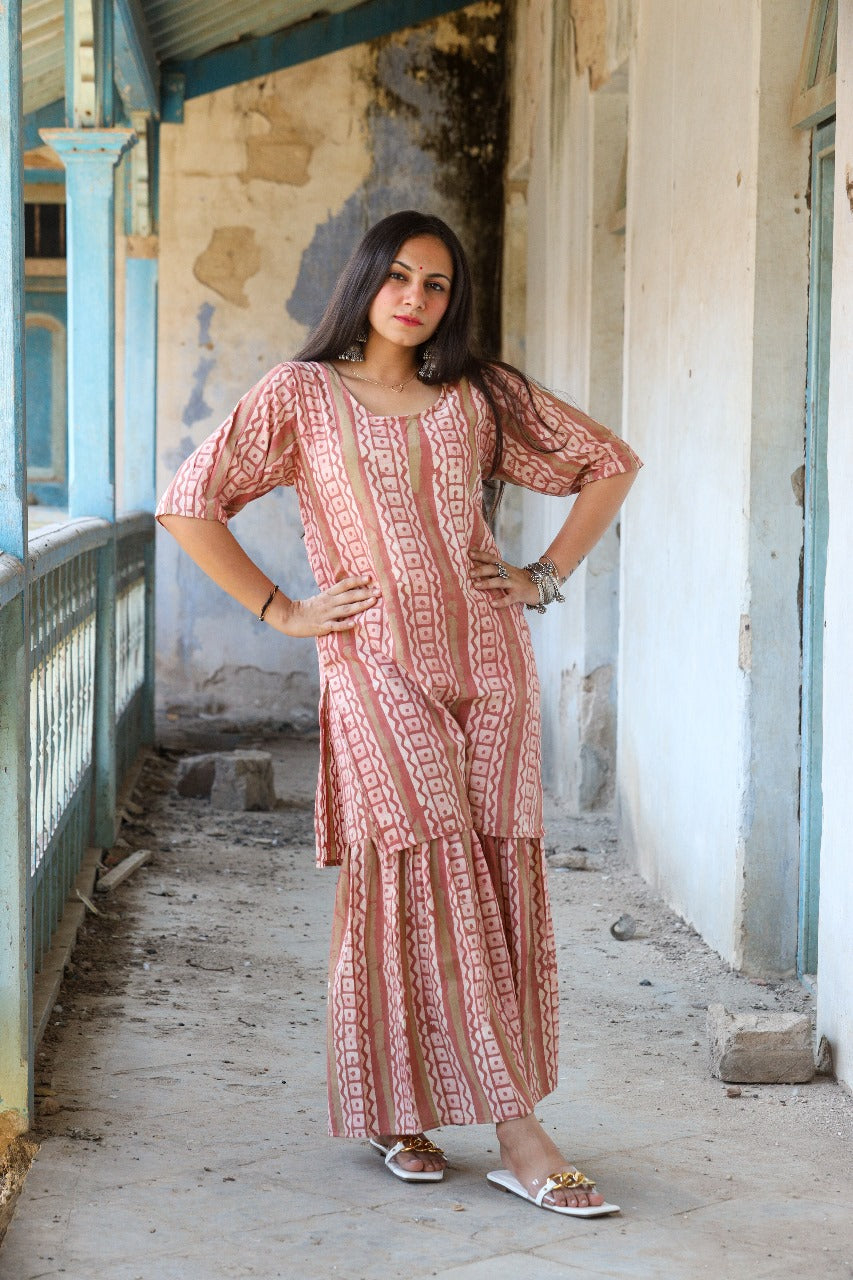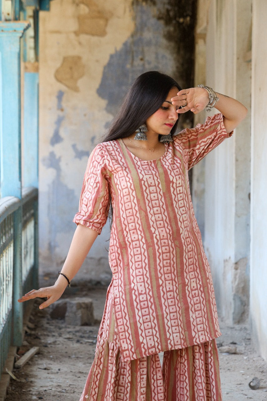 The perfect kurta and sharara set for all occasions. This kurta has a block printed look, which is perfect for formal events and casual occasions alike. The khadi material is soft and the corset keeps you comfortable every weather.