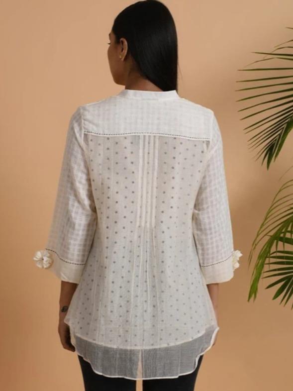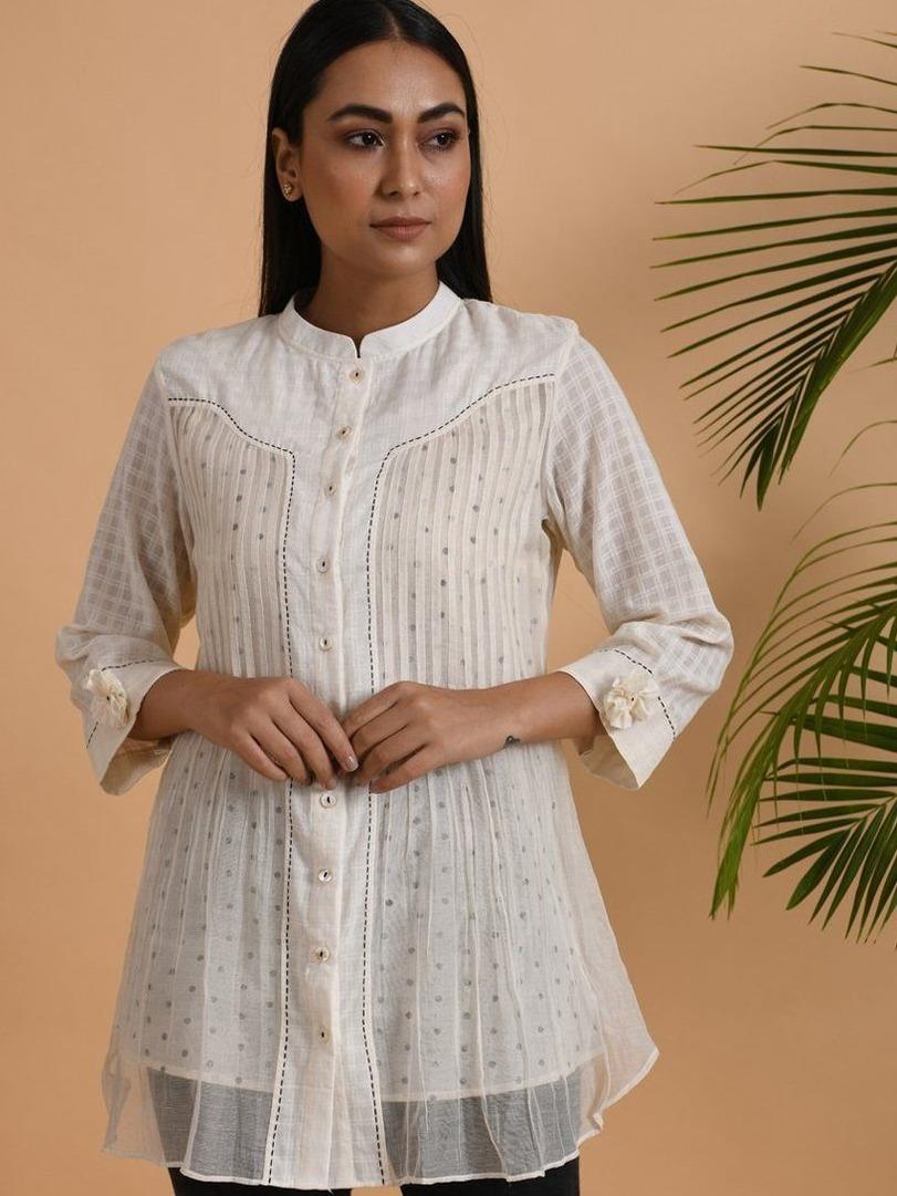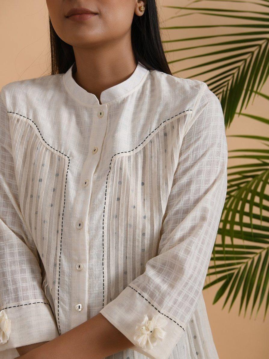 A chanderi and khadi pintuck shirt with front placket, 3/4th sleeves, comes with a soft cotton matching slip
