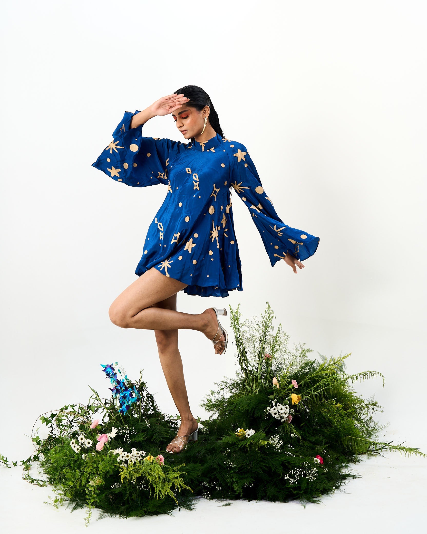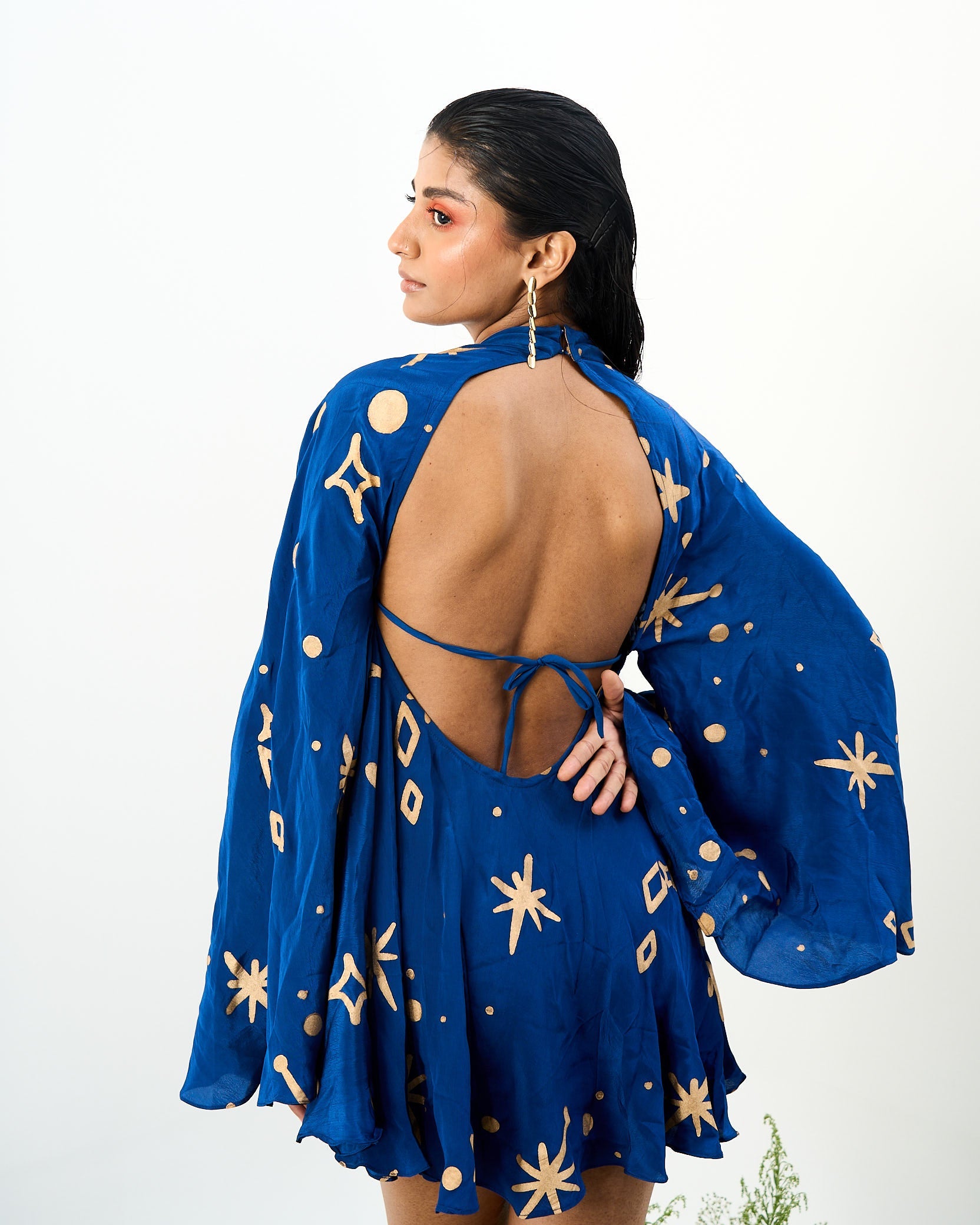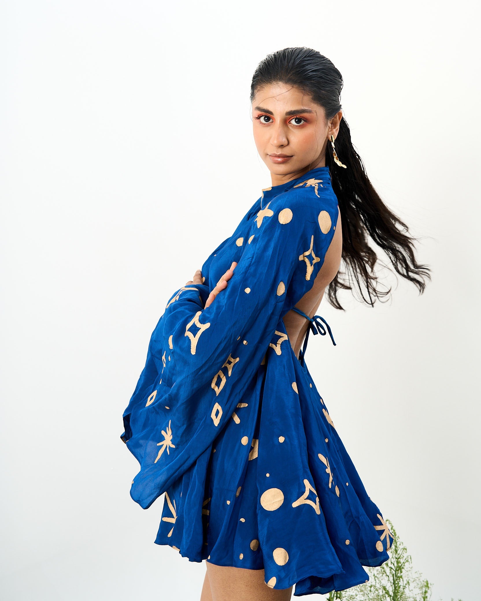 The Jaadui dress features a deep blue High Neck hand block printed gold stars Swing Dress with Backless Detail. The dress is adorned with gold block printed stars, perfect for the mystical and magical souls. The swing dress is a statement piece that will make you feel like a star in your own fairytale.