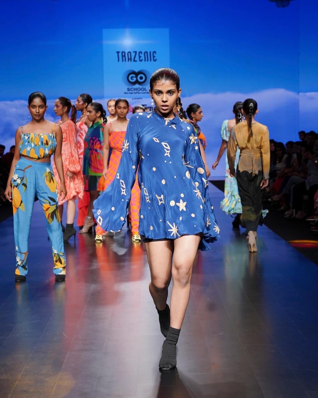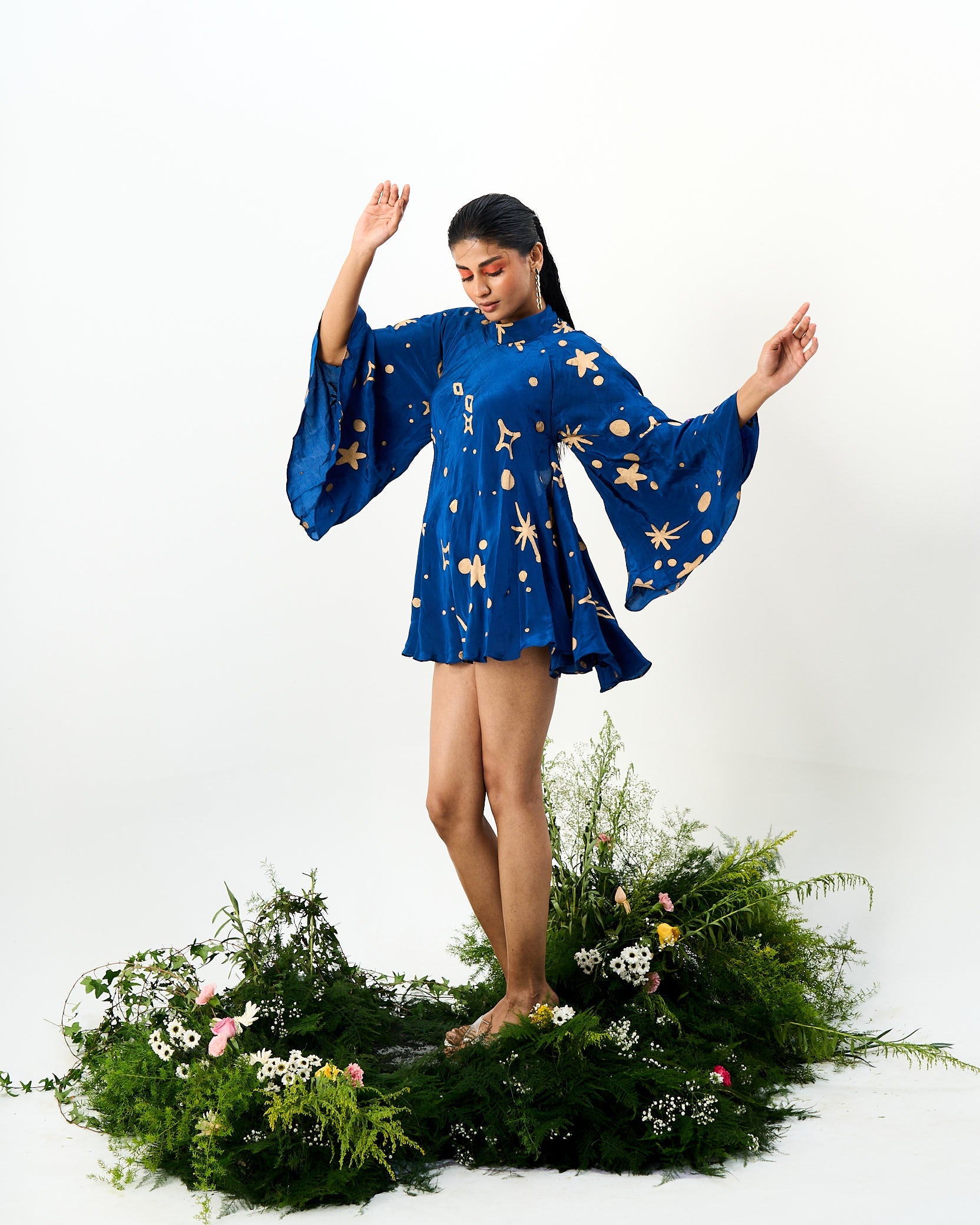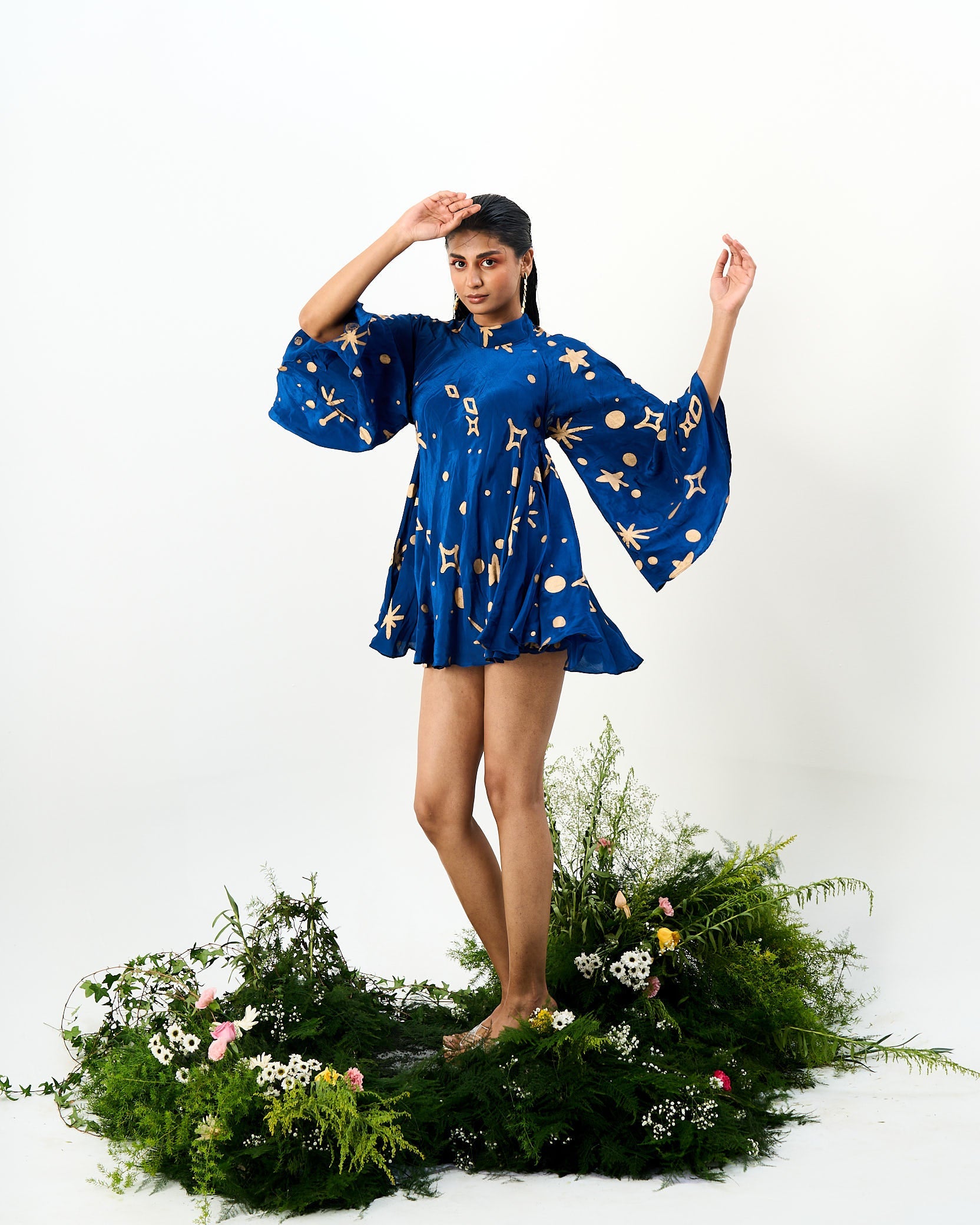 The Jaadui dress features a deep blue High Neck hand block printed gold stars Swing Dress with Backless Detail. The dress is adorned with gold block printed stars, perfect for the mystical and magical souls. The swing dress is a statement piece that will make you feel like a star in your own fairytale.
