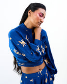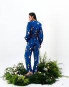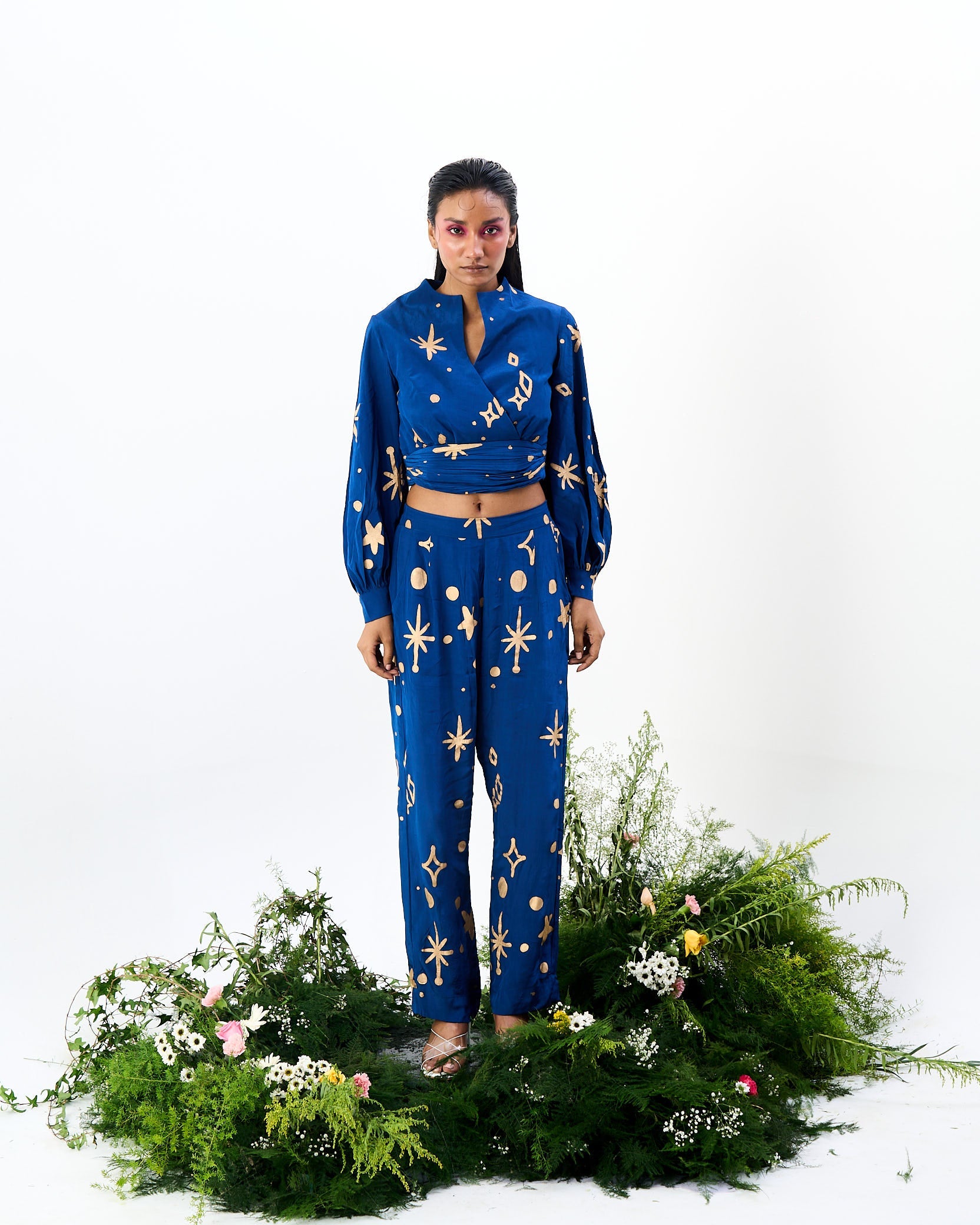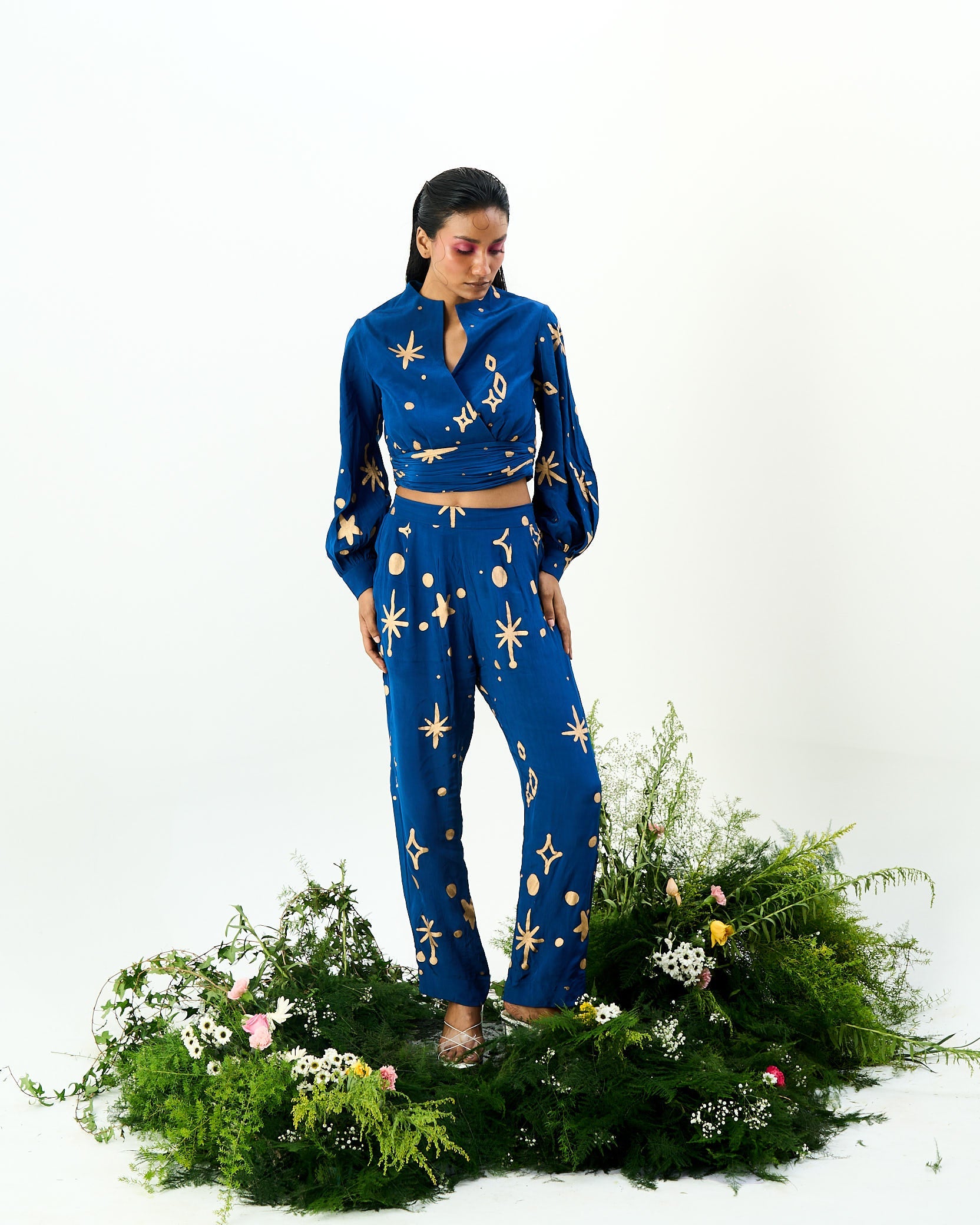 The Jaadui co-ord features a deep blue High Neck blouse with high waist pants. The co-ord is adorned with gold block printed stars, perfect for the mystical and magical souls. The co-ord is a statement piece that will make you feel like a star in your own fairytale.
