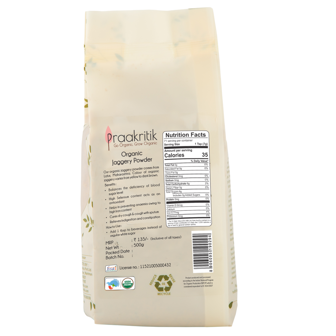 - It is sourced from Organic sugarcane farms in Latur, Maharashtra.