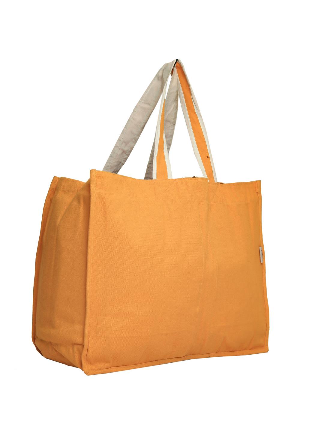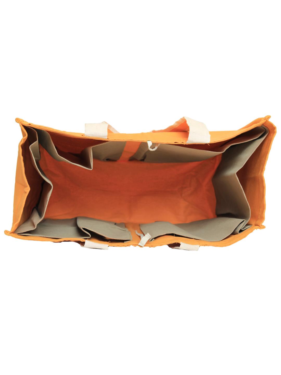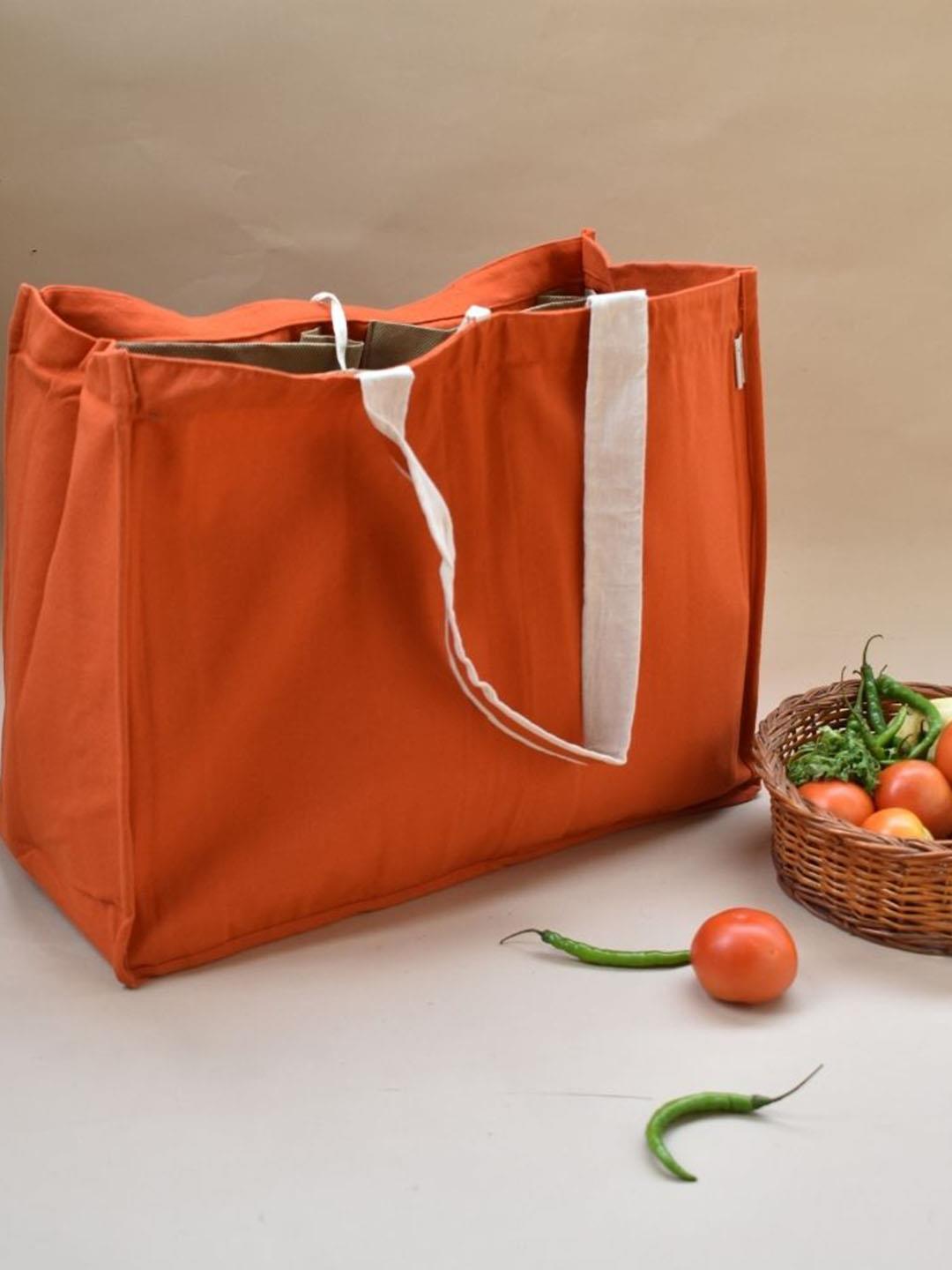 Spacious vegetable bag made of orange color canvas cloth. The bag has pockets inside to store different vegetables. It has small cotton ties on top to close the bag after your purchases are made. This bag can hold 8-10 kgs of vegetables and is fully washable.