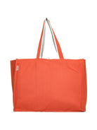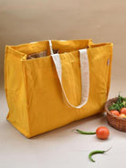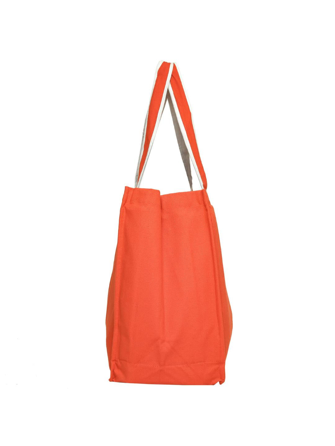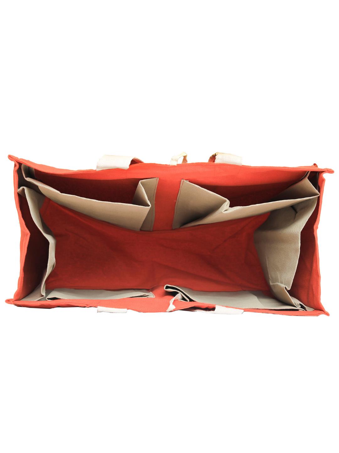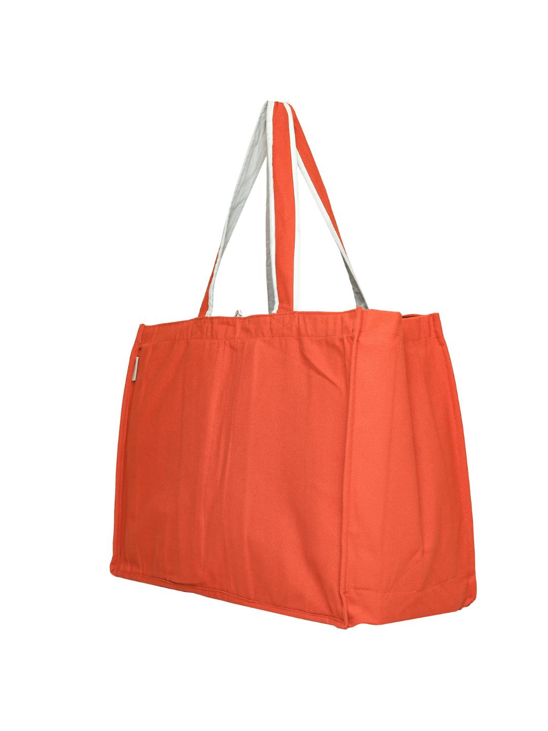 Spacious vegetable bag made of orange color canvas cloth. The bag has pockets inside to store different vegetables. It has small cotton ties on top to close the bag after your purchases are made. This bag can hold 8-10 kgs of vegetables and is fully washable.