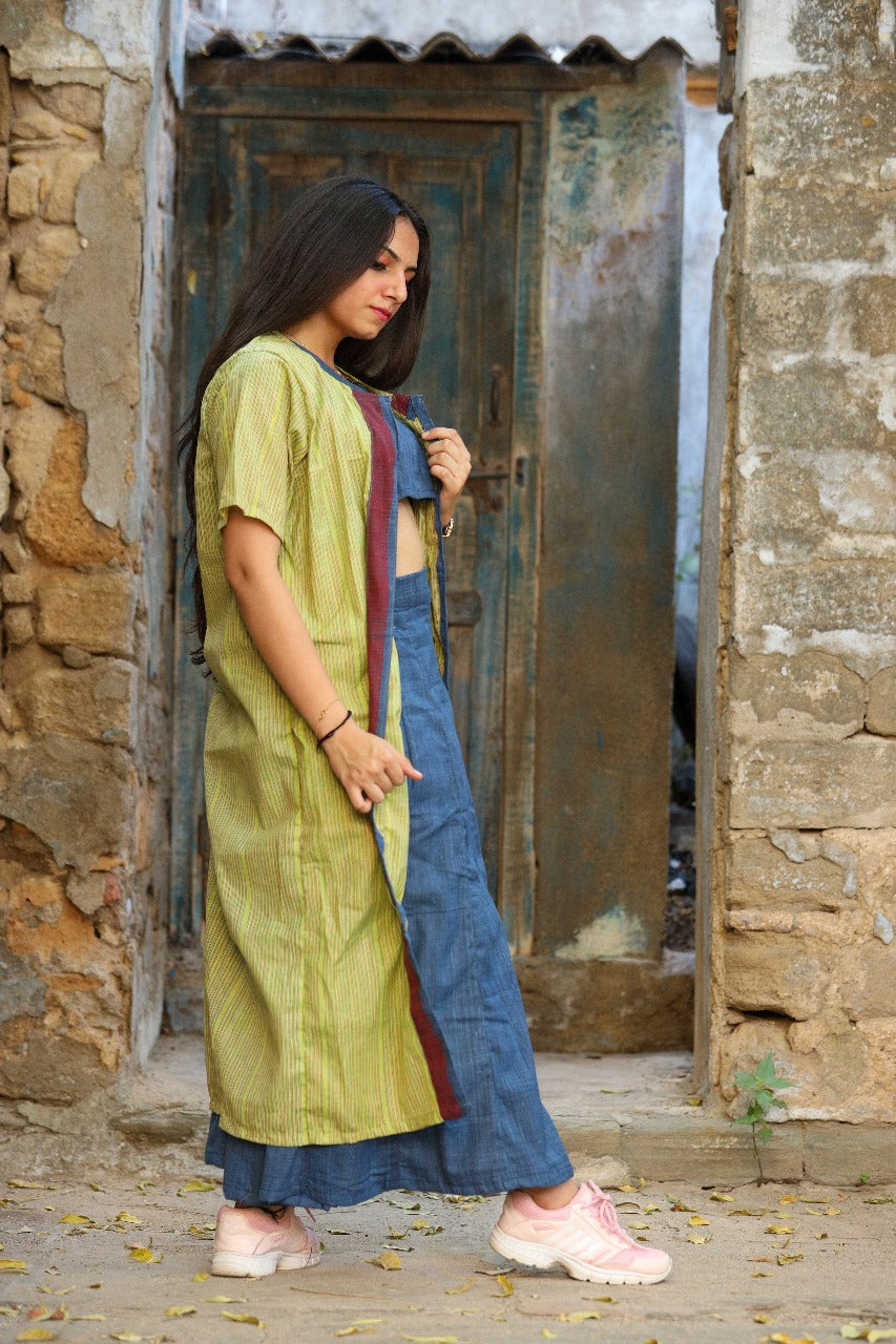 This Khadi crop top-style jacket and skirt is the perfect complement to any outfit. Made from a soft, lightweight material with a breathable weave which makes it comfortable to wear, this versatile piece can be worn in a variety of styles with bottoms of your choice.