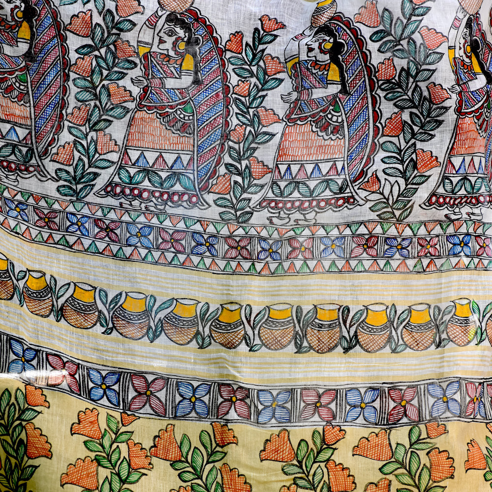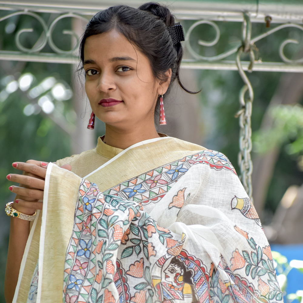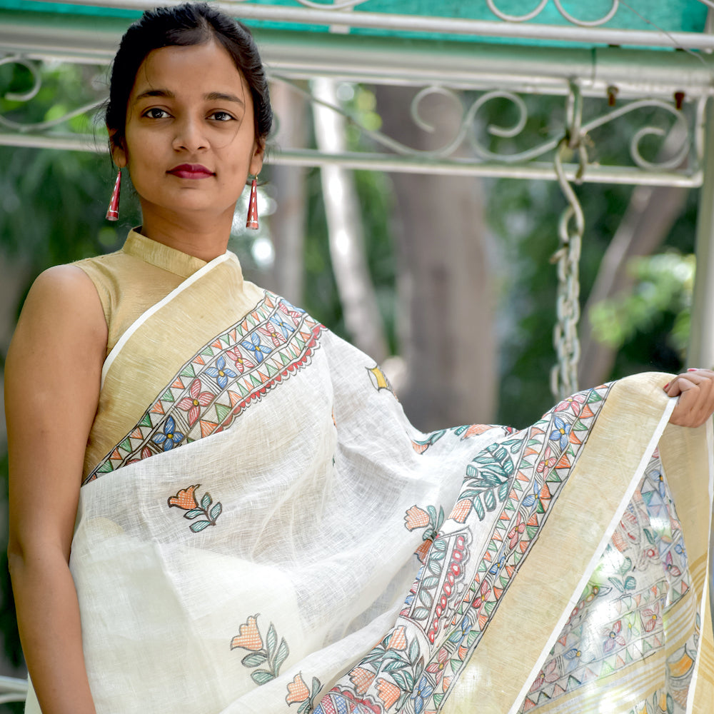 Madhubani Hand-Painted Linen Saree