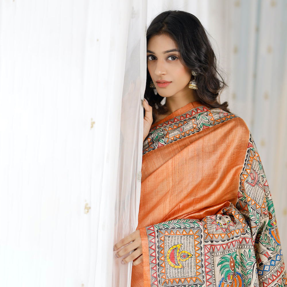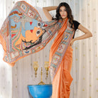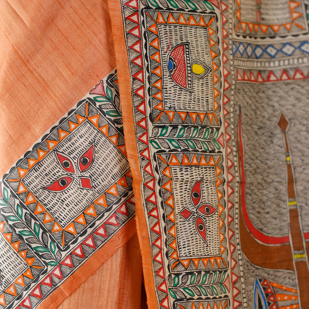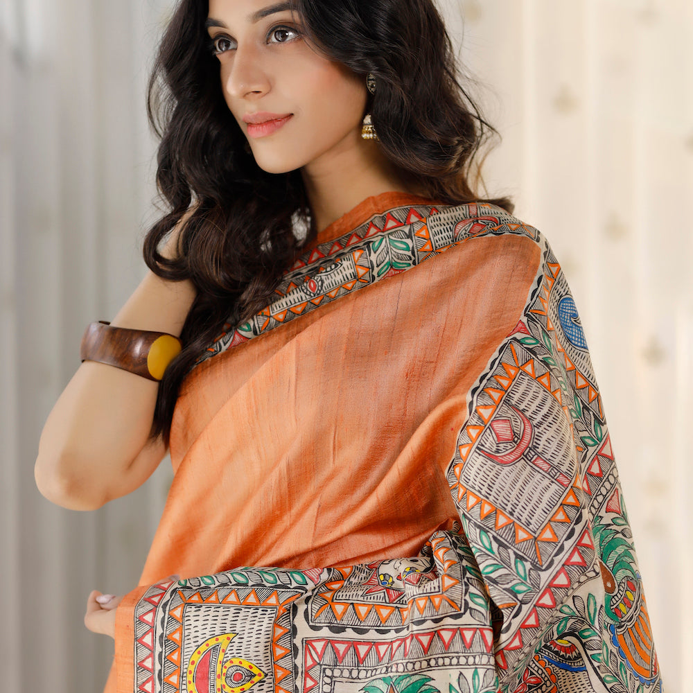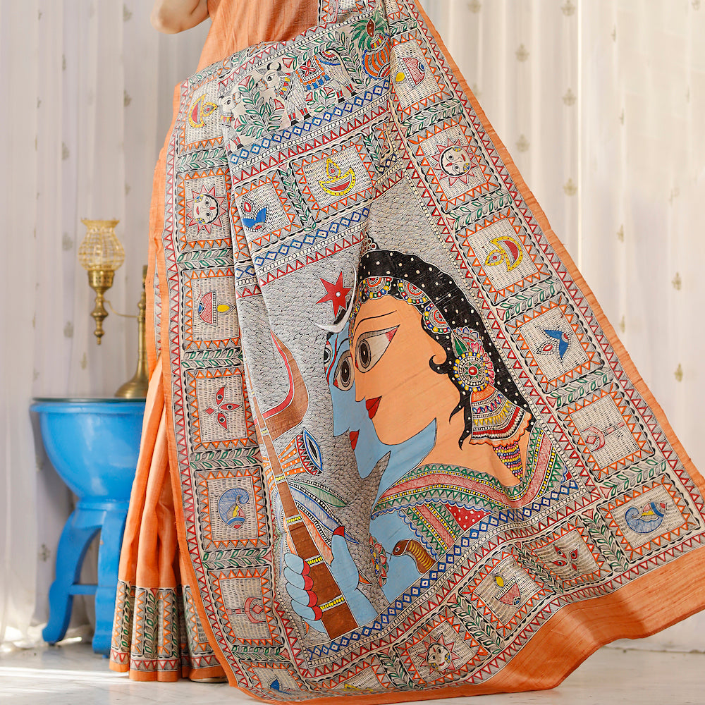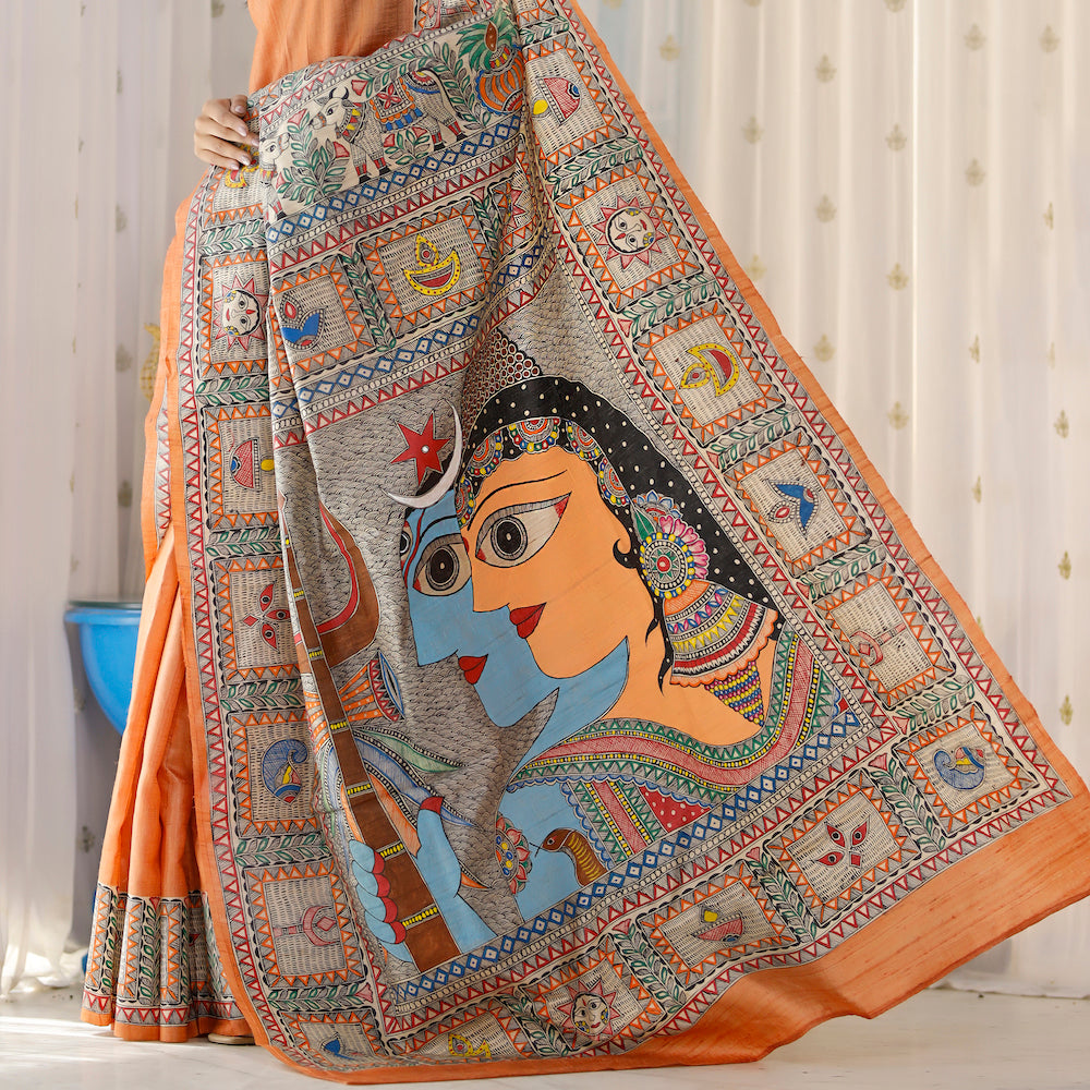 Madhubani Hand-Painted Shiv Parvati Tussar Silk Saree