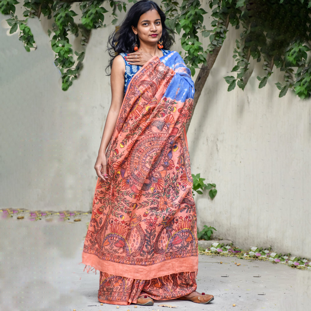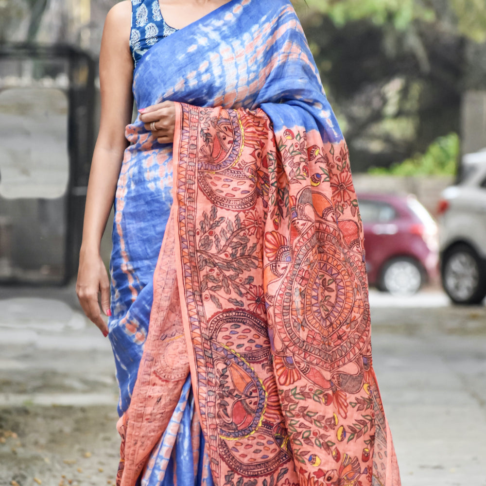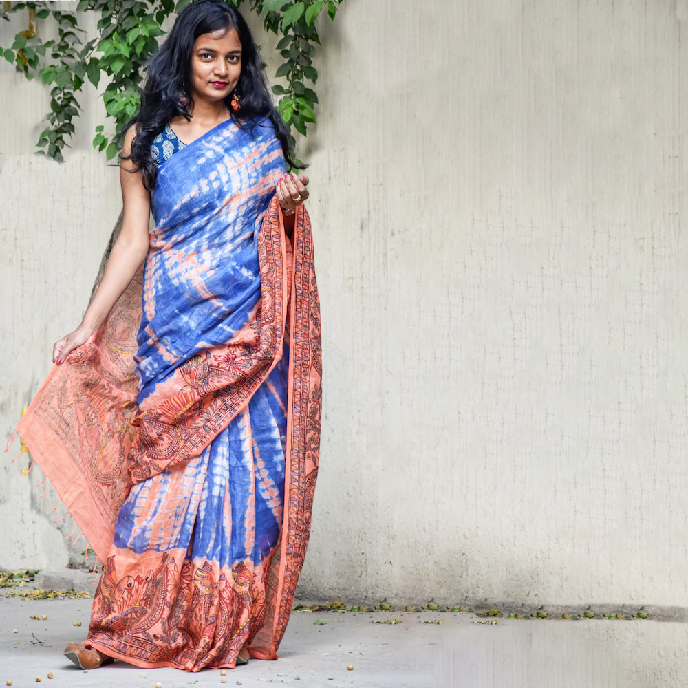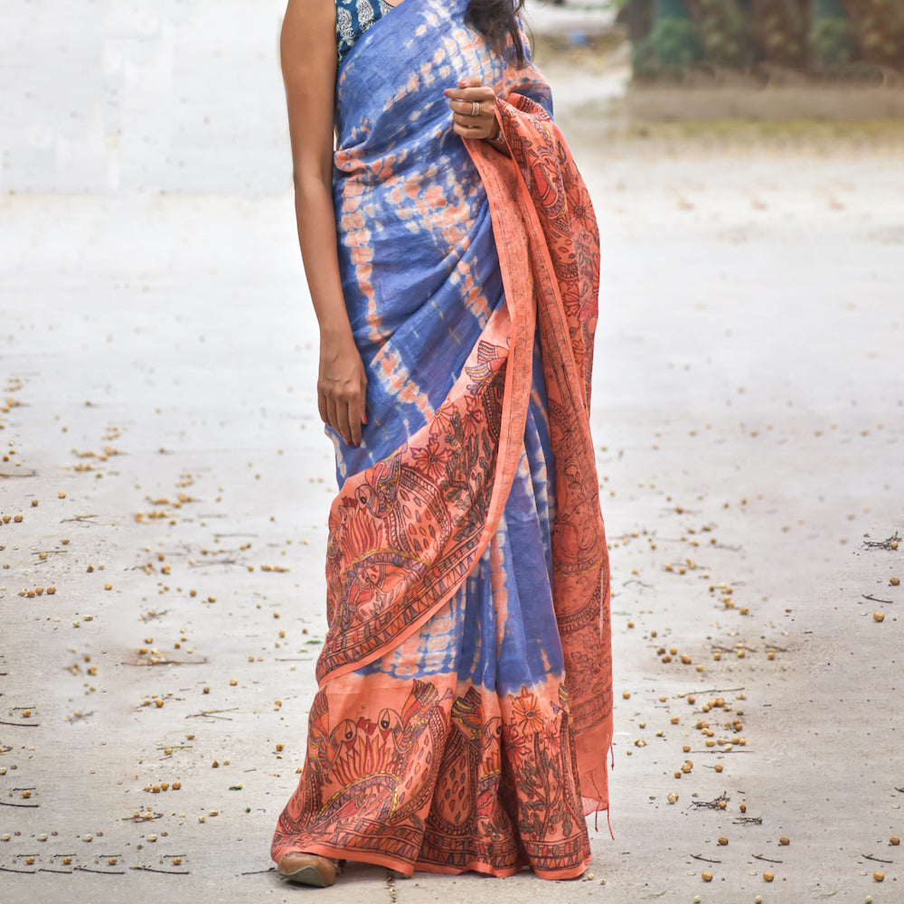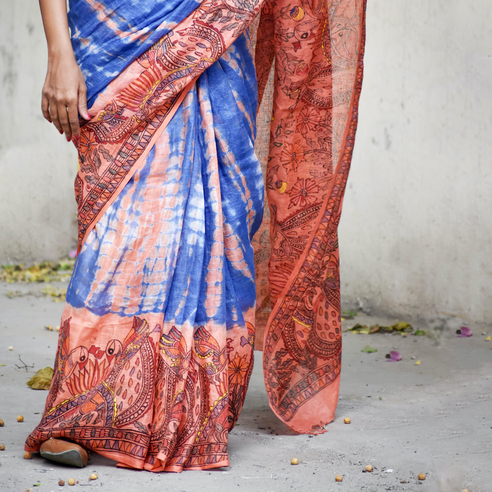 Madhubani Shibori Hand-Painted "Serene" Linen Saree