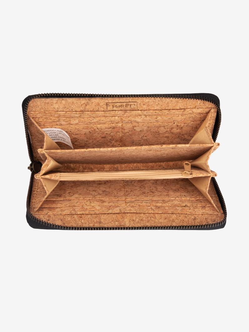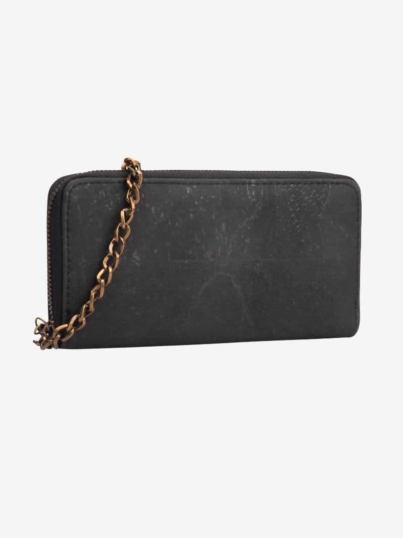 The Midnight Tide: Women’s Cork Wallet is designed to be both practical and visually striking. Its deep black colour reflects the depths of the ocean, evoking a sense of intrigue and allure. The smooth texture of the cork adds a touch of luxury to the wallet, elevating its overall appeal. To complete the look, the wallet features a sleek bronze chain accent adding a touch of elegance, sophistication and uniqueness to its design. The chain detail is carefully placed as the wrist strap attachment, creating a subtle yet eye-catching embellishment.