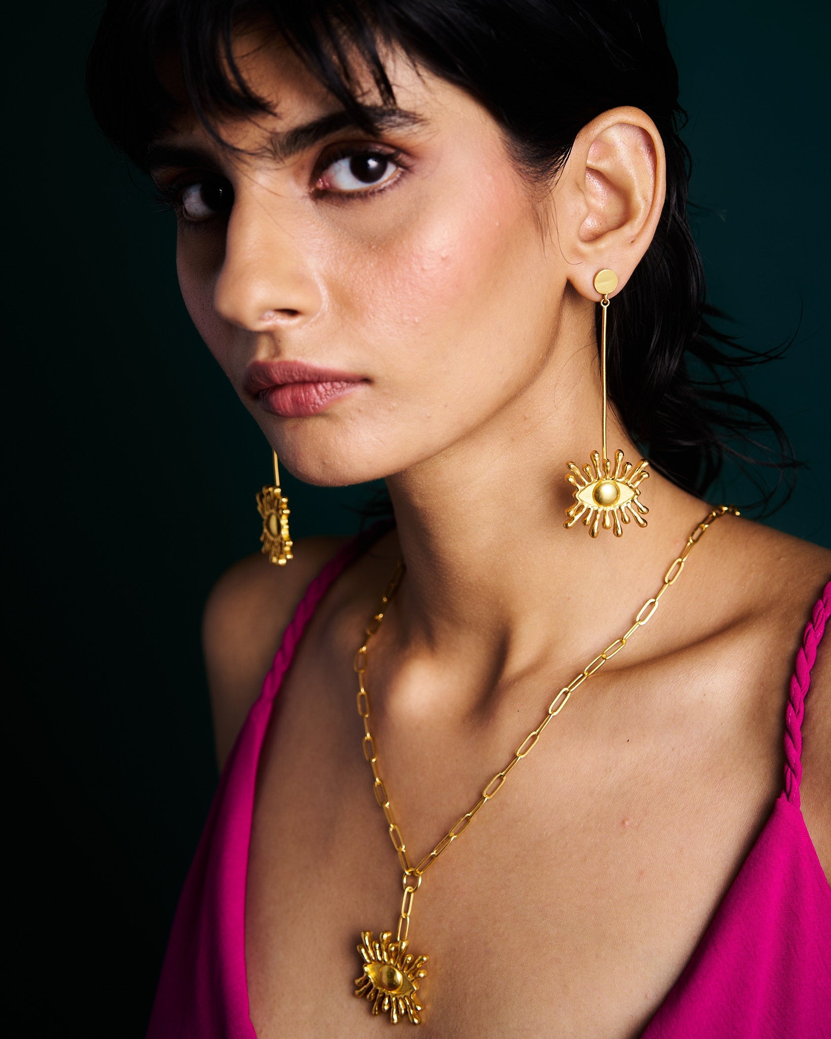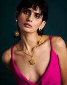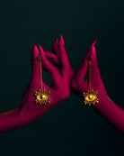 Unleash the power of protection with the Nazar Battu Earrings, featuring a large eye motif in 18 Karat Gold plating. As you wear these captivating earrings, you become the guardian of your own destiny, thwarting malevolent shadows with the talismanic allure of Shambhala.