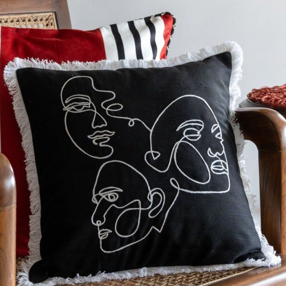 Unlock the allure of artistic expression with our Noir Expression Pillow. Hand-embroidered abstract faces on a velvety black canvas invite intrigue, while a delicate fringe adds a touch of whimsy. Elevate your decor with this unique masterpiece, where art meets comfort and quirkiness in every detail.