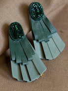 The emerald fringe earrings have an embroidered stud with a dark greem fringe, layered on a sage fringe. We are redefining the word new by upcycling leather off-cuts to give them a second purpose and each product a new skin.