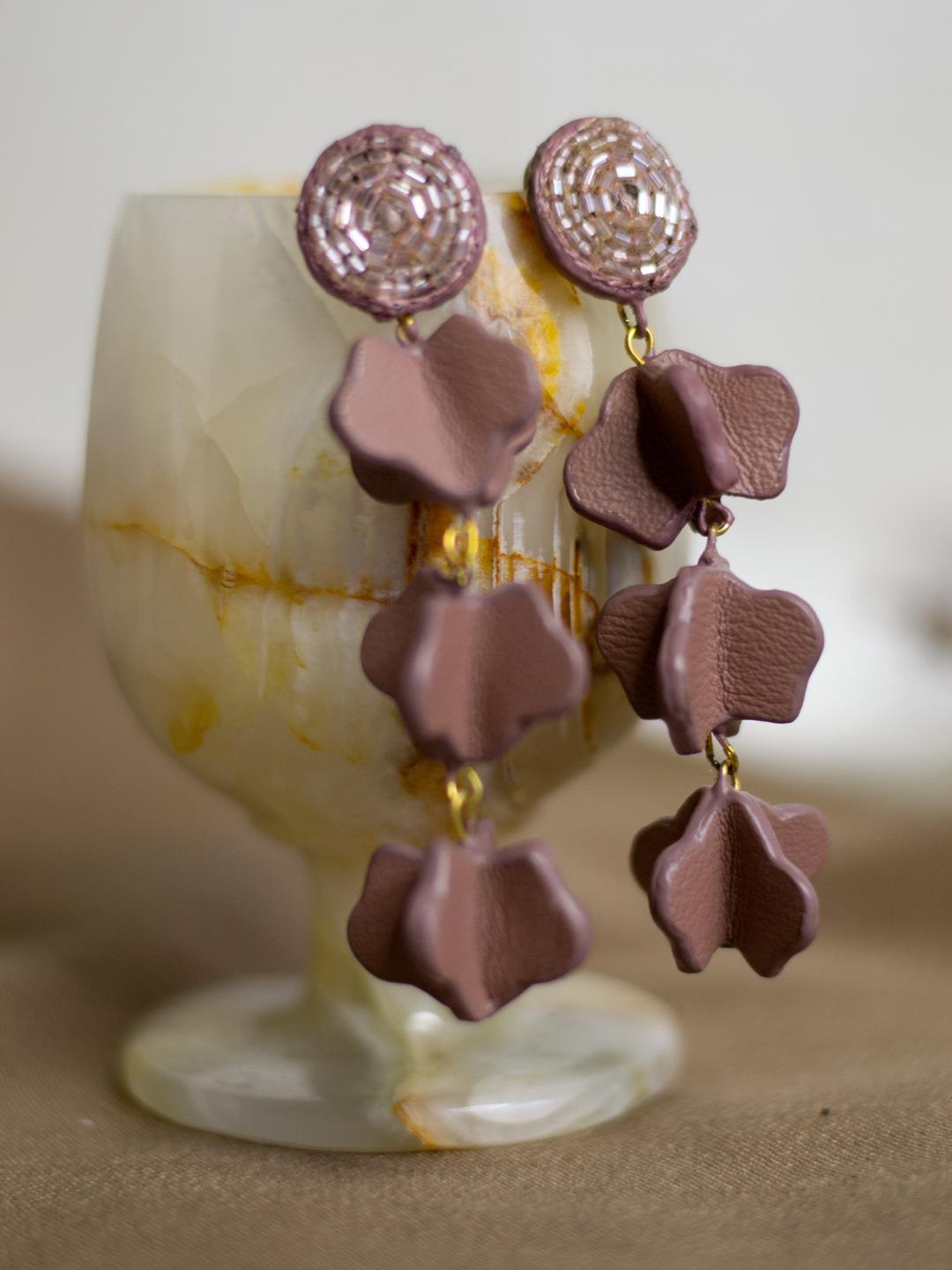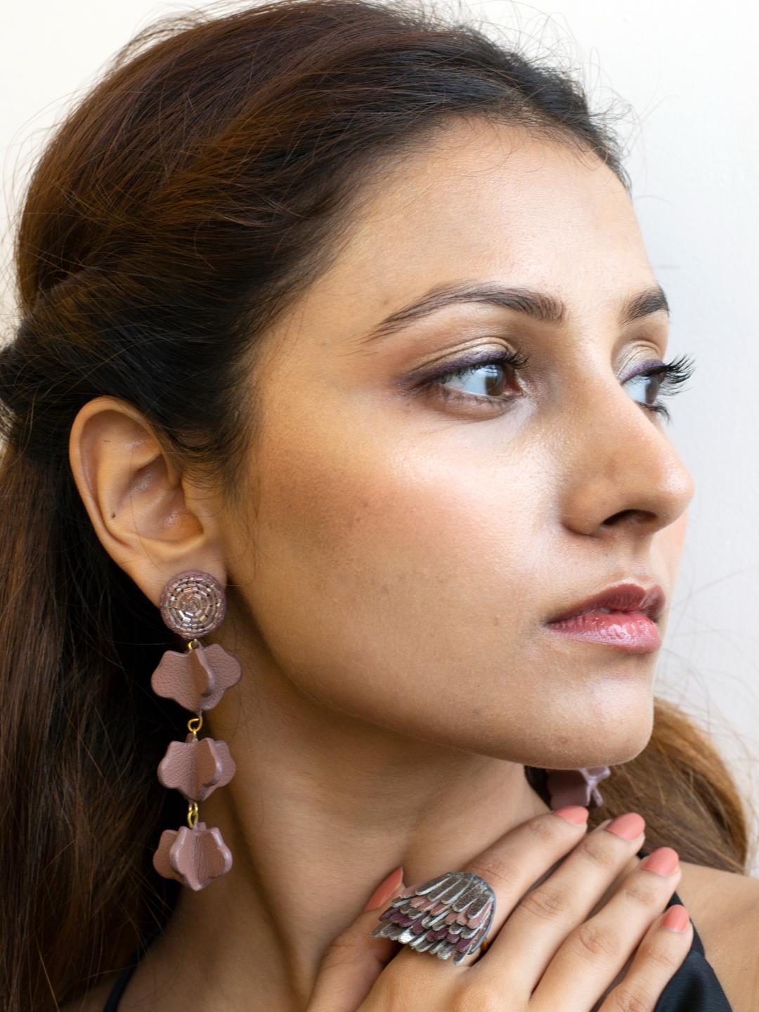 The floral stud earrings have an embroidered stud top with leather flowers dangling down! We are redefining the word new by upcycling leather off-cuts to give them a second purpose and each product a new skin.